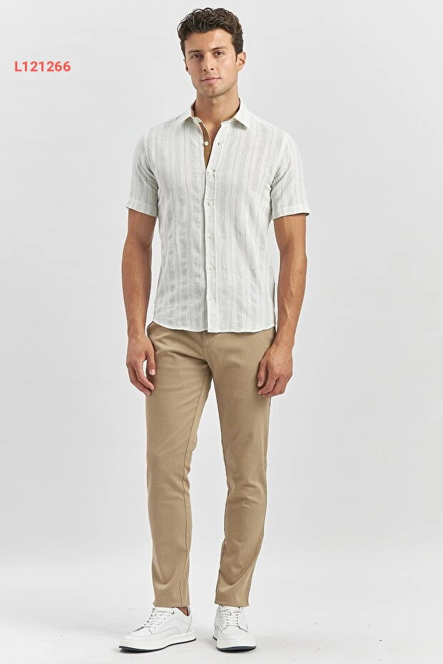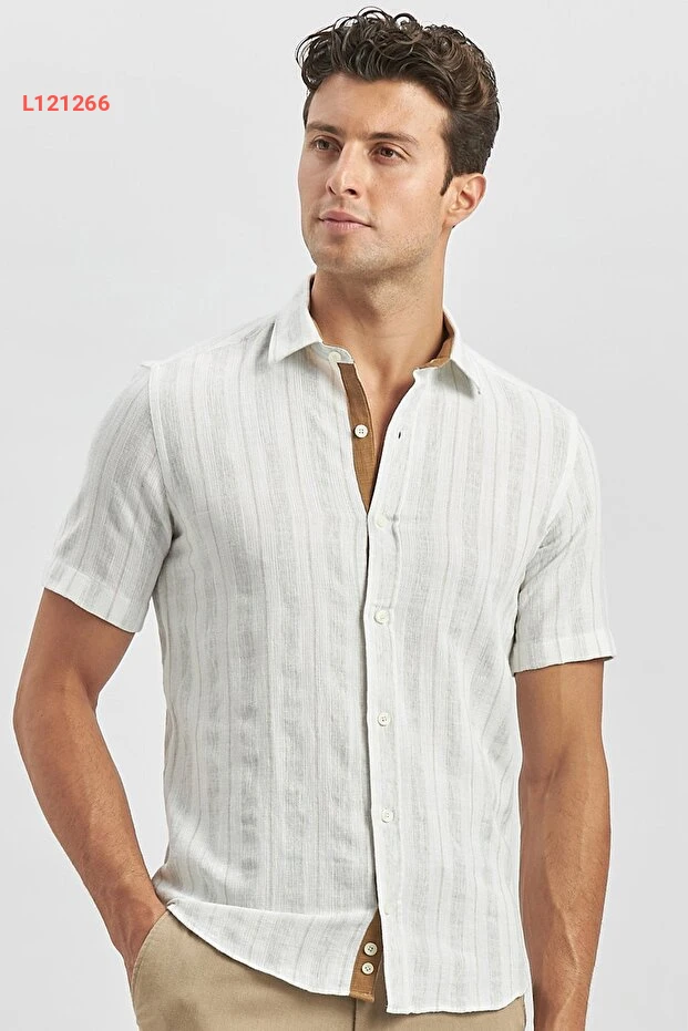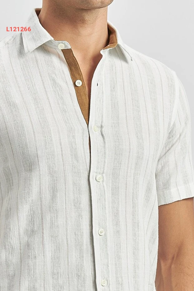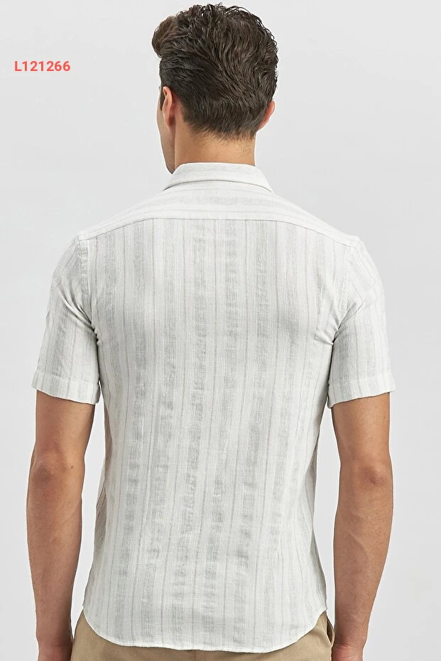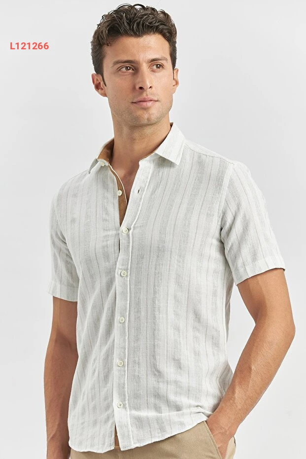 قميص كاجوال قصير الأكمام مخطط باللون البيج - تصميم ضيق من القطن
