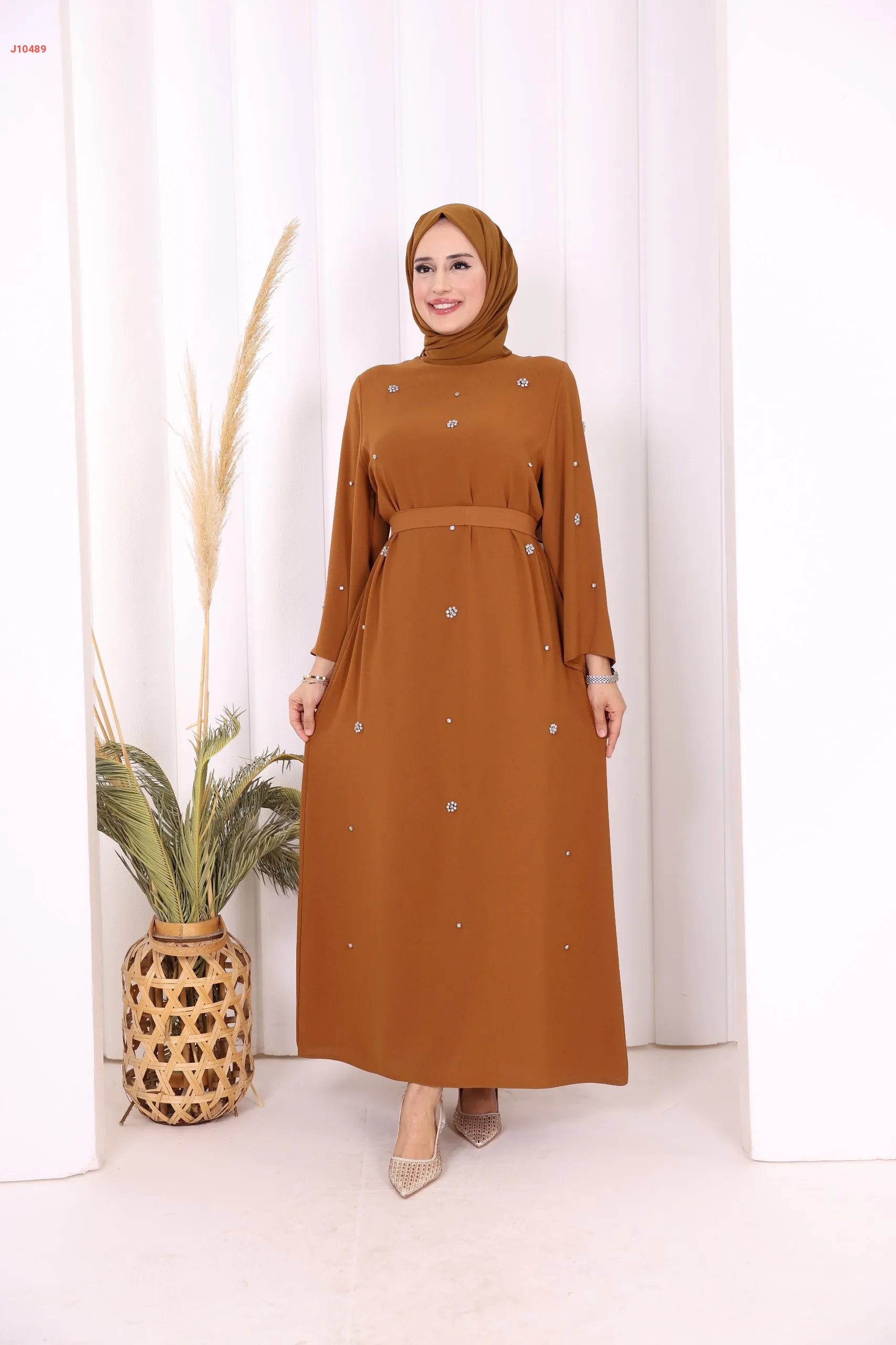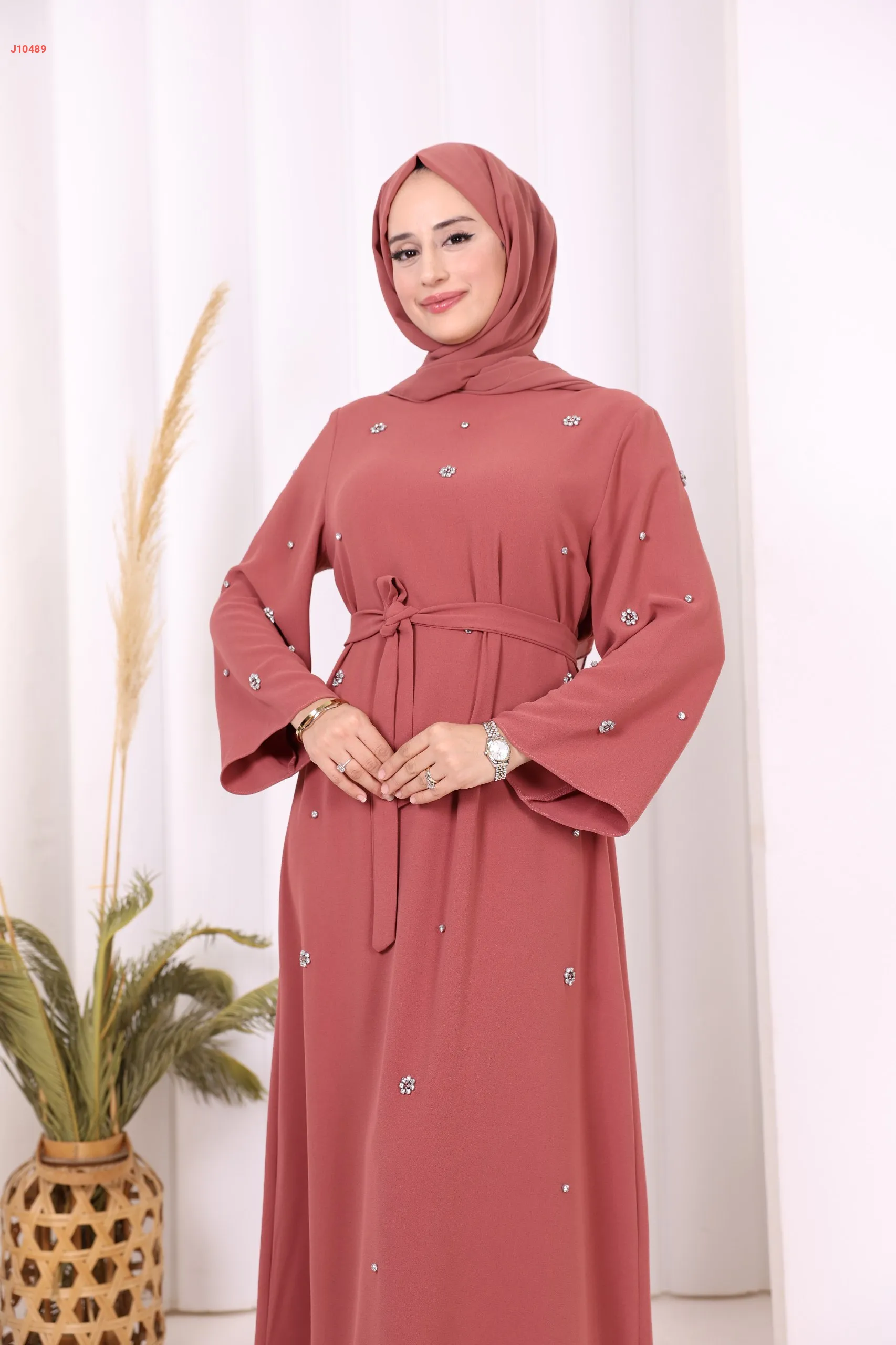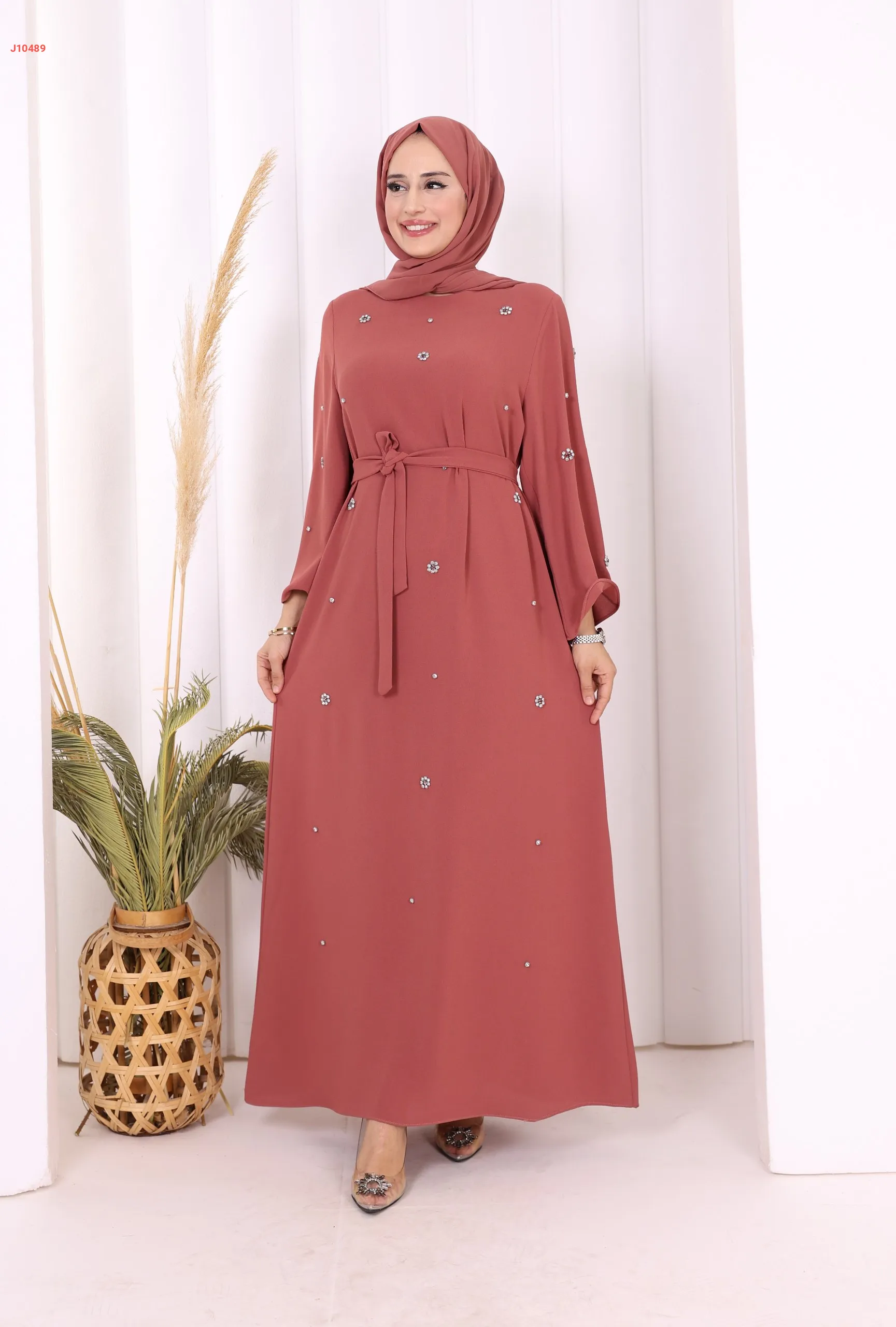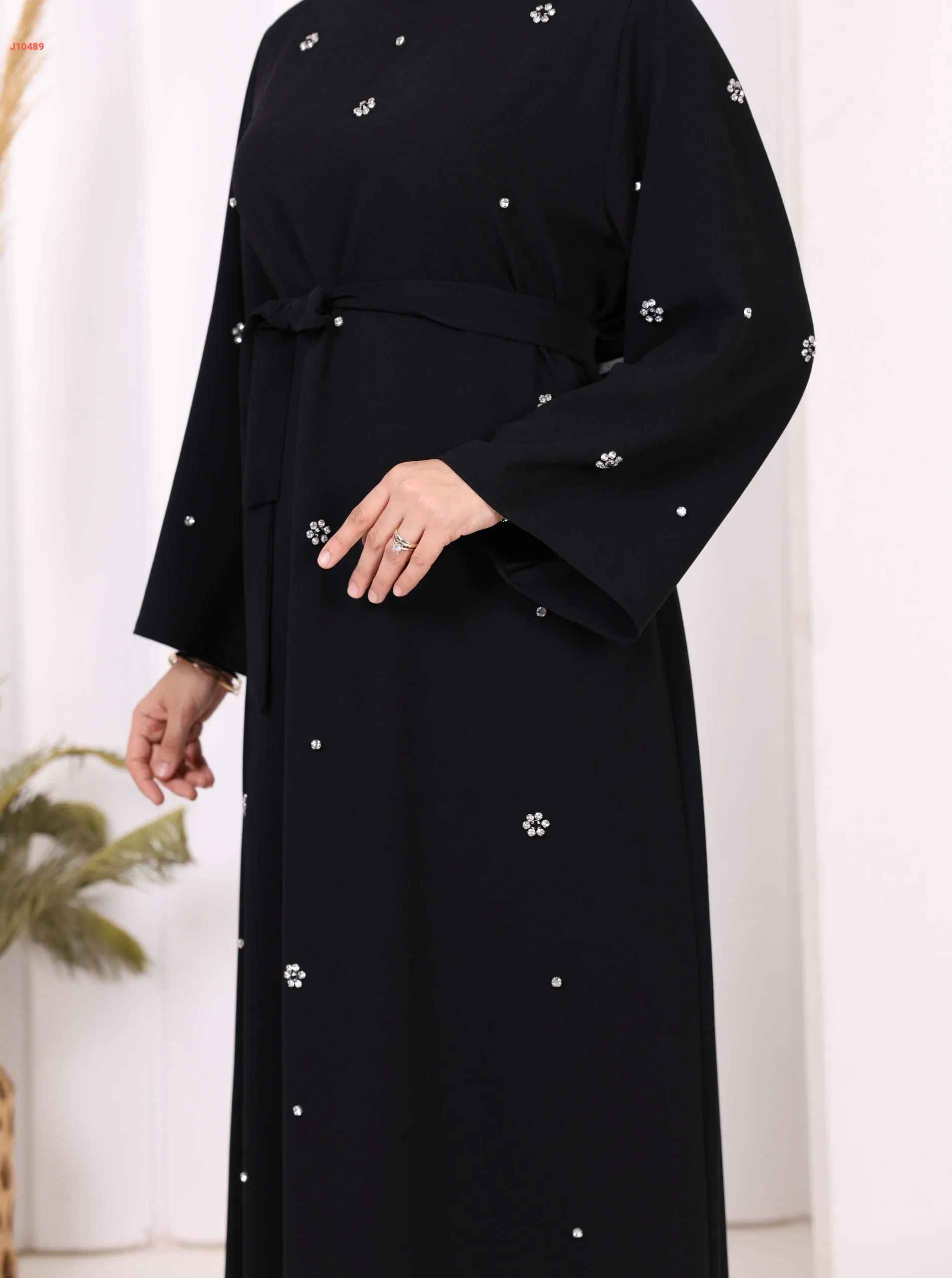 فستان سادة ، مزين بالكريستال، مع حزام
