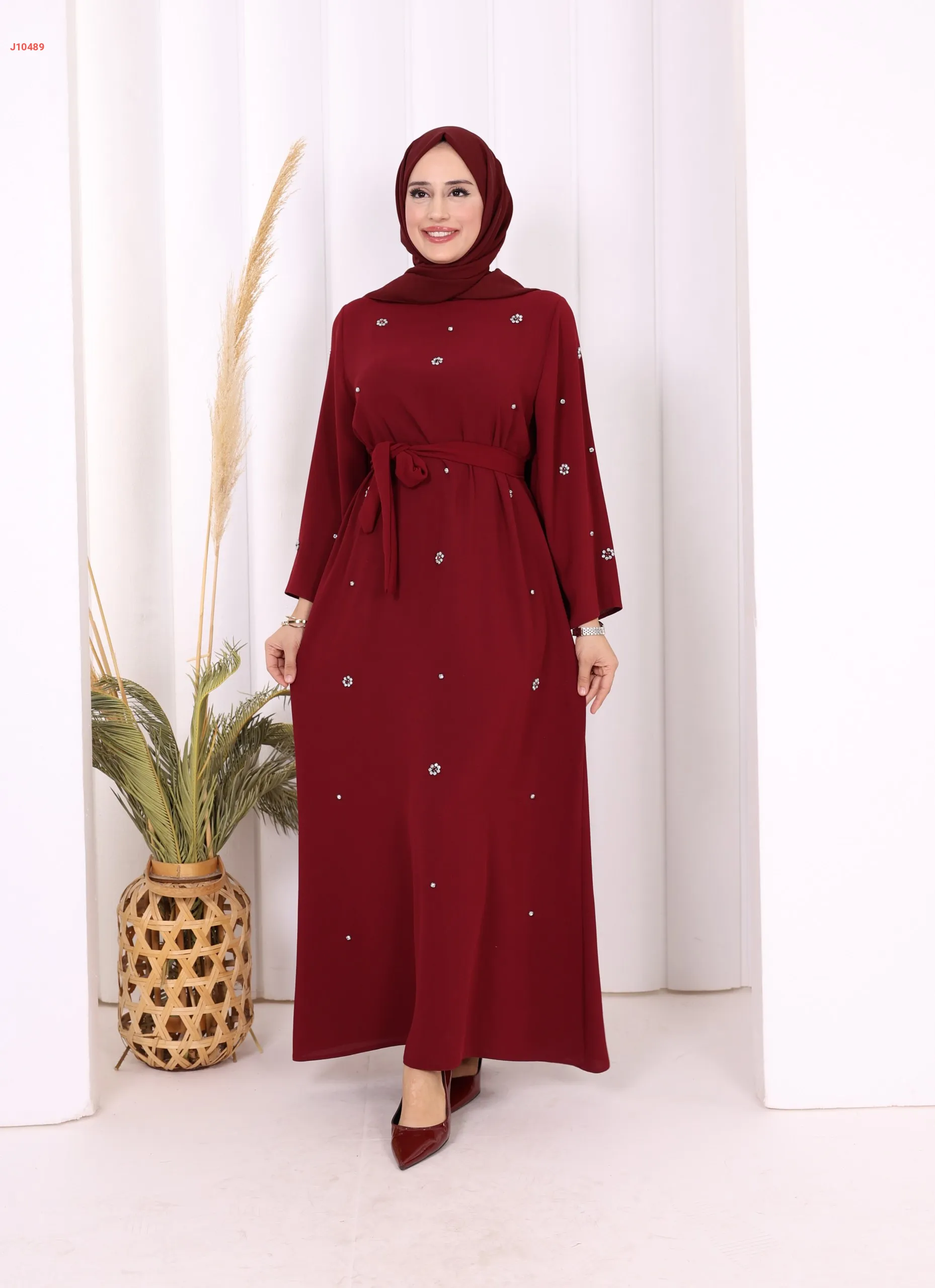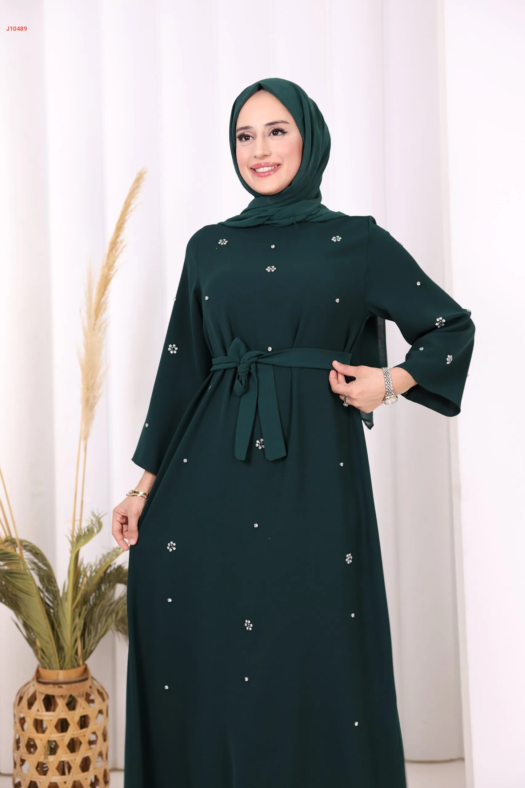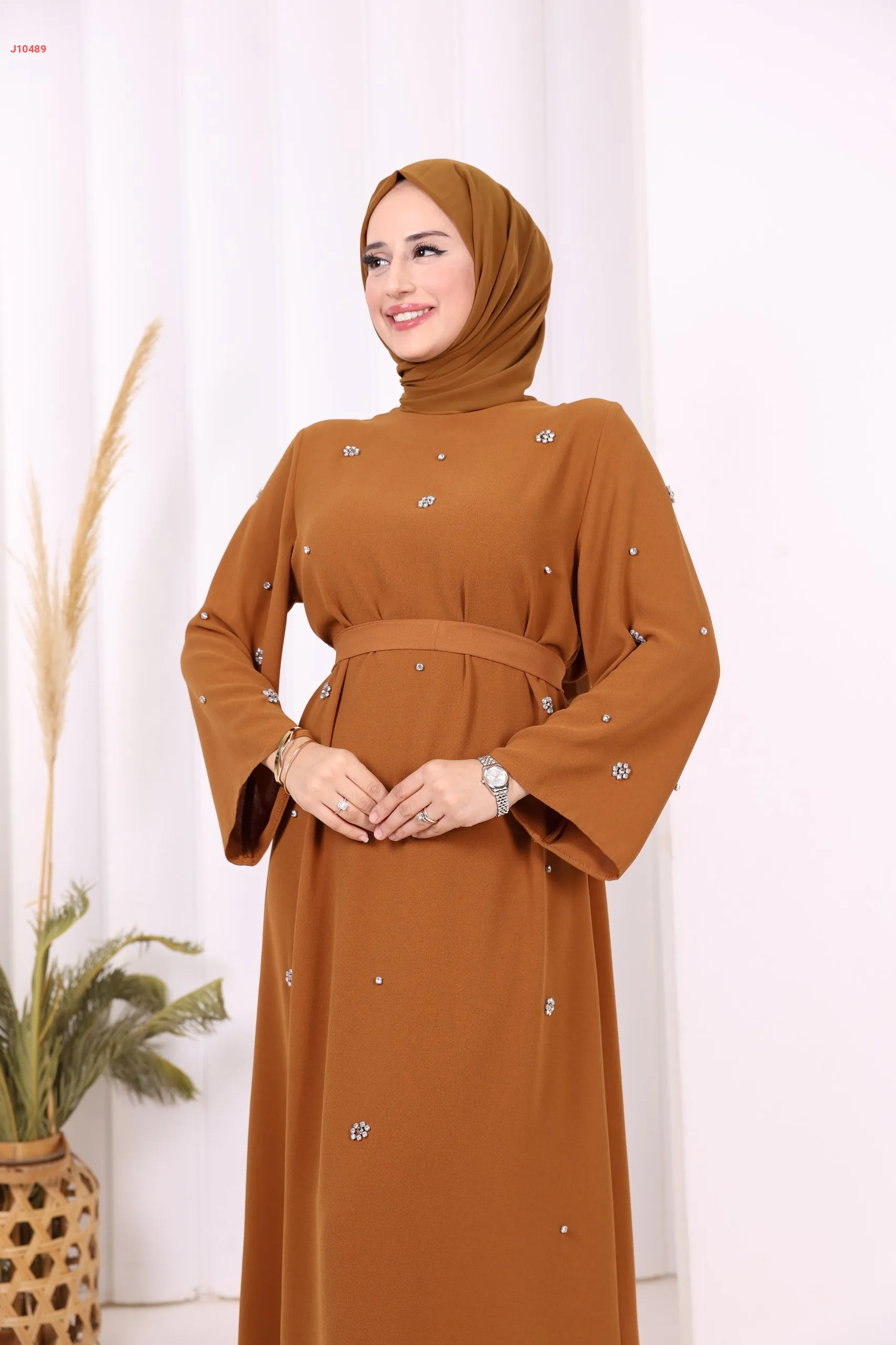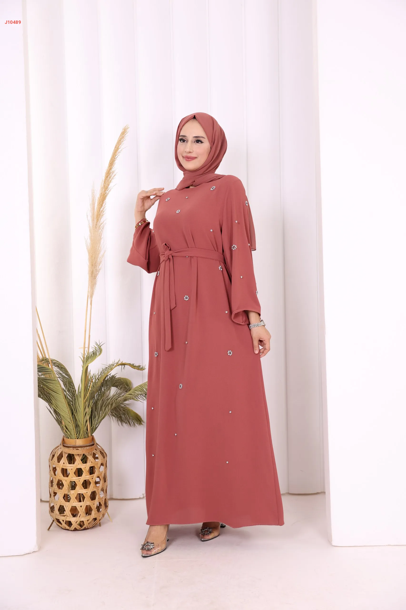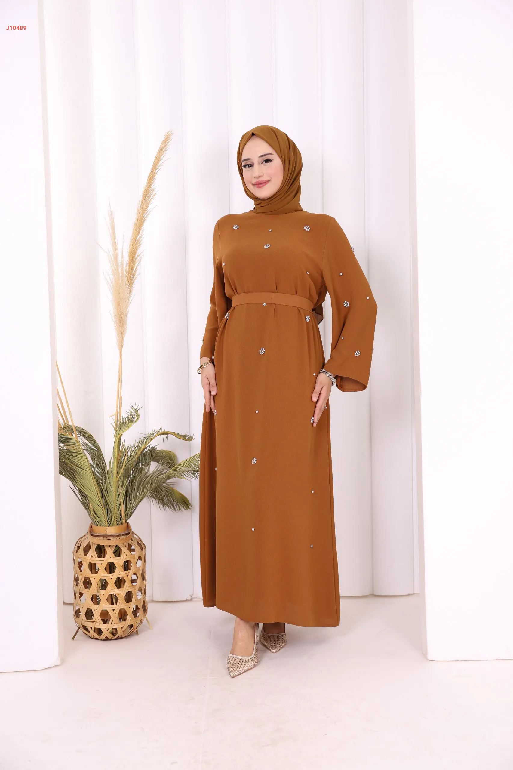 فستان سادة ، مزين بالكريستال، مع حزام