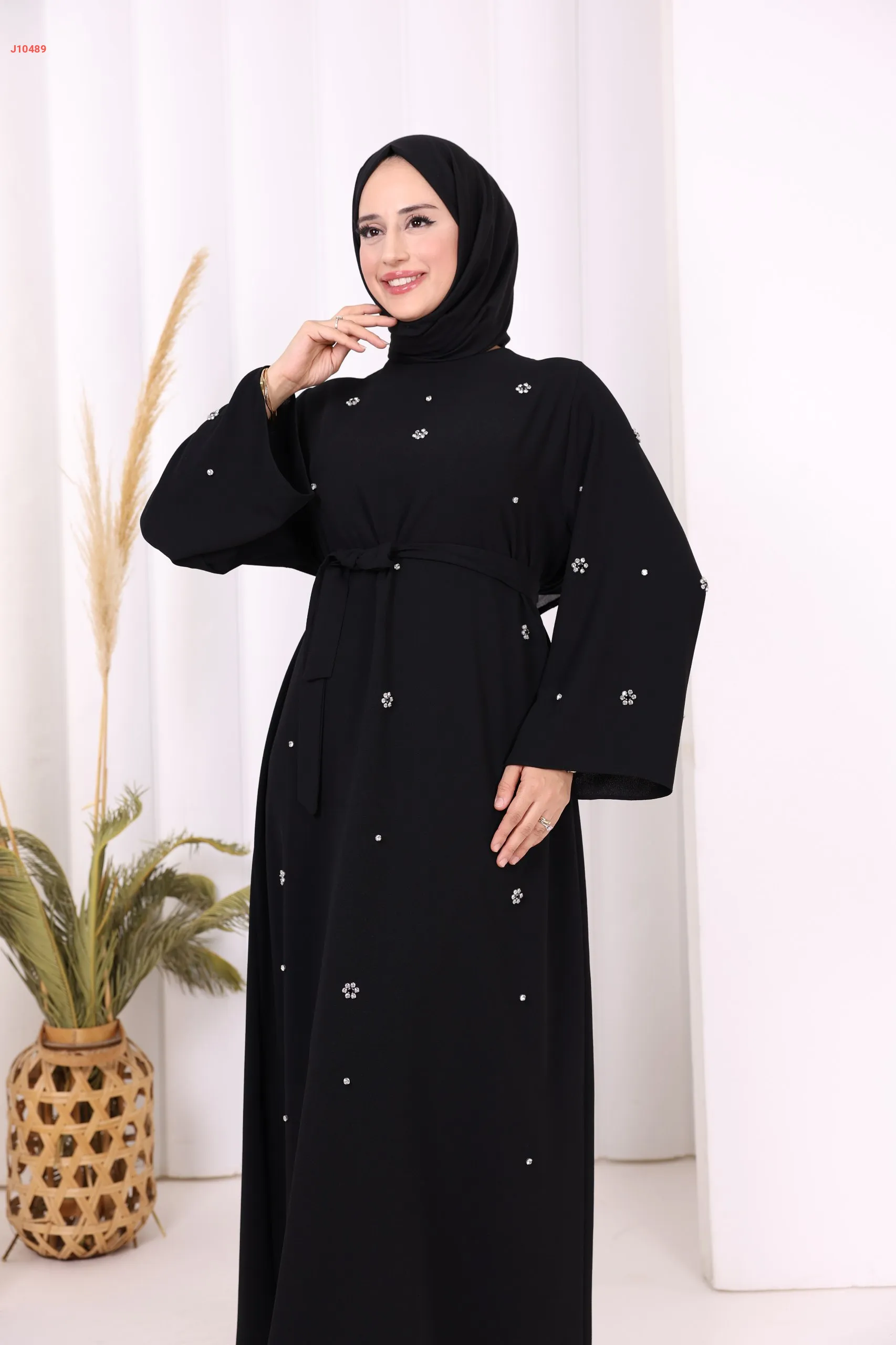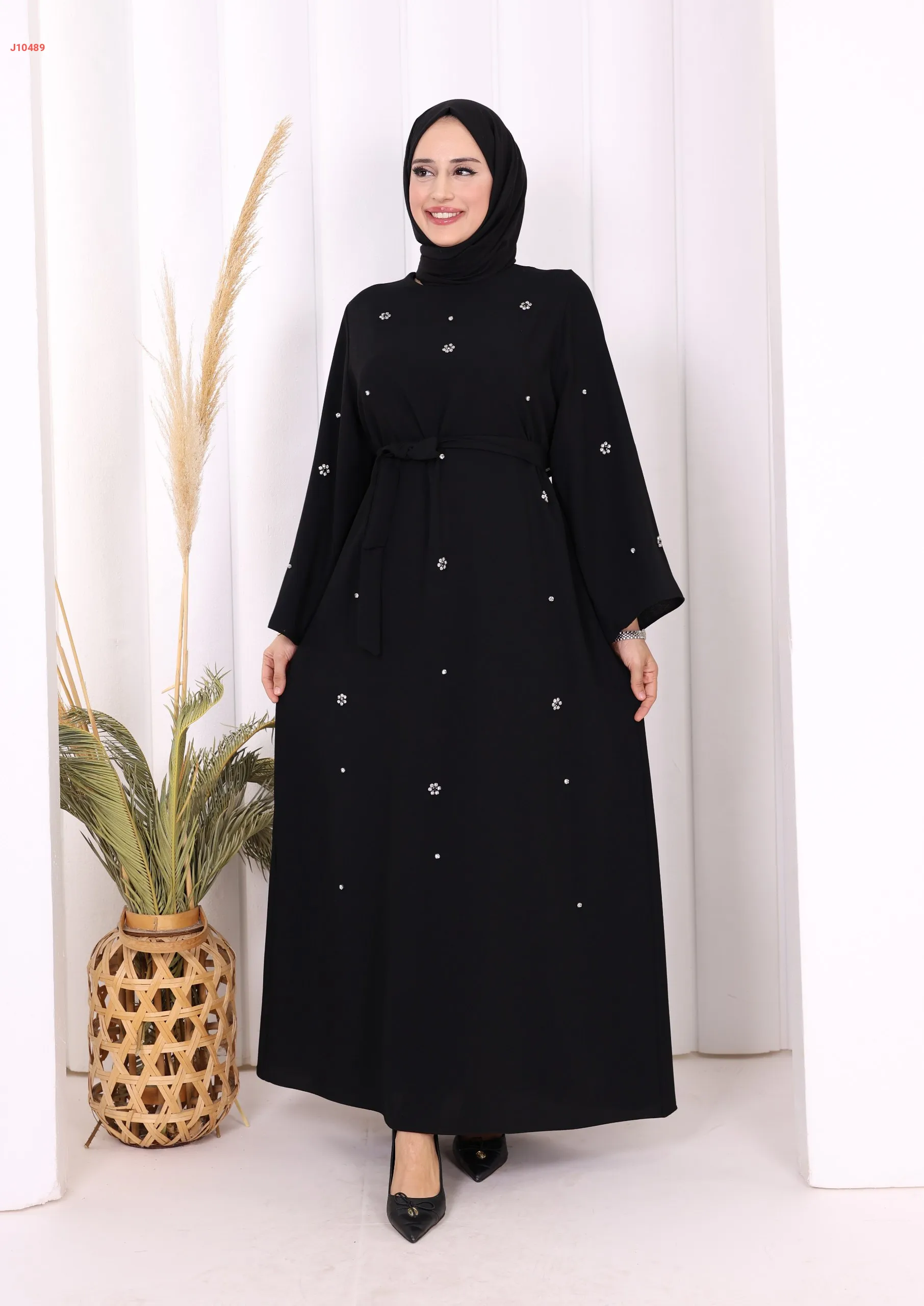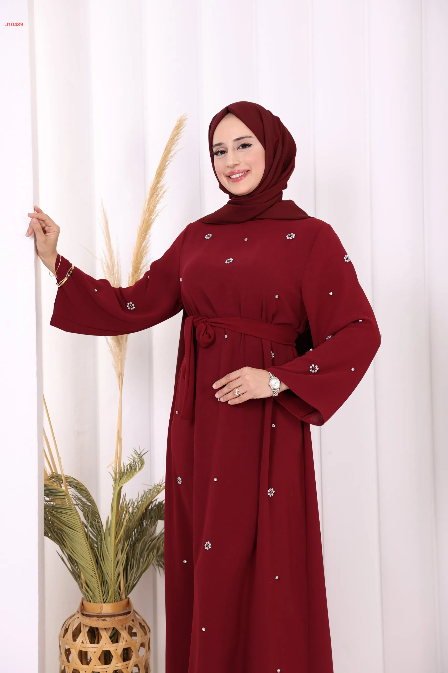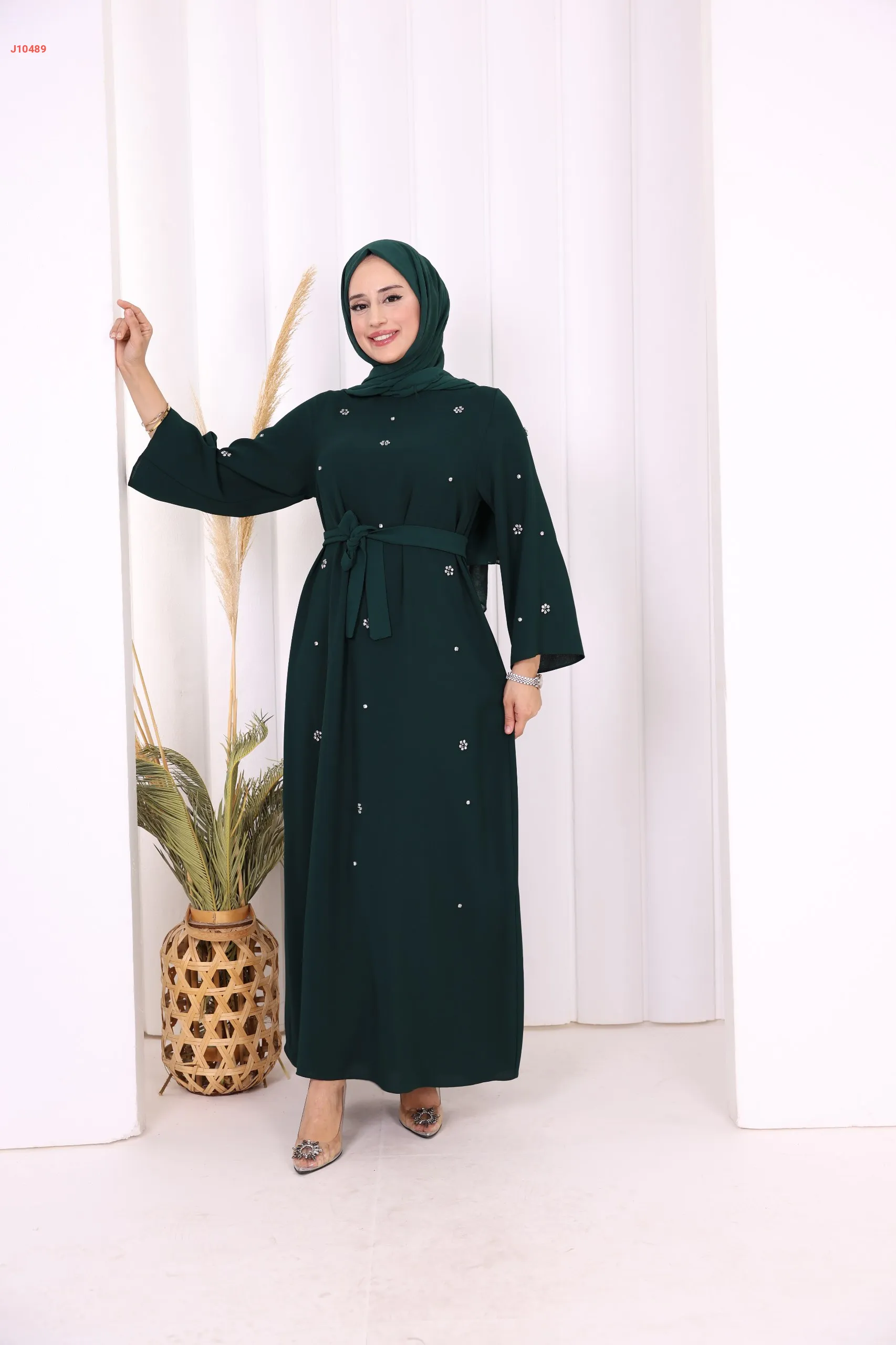 فستان سادة ، مزين بالكريستال، مع حزام