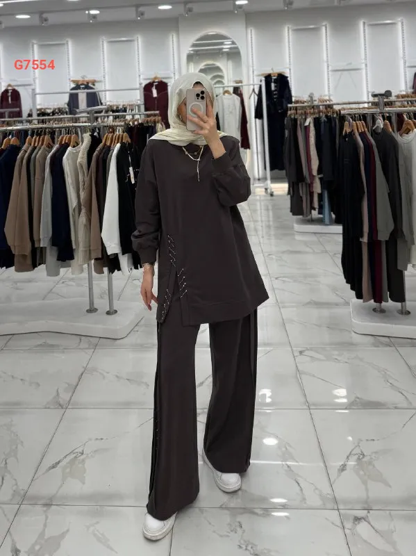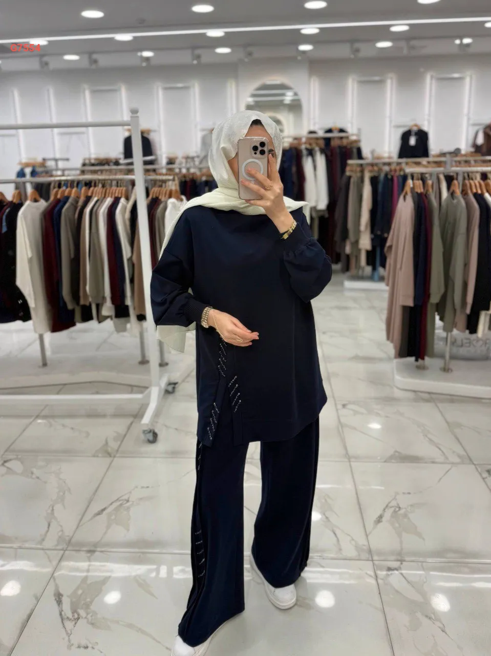 بيجامة سادة مع فتحة جانبية من الامام ، مزينة بالخرز