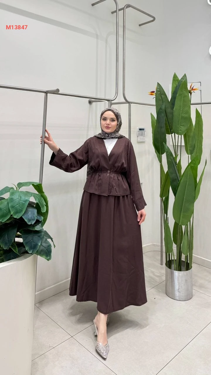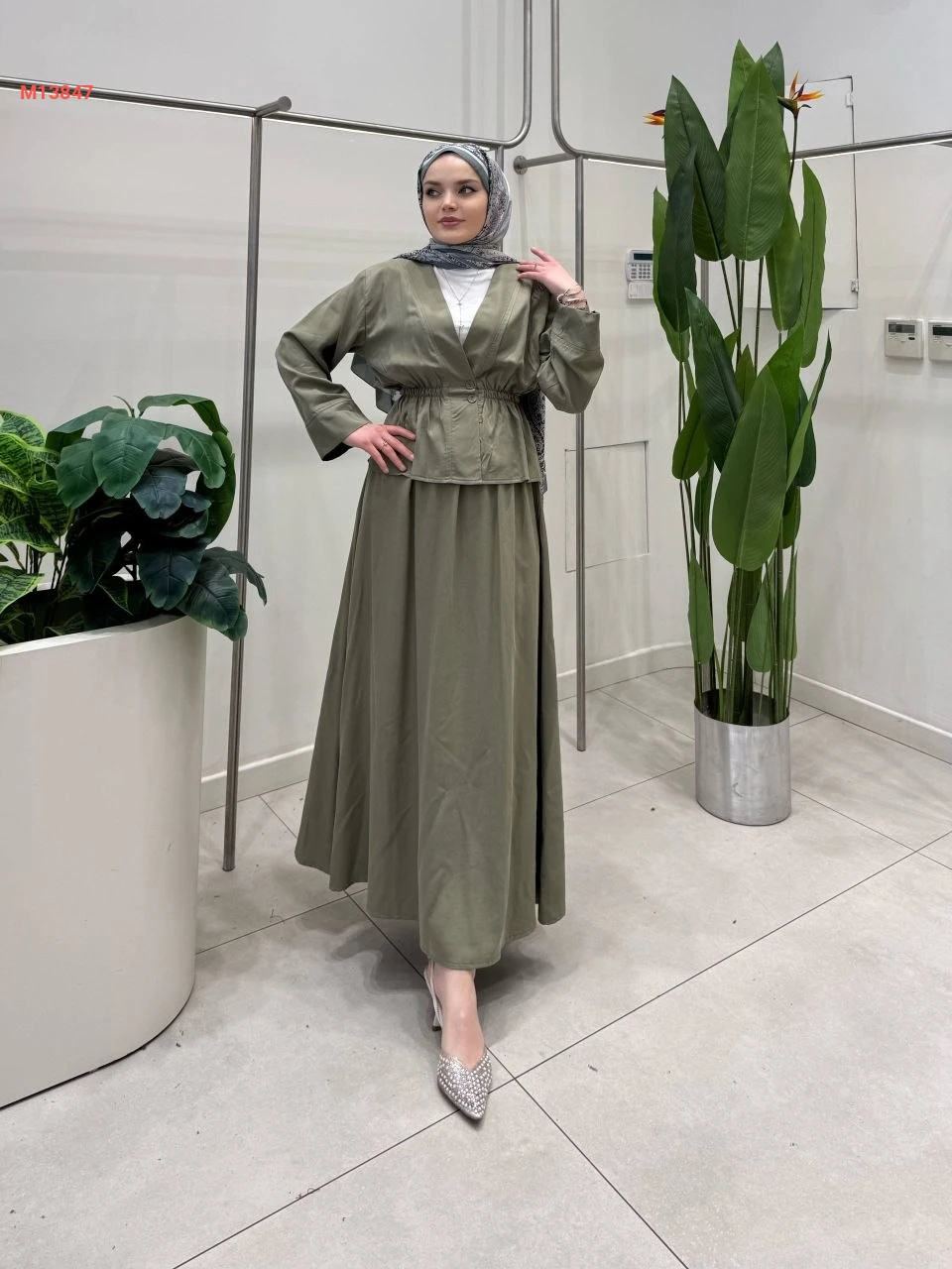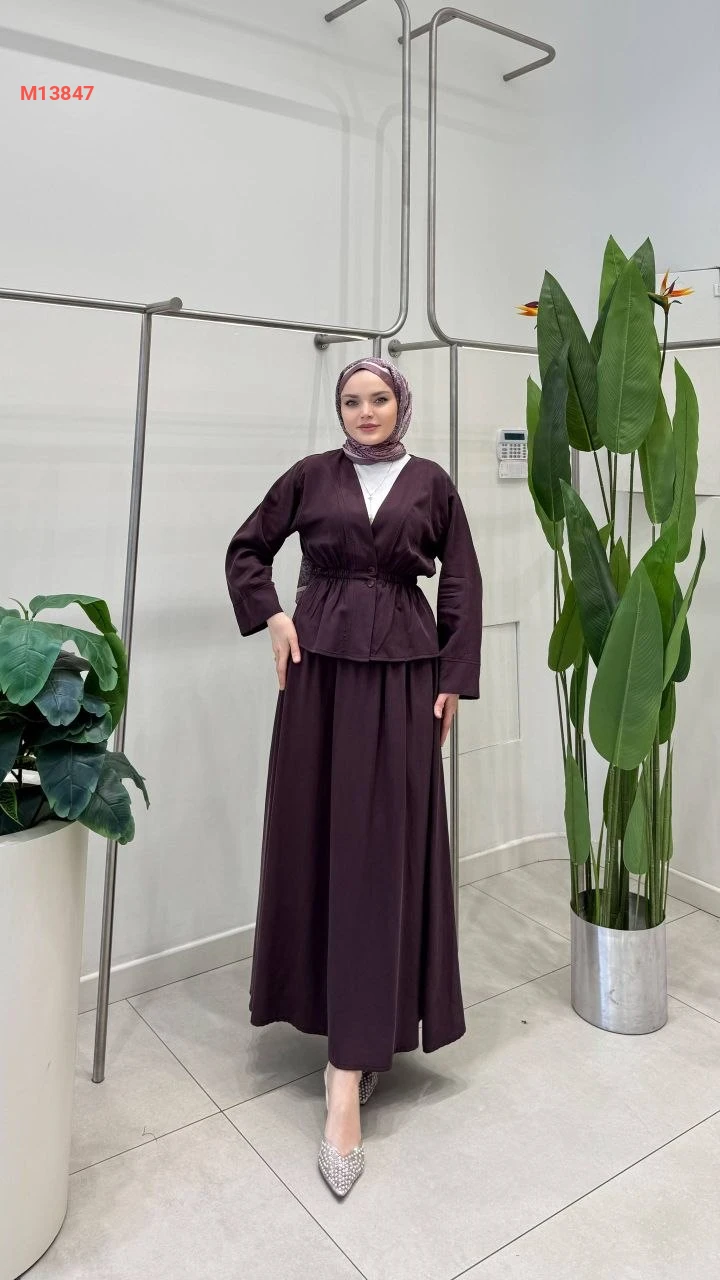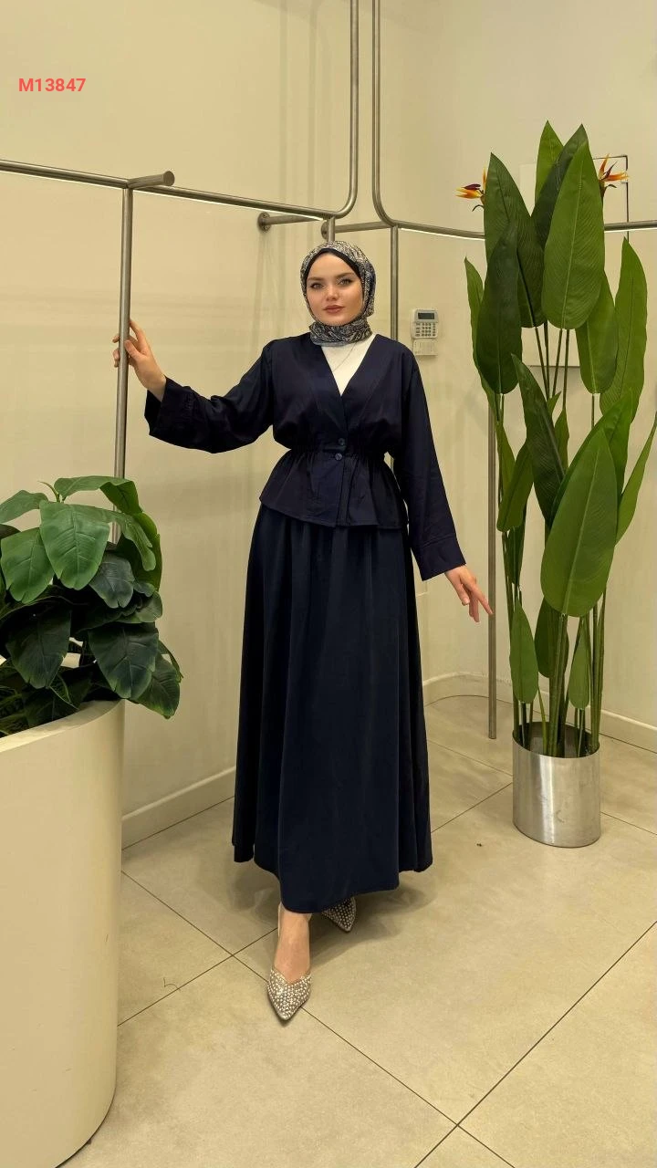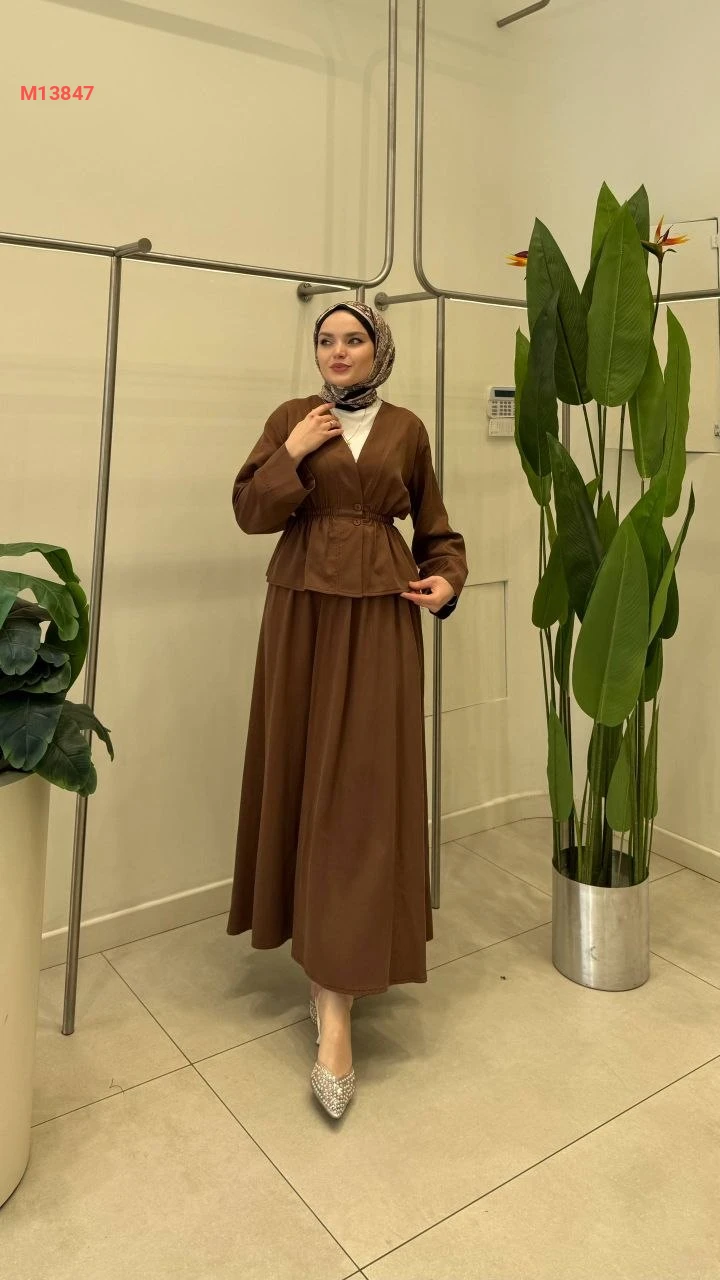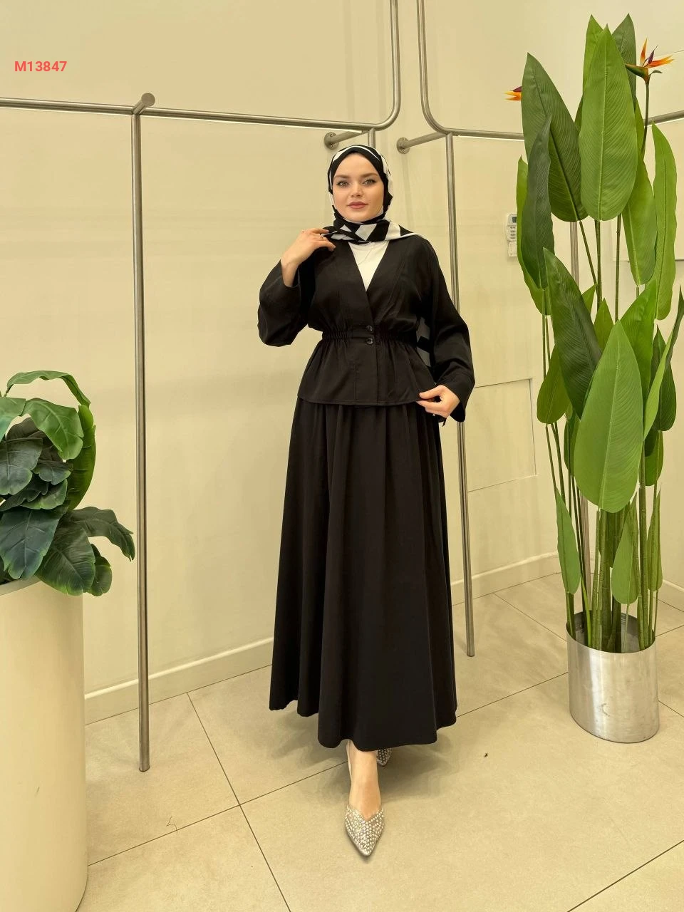 طقم تنورة وجاكيت قبة v زم عالخصر