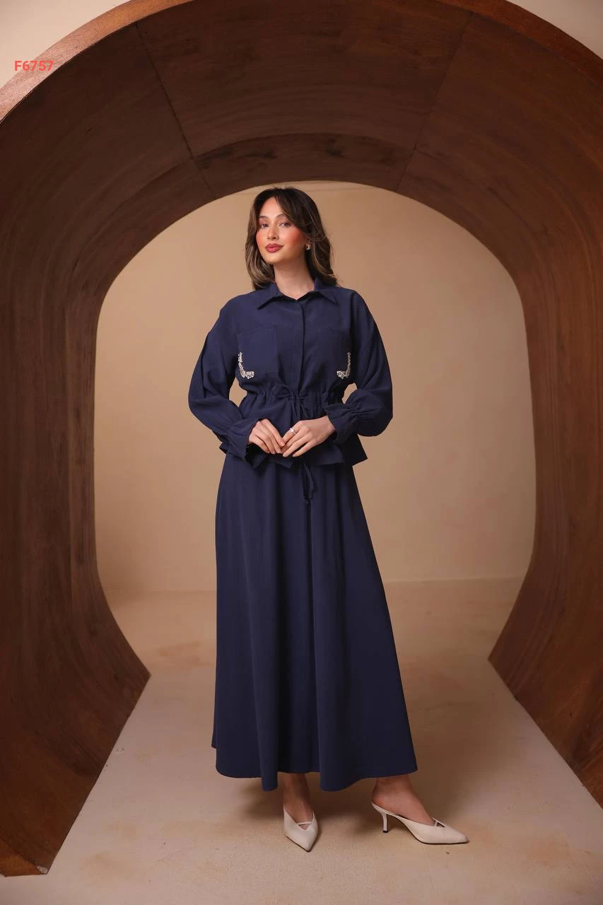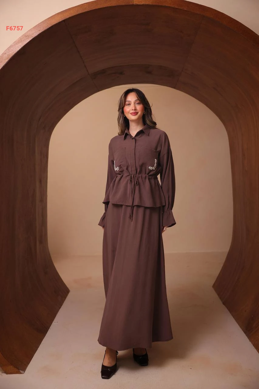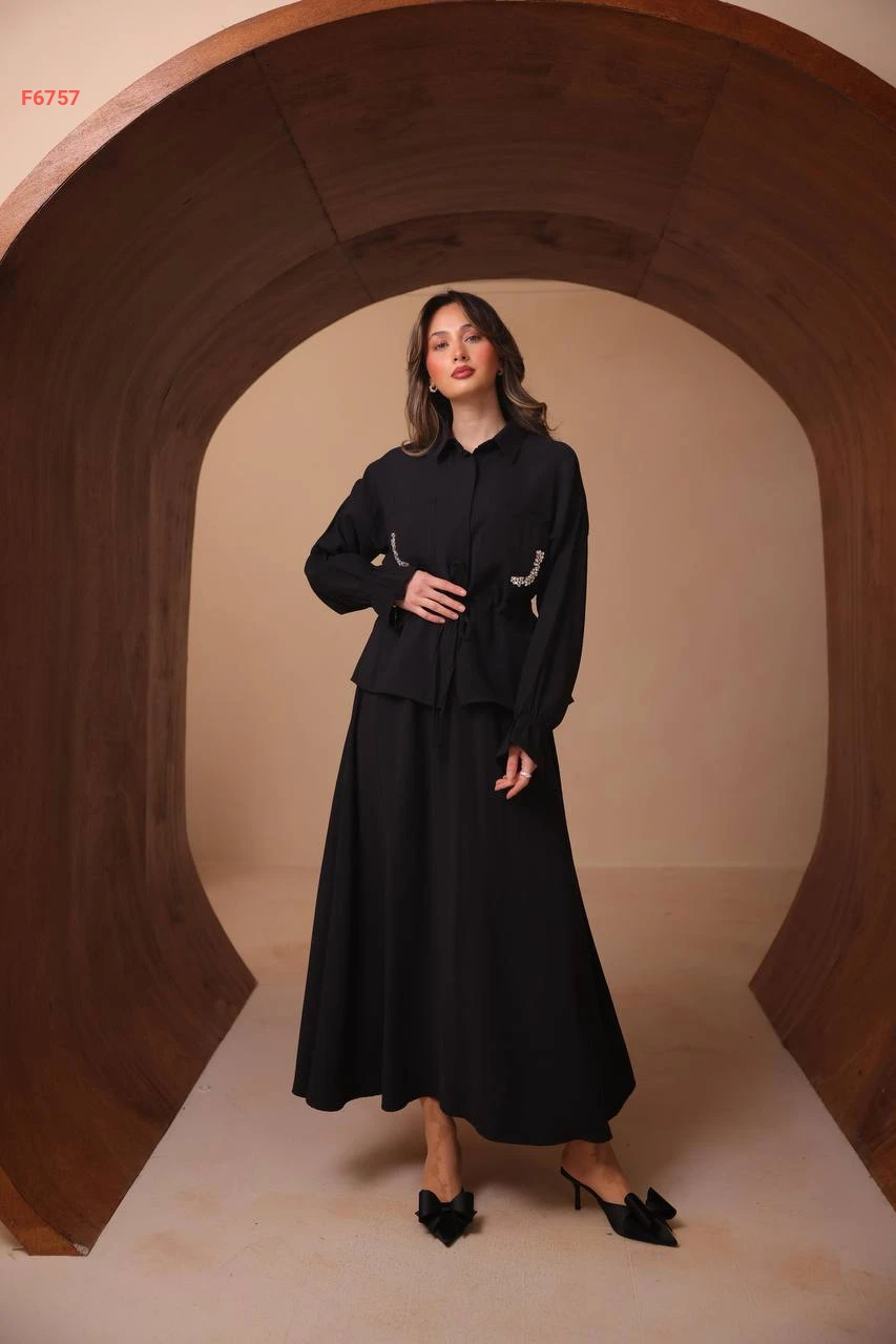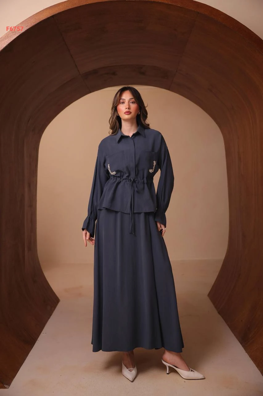 طقم تنورة وقميص بجيوب مطرزة أحجار