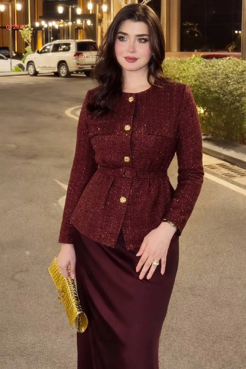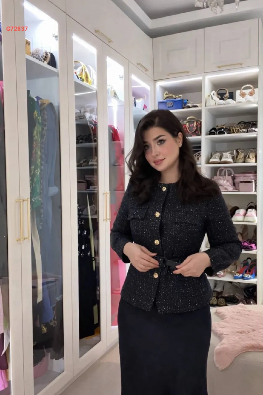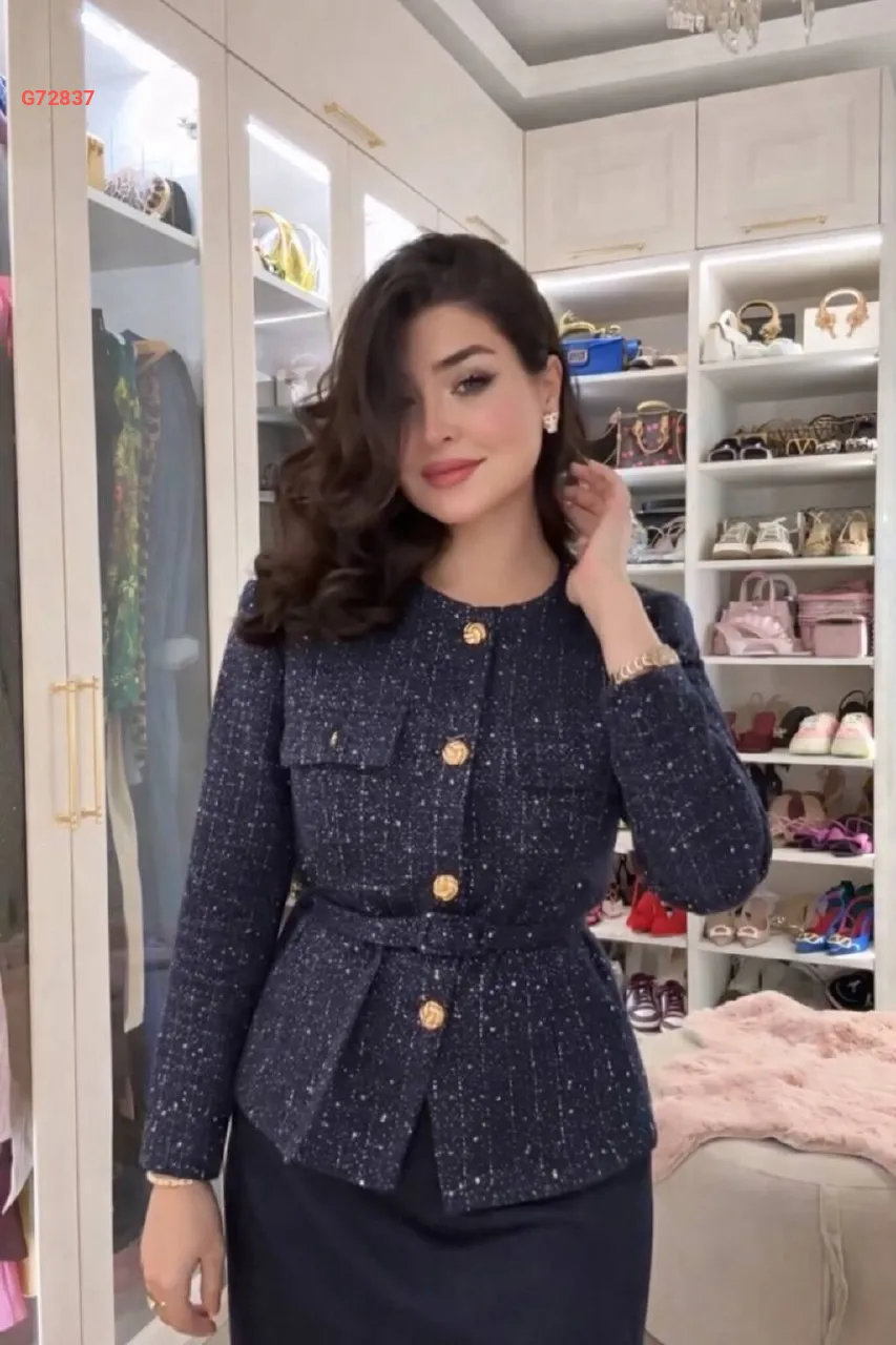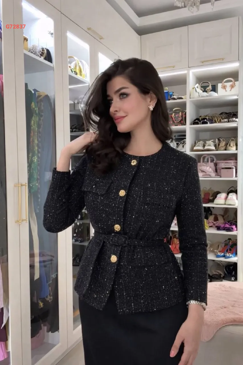 طقم تنورة جاكيت قصير بأزرار ذهبي مقصب مع حزام وجيب