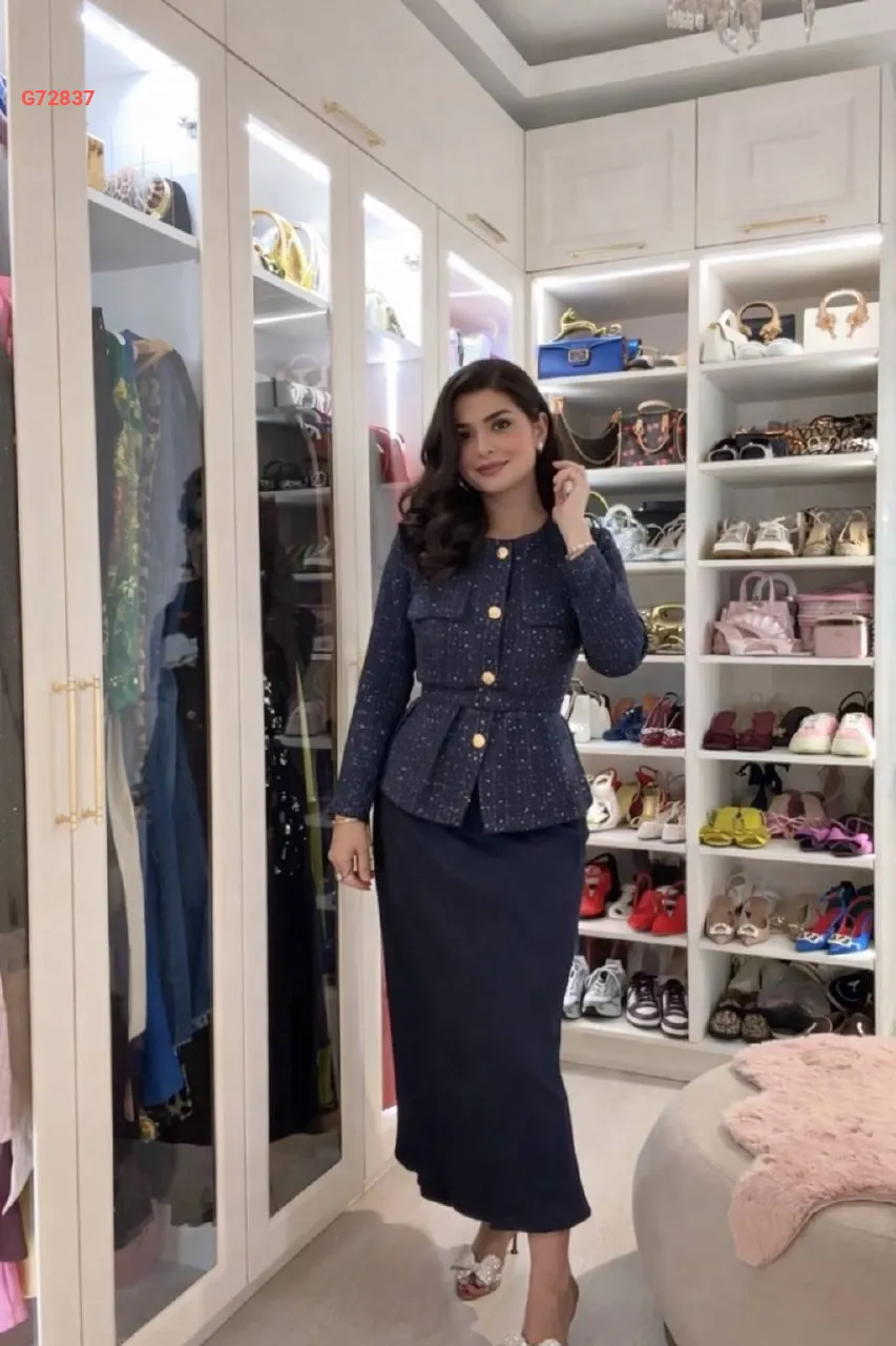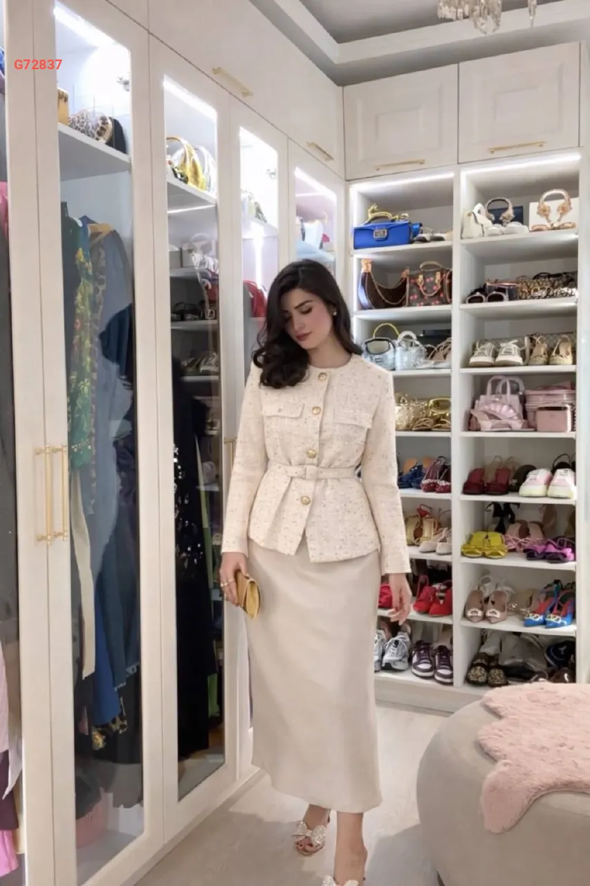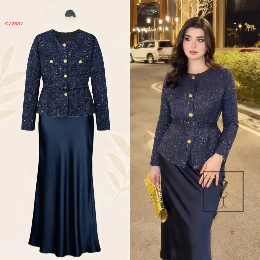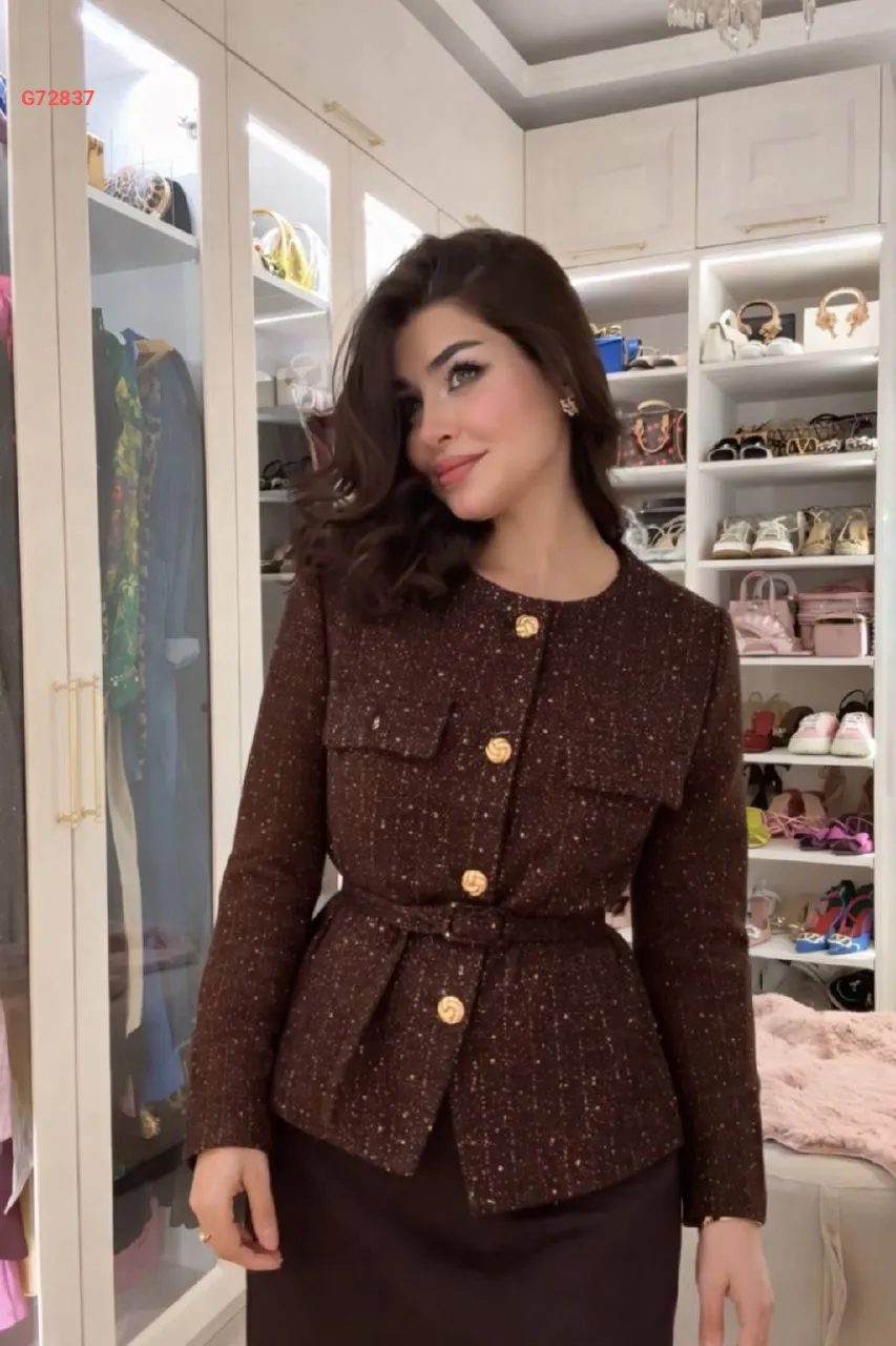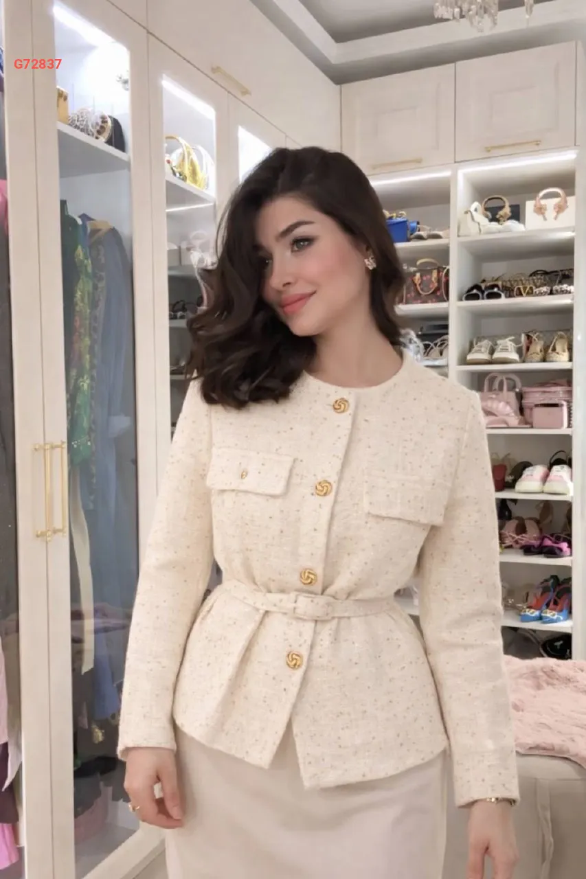 طقم تنورة جاكيت قصير بأزرار ذهبي مقصب مع حزام وجيب