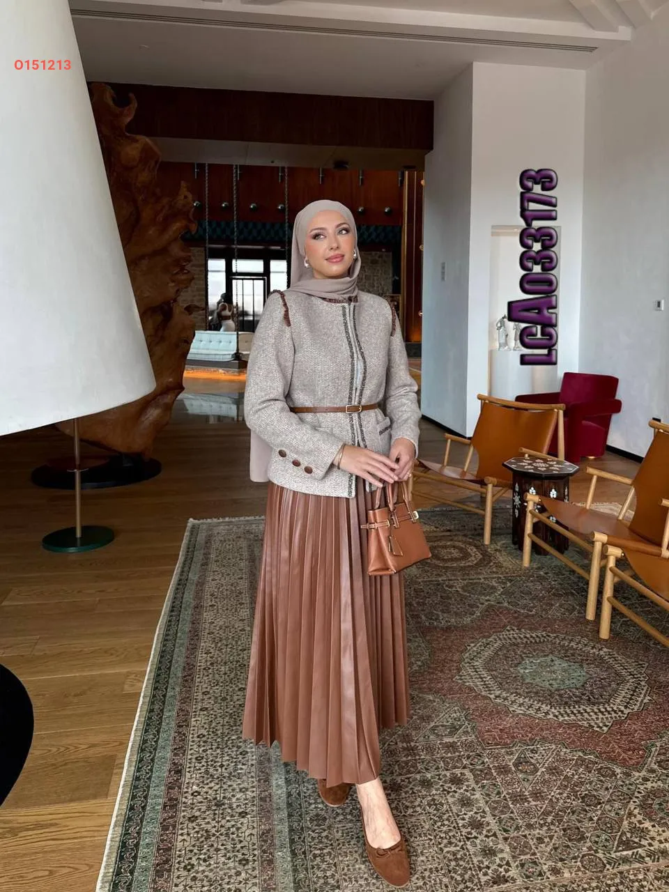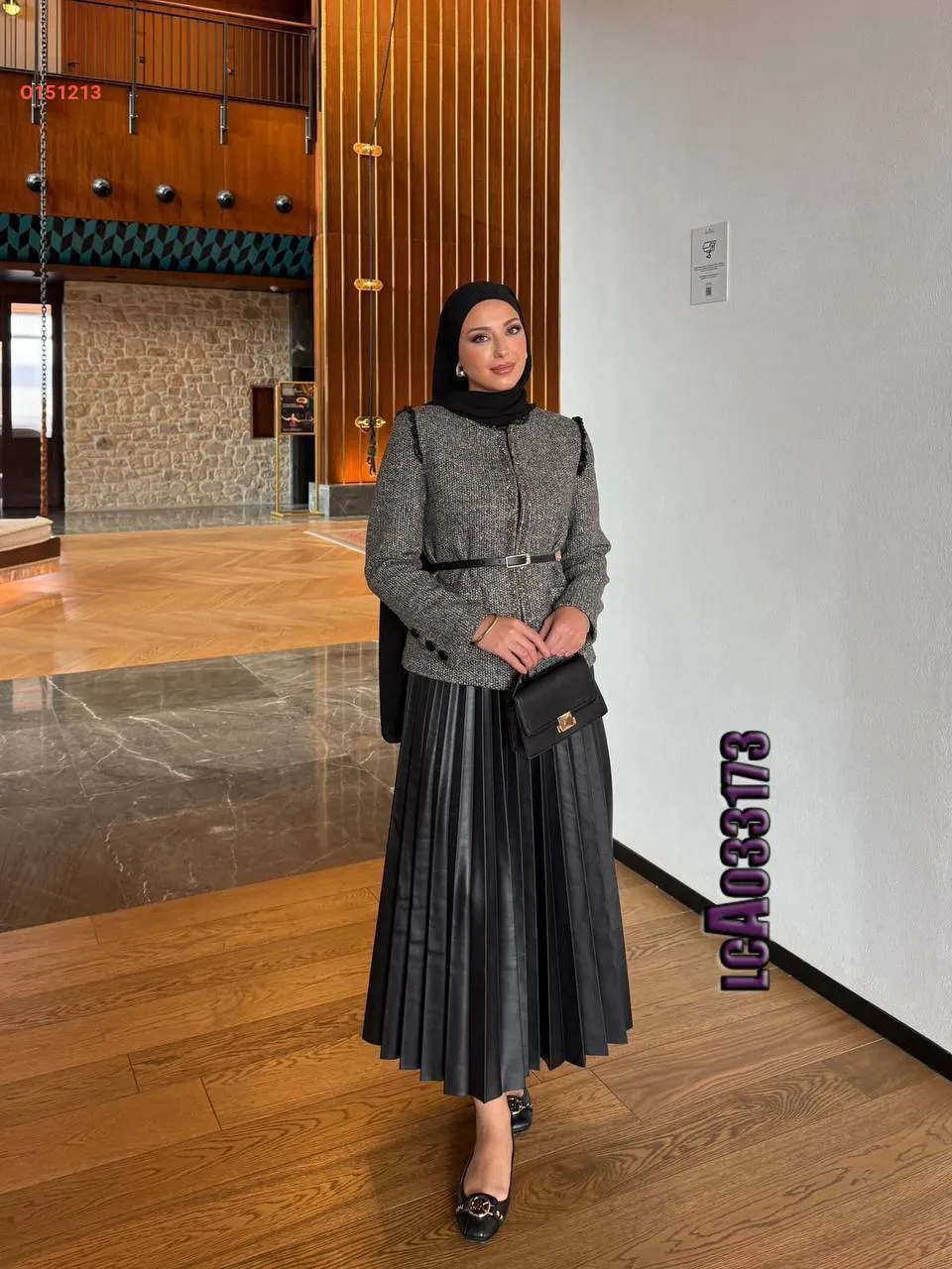 ✨ جاكيت جوخ ناعم مع تنورة جلد بليسيه فاخرة