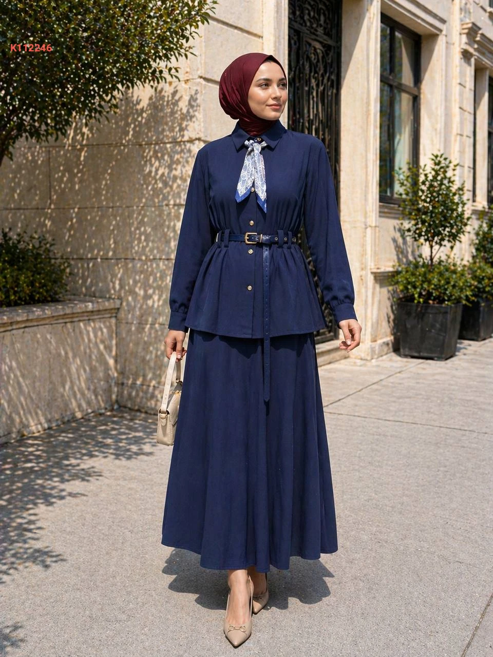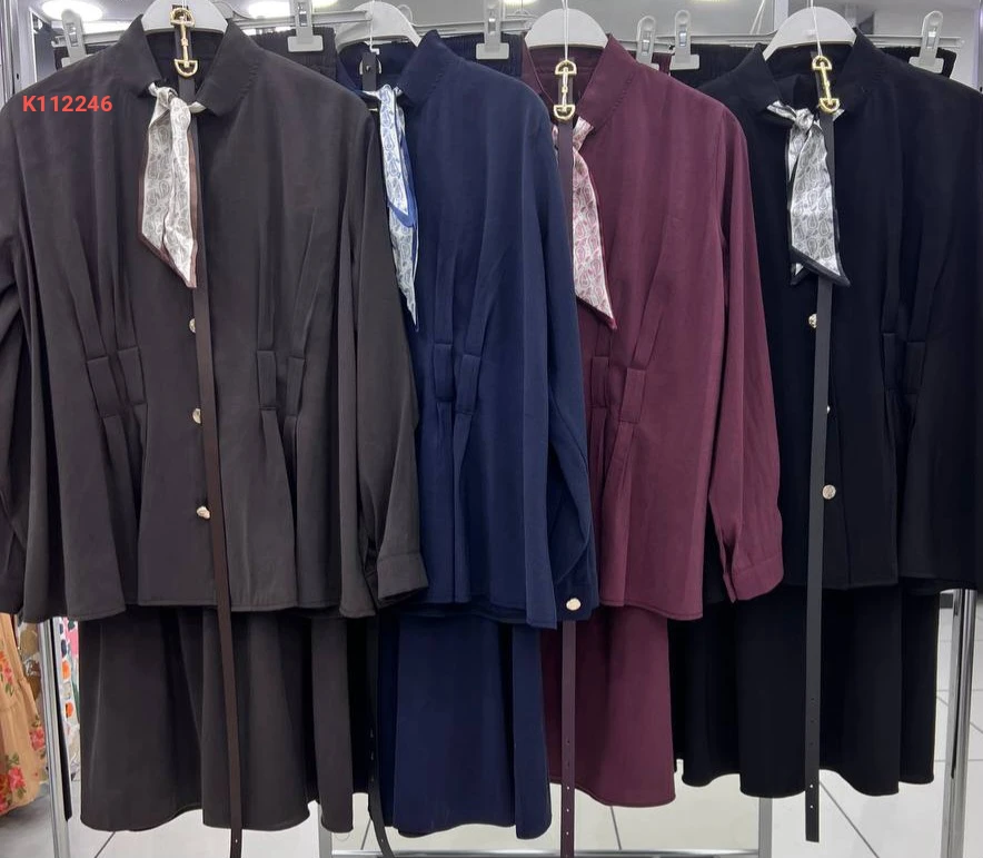 طقم تنورة مع قميص بحزام وفولار