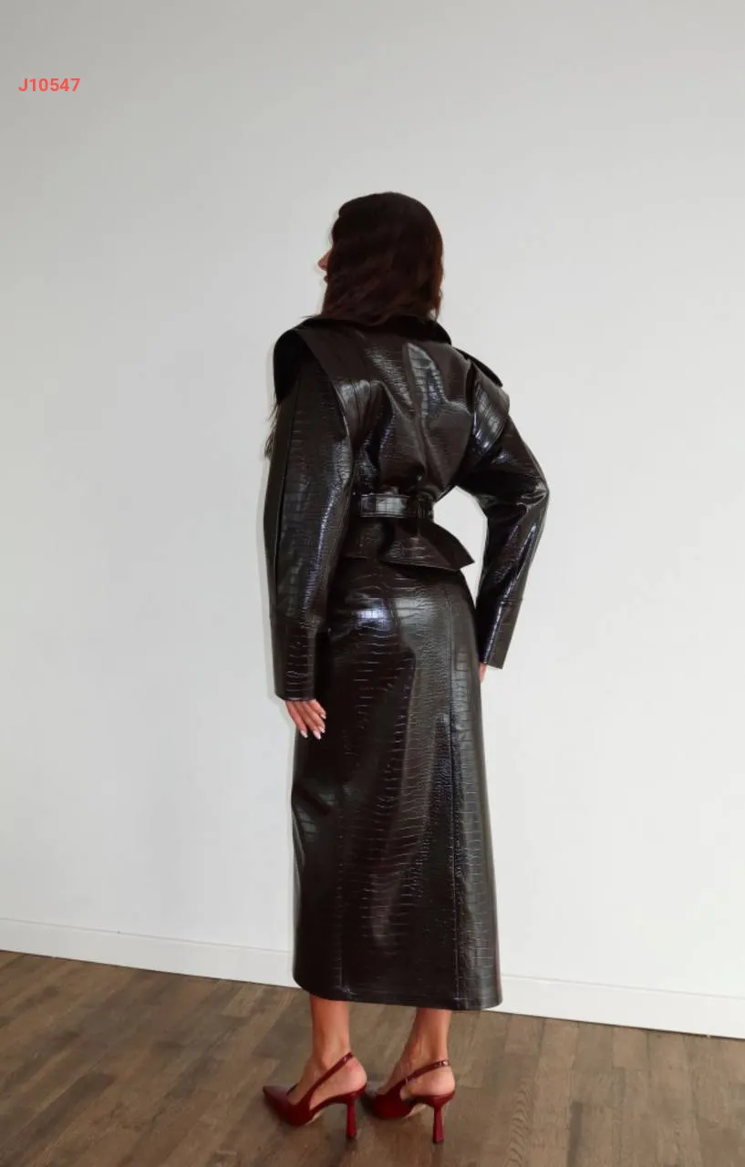 طقم تنورة جلد بفتحة جانبية وجاكيت