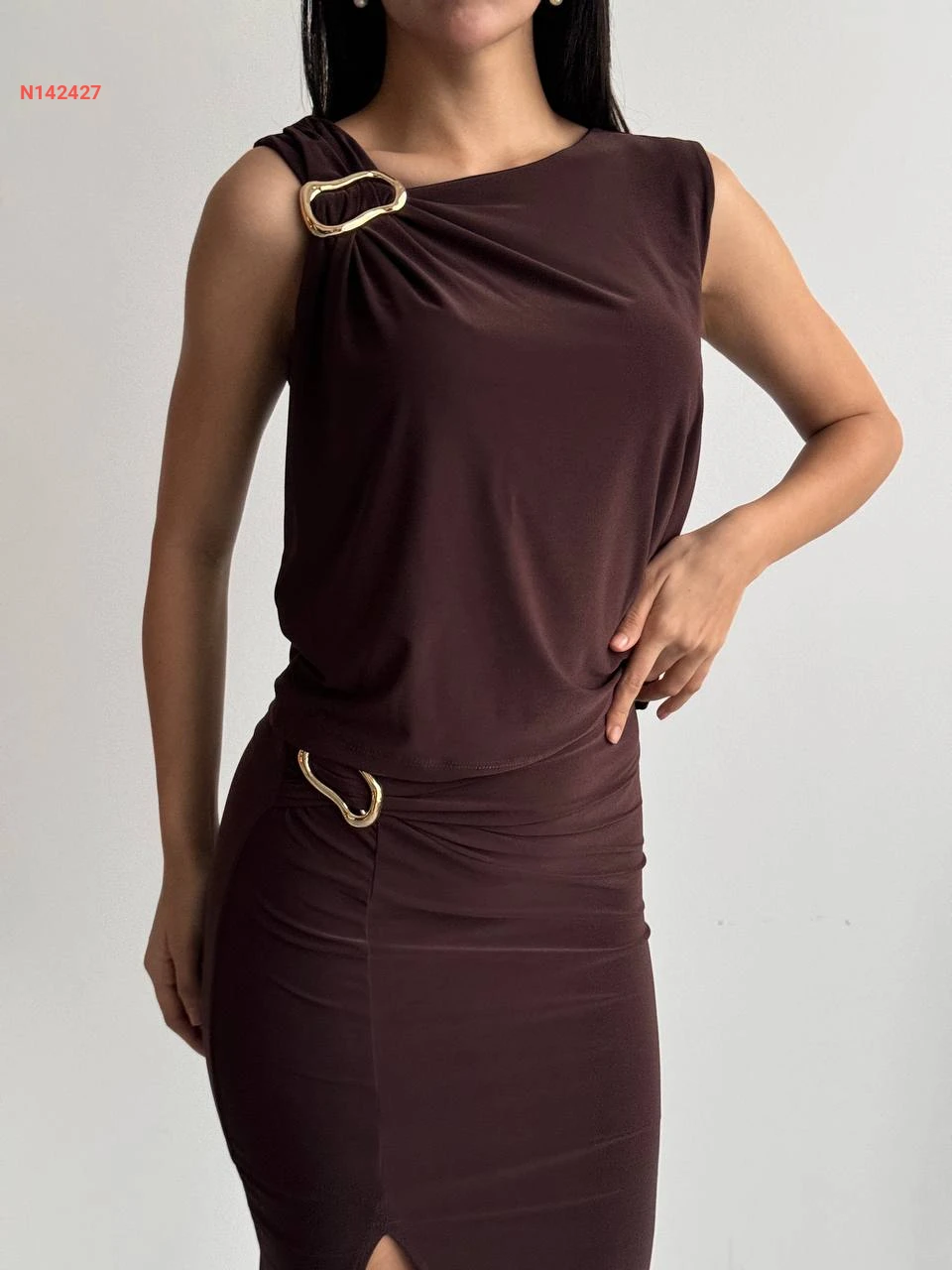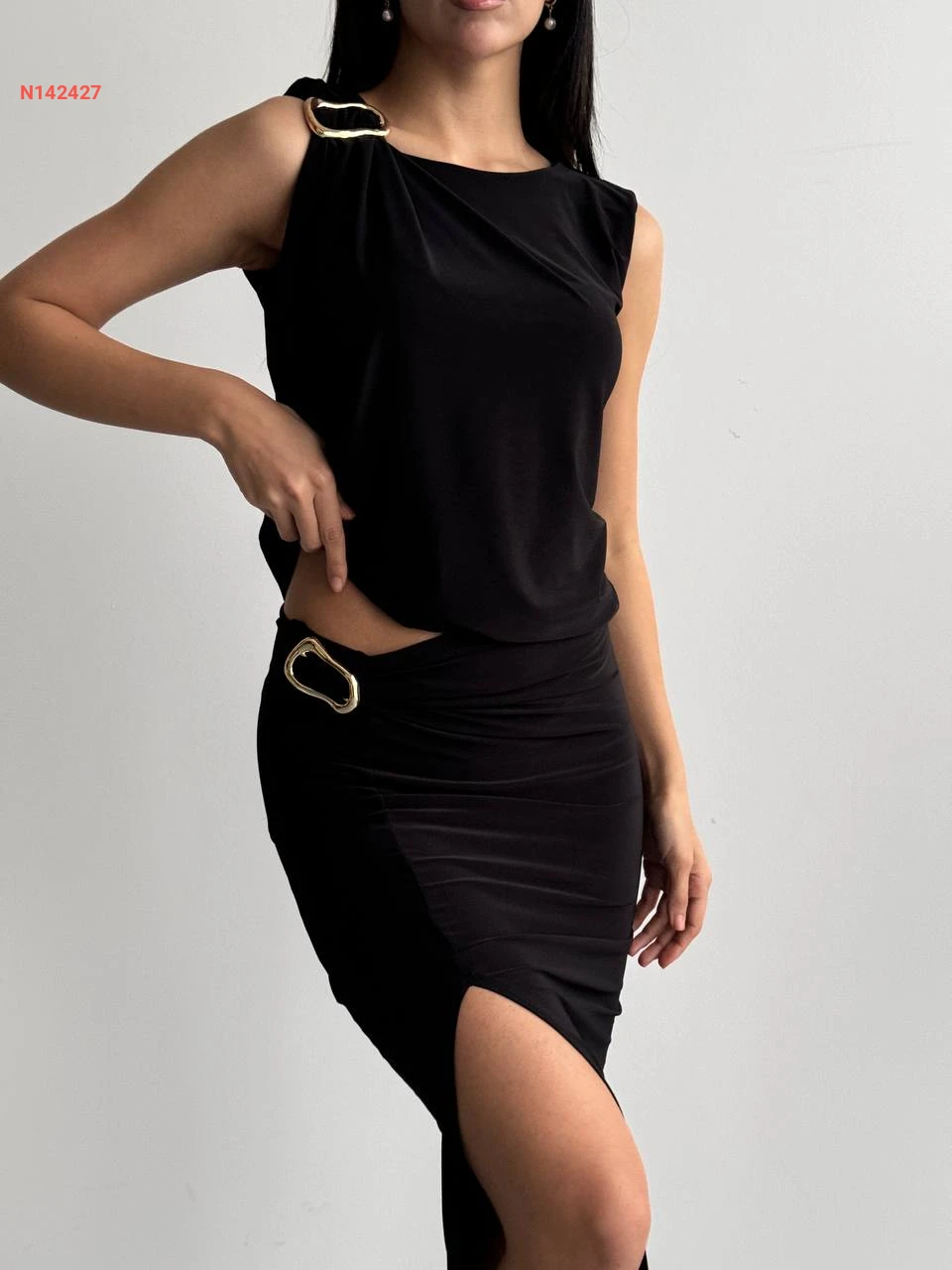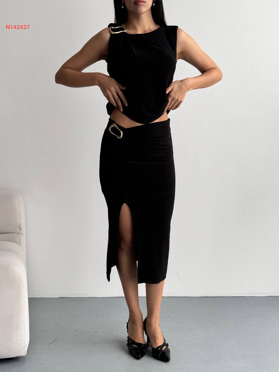طقم تنورة بفتحة وبلوزة بإبزيم