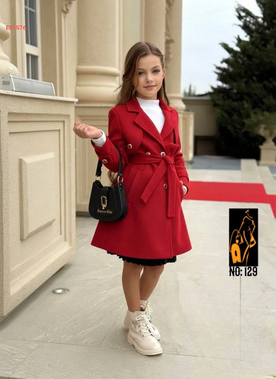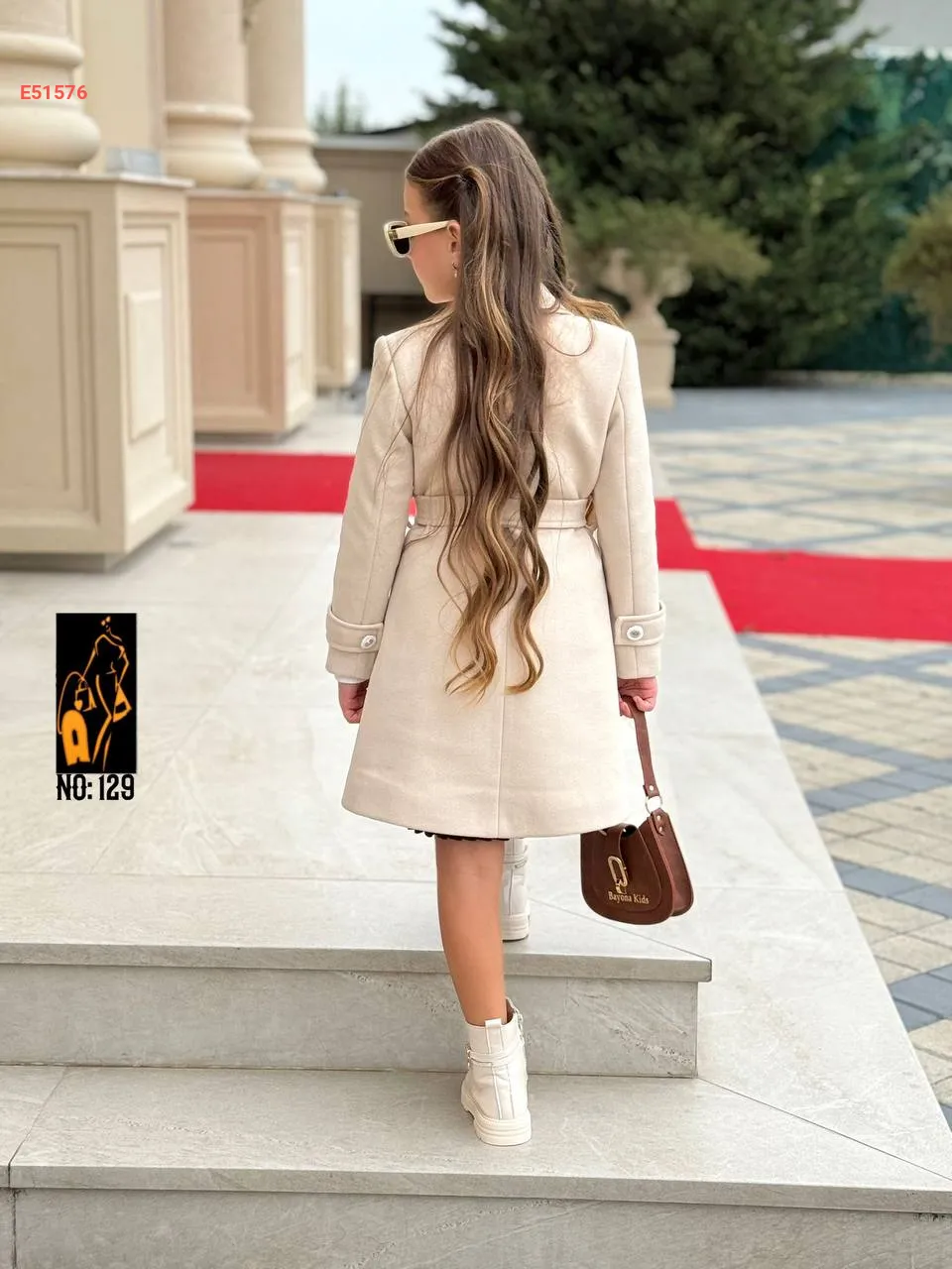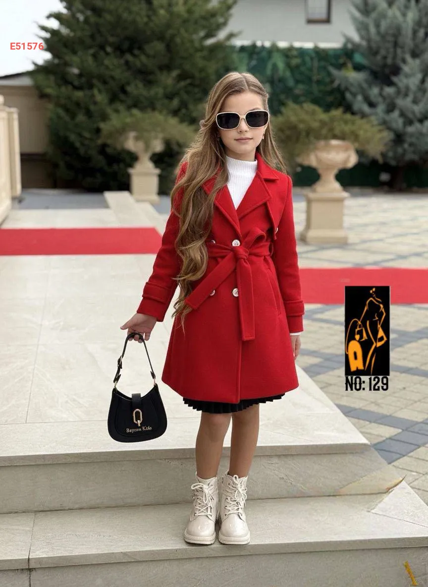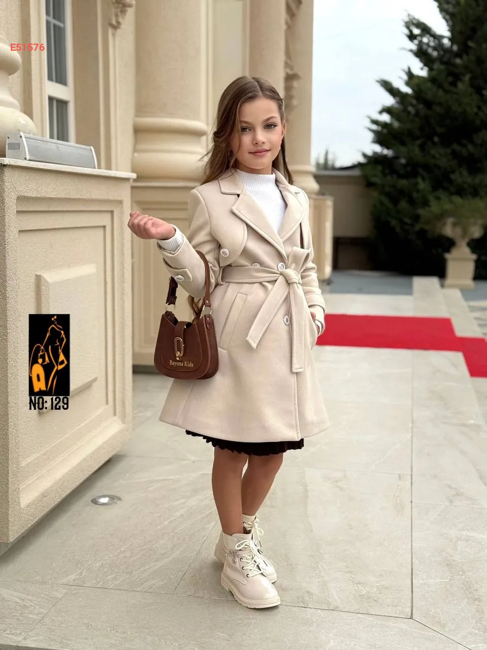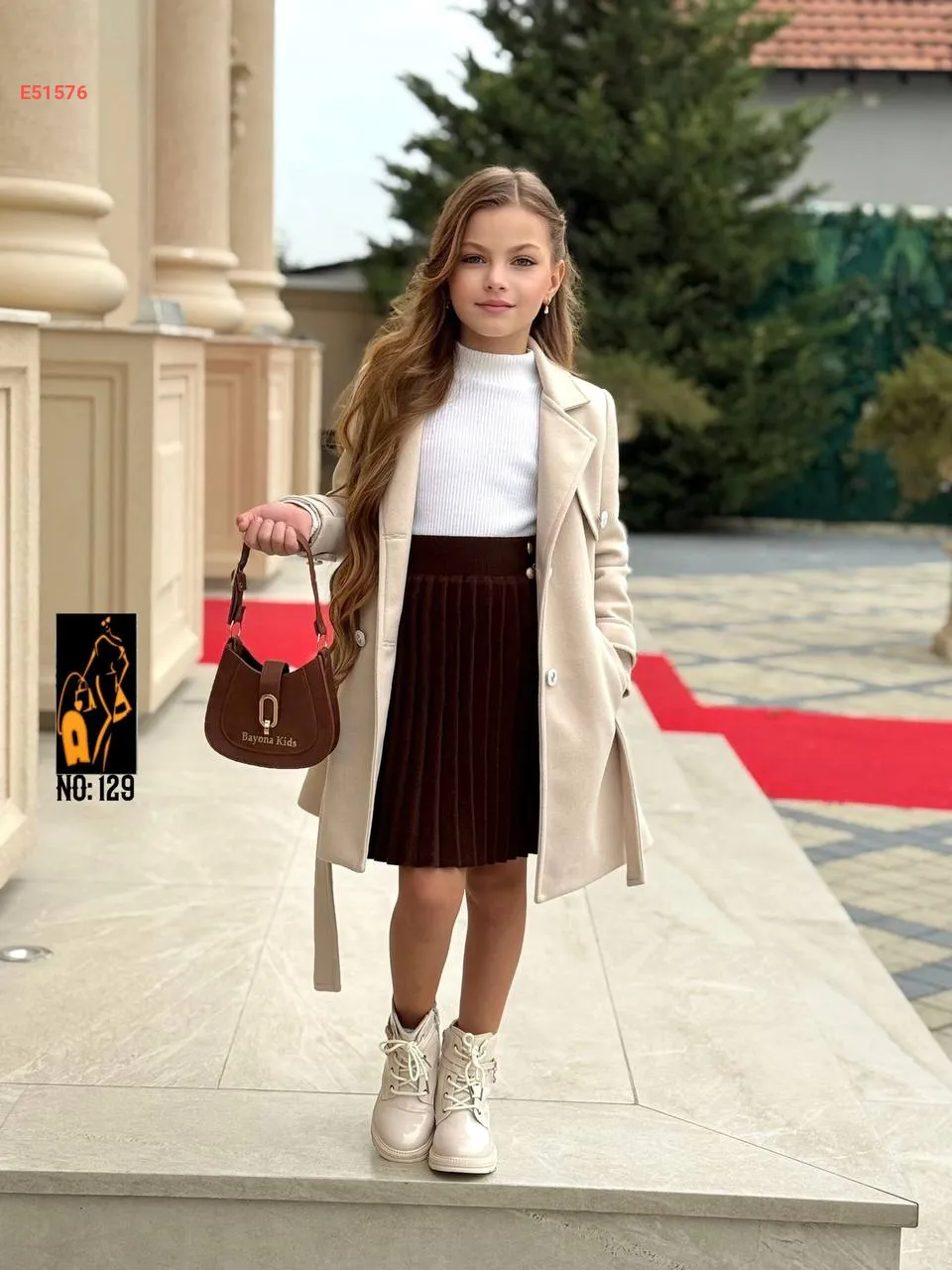 : معطف أنيق + بلوزة بياقة عالية + تنورة + حقيبة 🎒