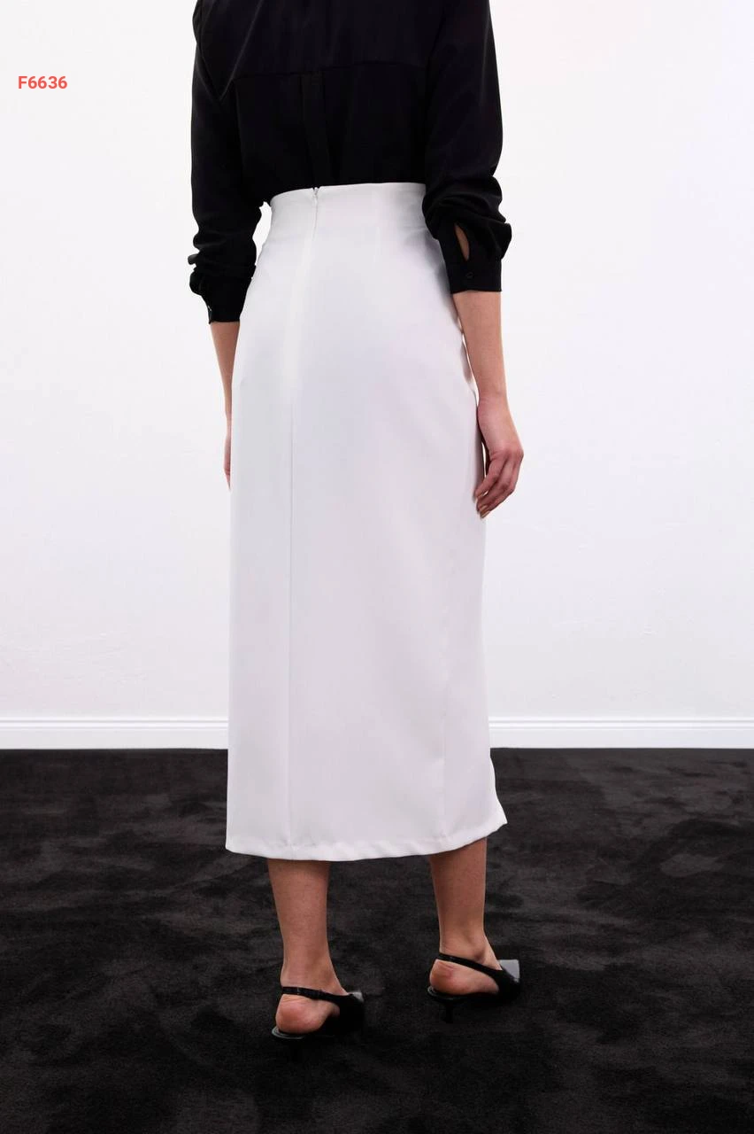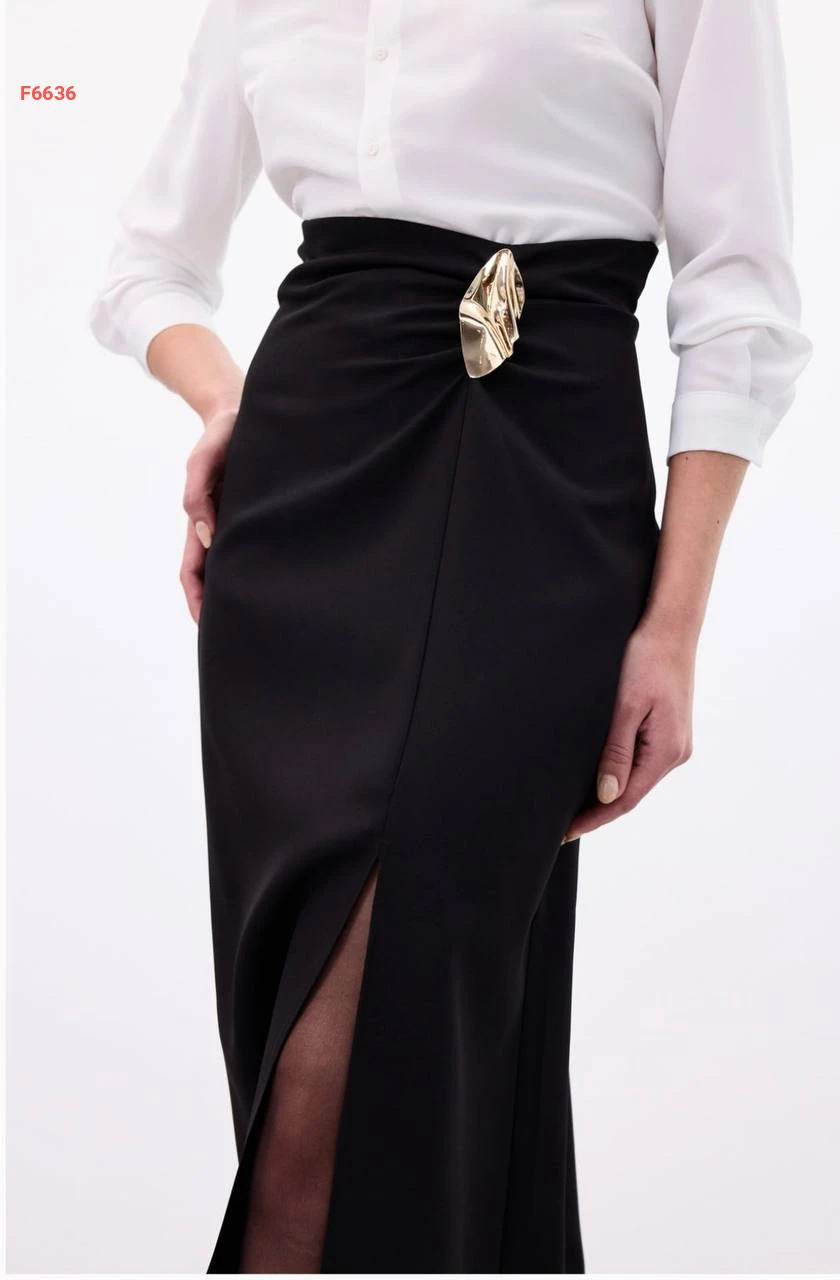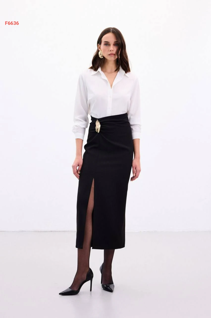 تنورة بفتحة جانبية وبروش دهبي