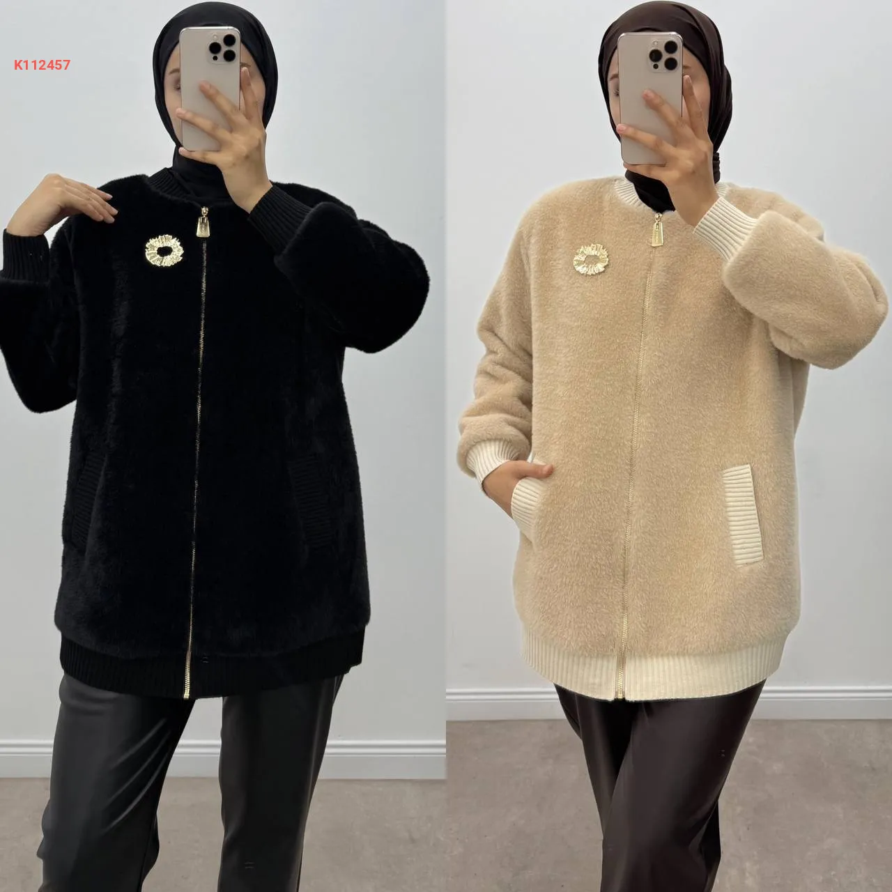 جاكيت صوف ناعم بسحاب وقبة مدورة