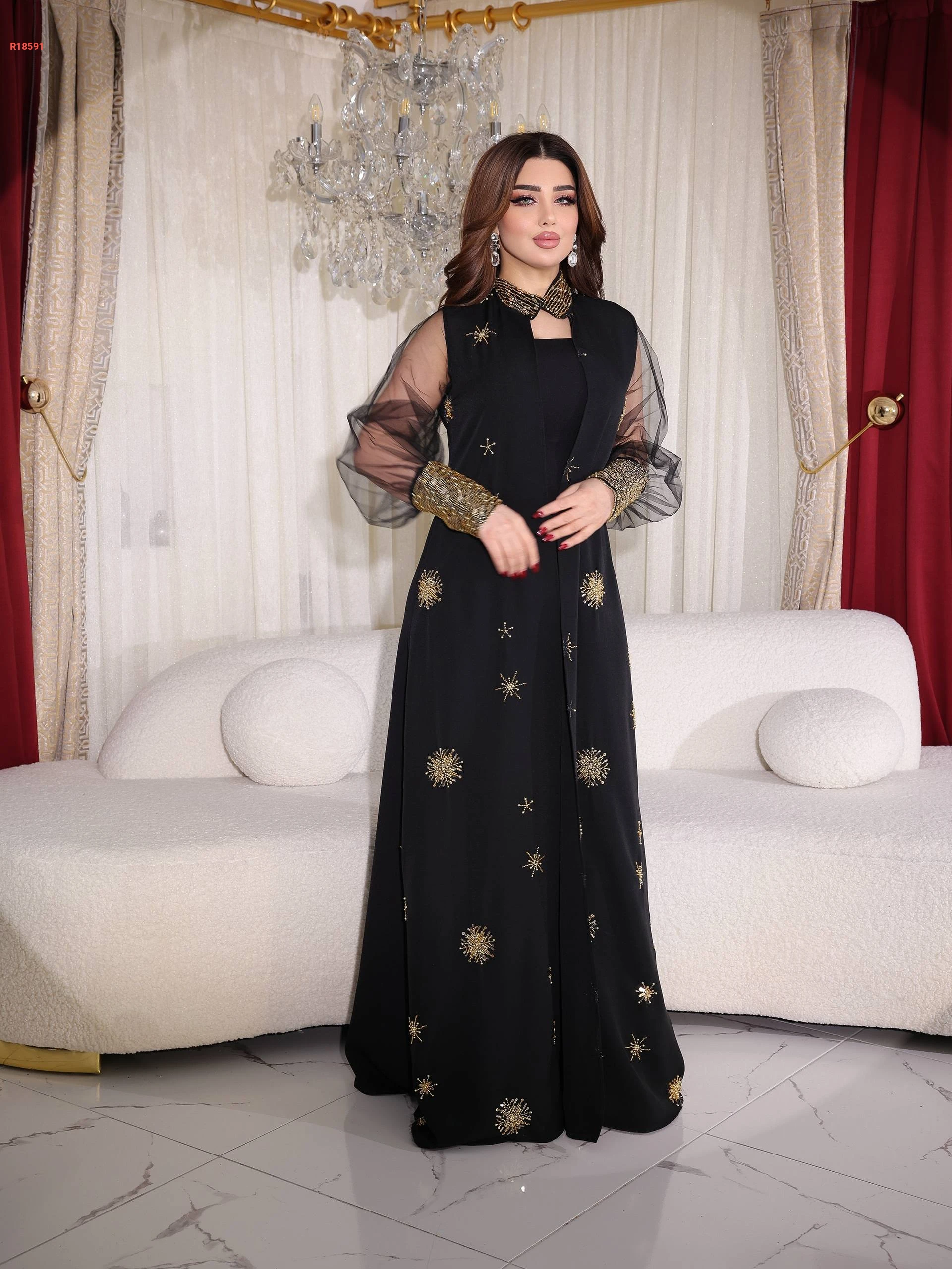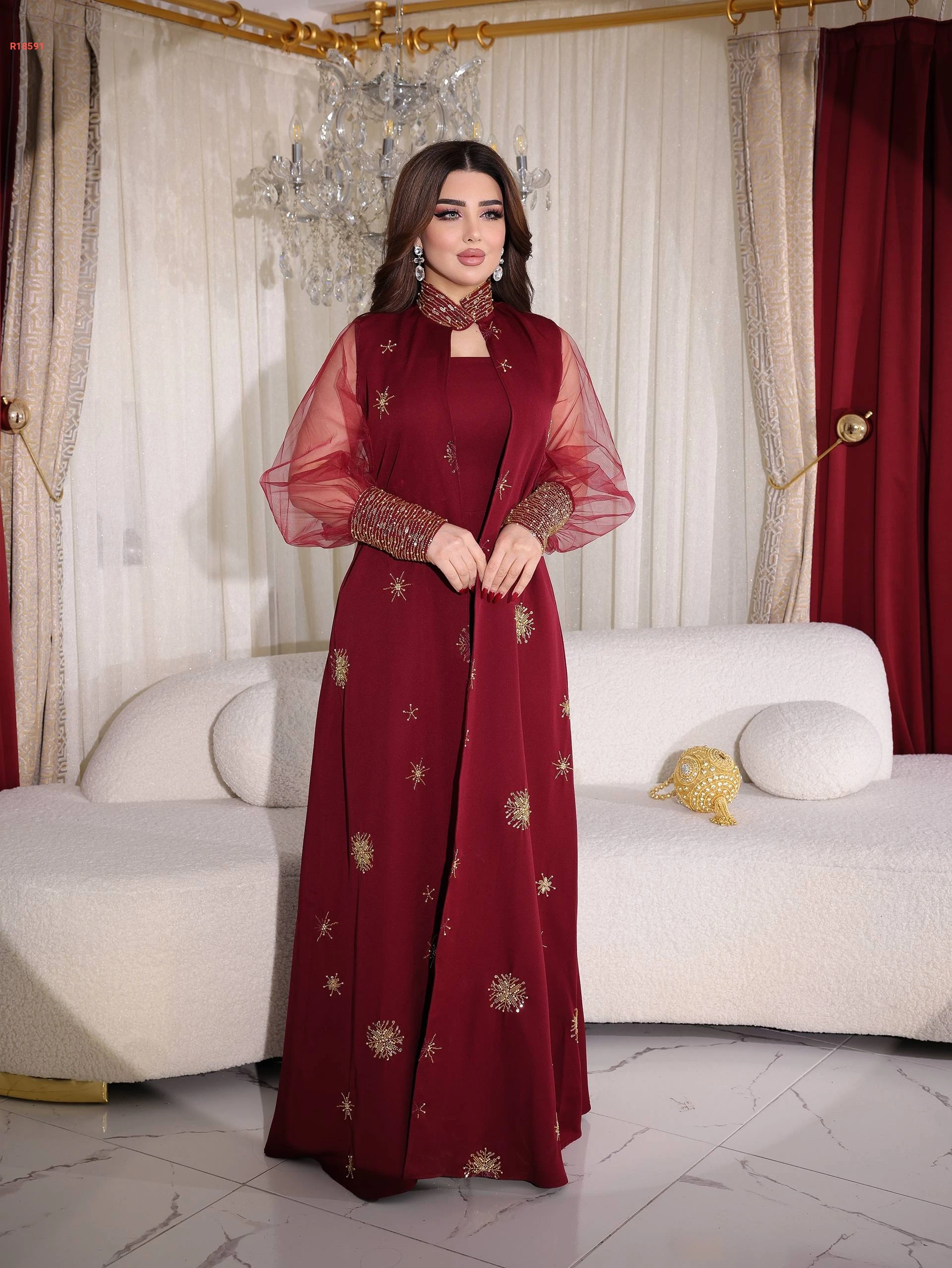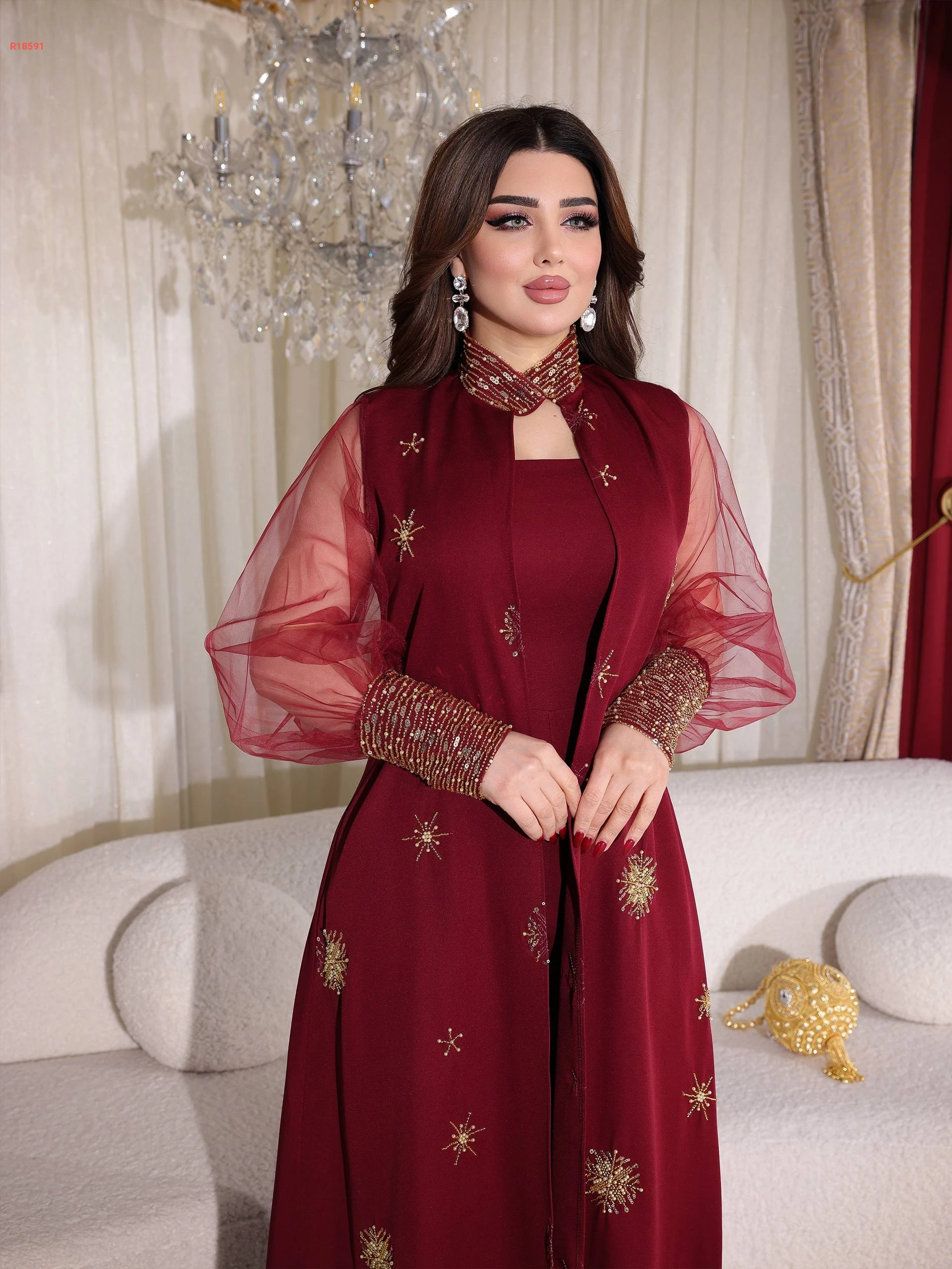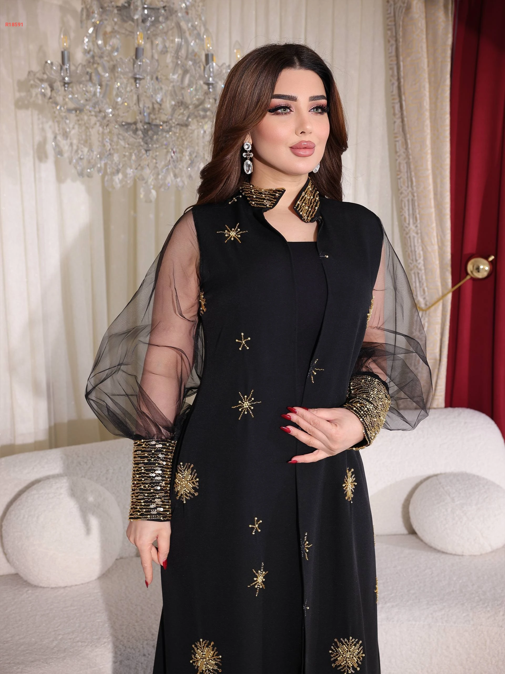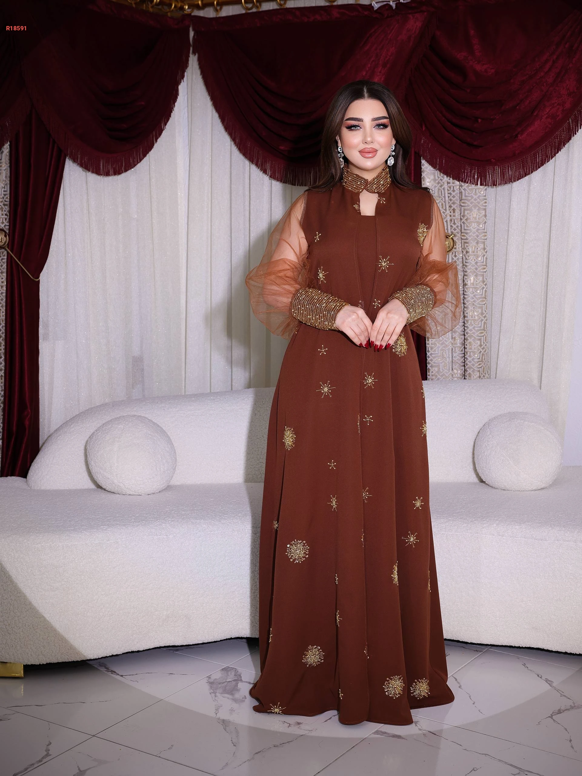 طقم سهرة أفرول سادة مع عباية بأكمام شيفون مع ياقة مرتفعة مزينة بشك الخرز والبرق