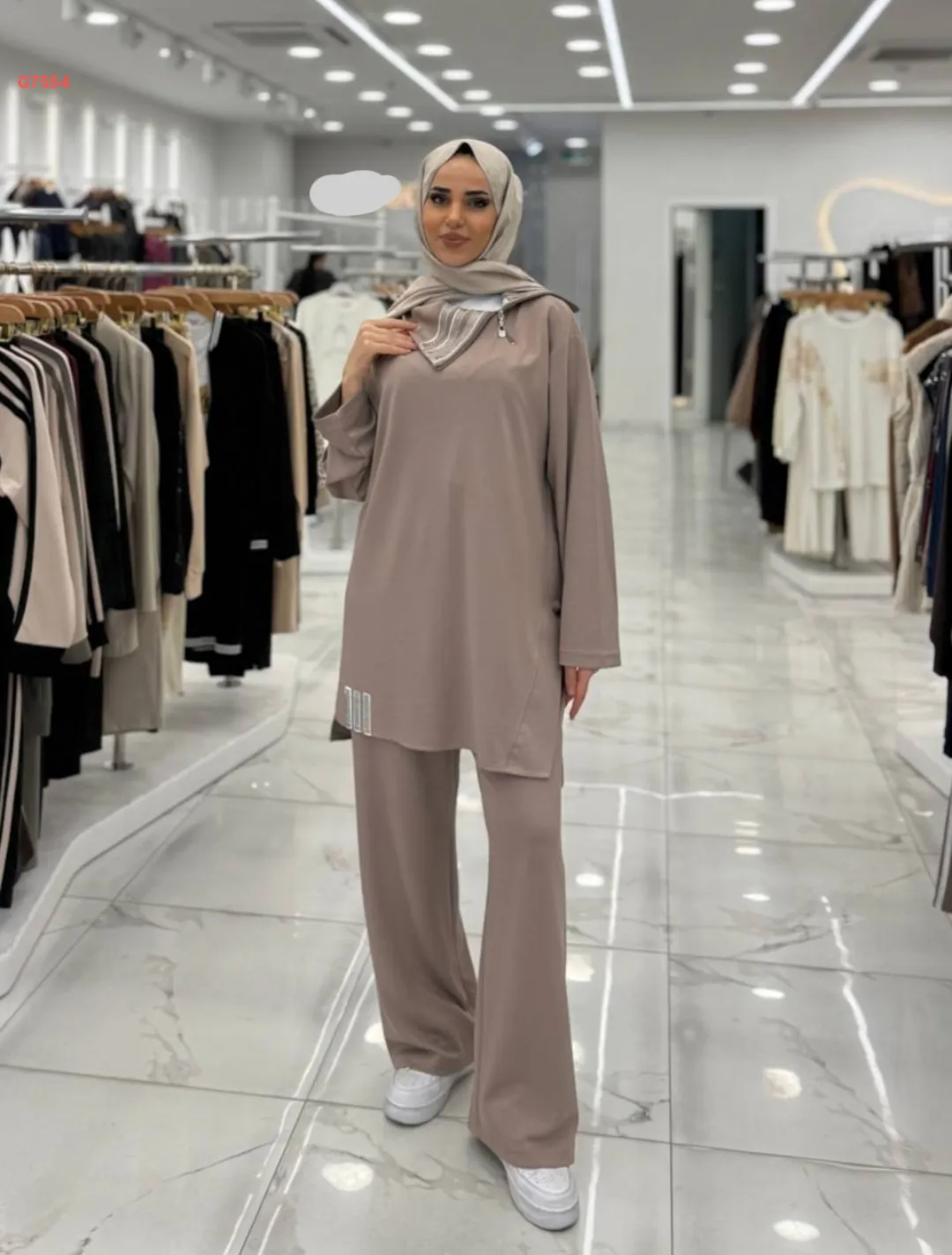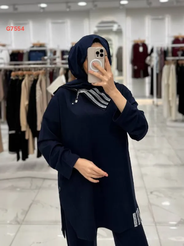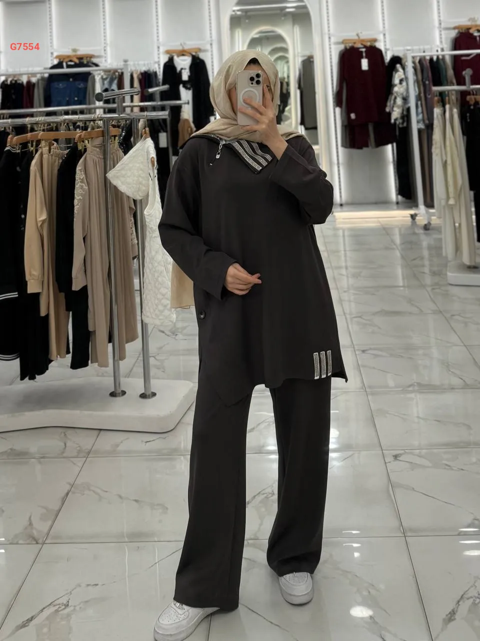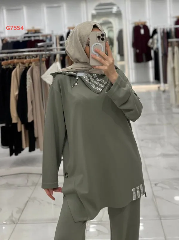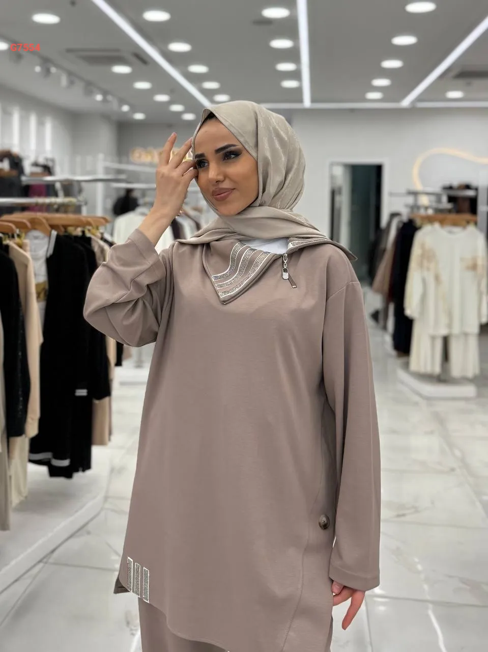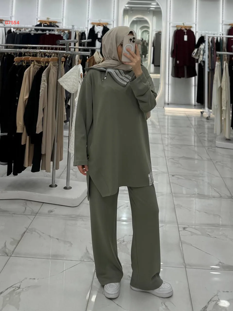 بيجامة قطعتين سادة، مع ياقة بسحاب جانبي