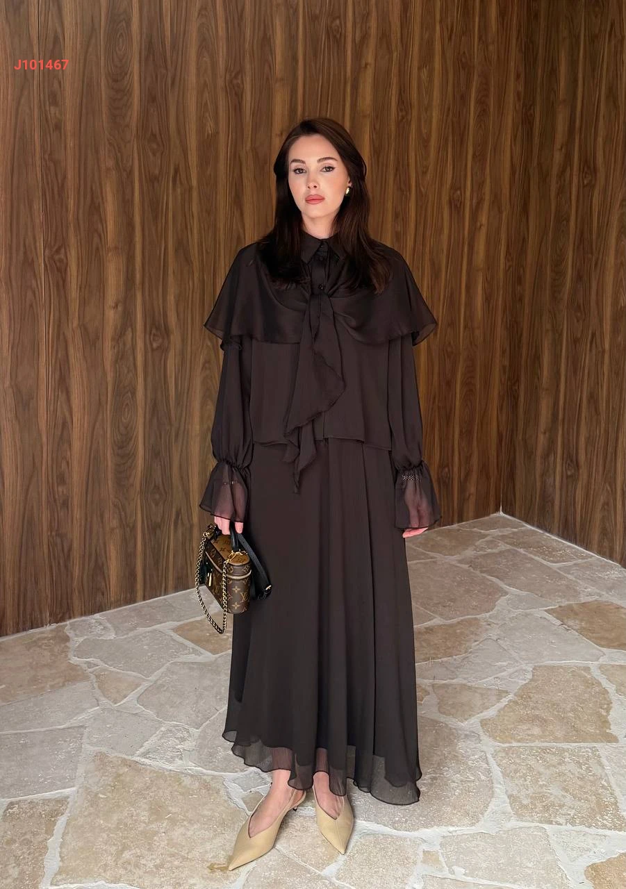 طقم تنورة قطعتين سادة بأزرار مع شال ربط عالكتف