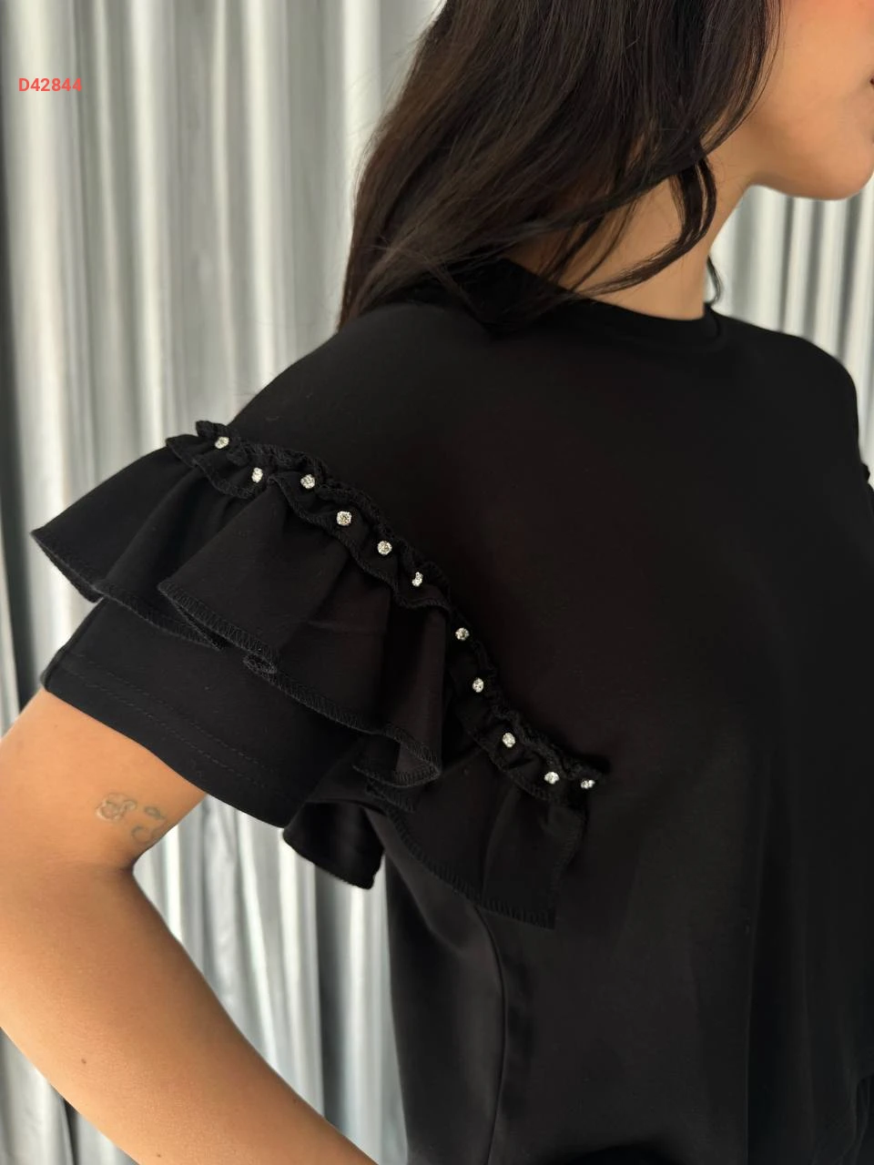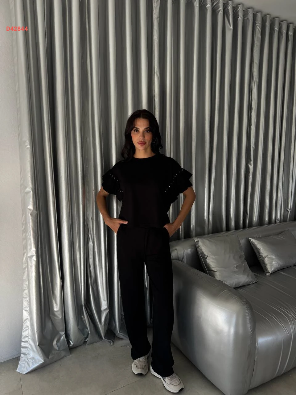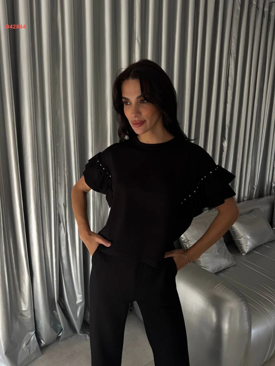 طقم بنطال سبور بأكمام مكشكشة وأحجار