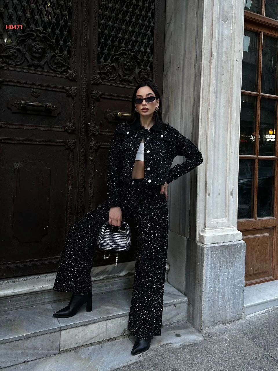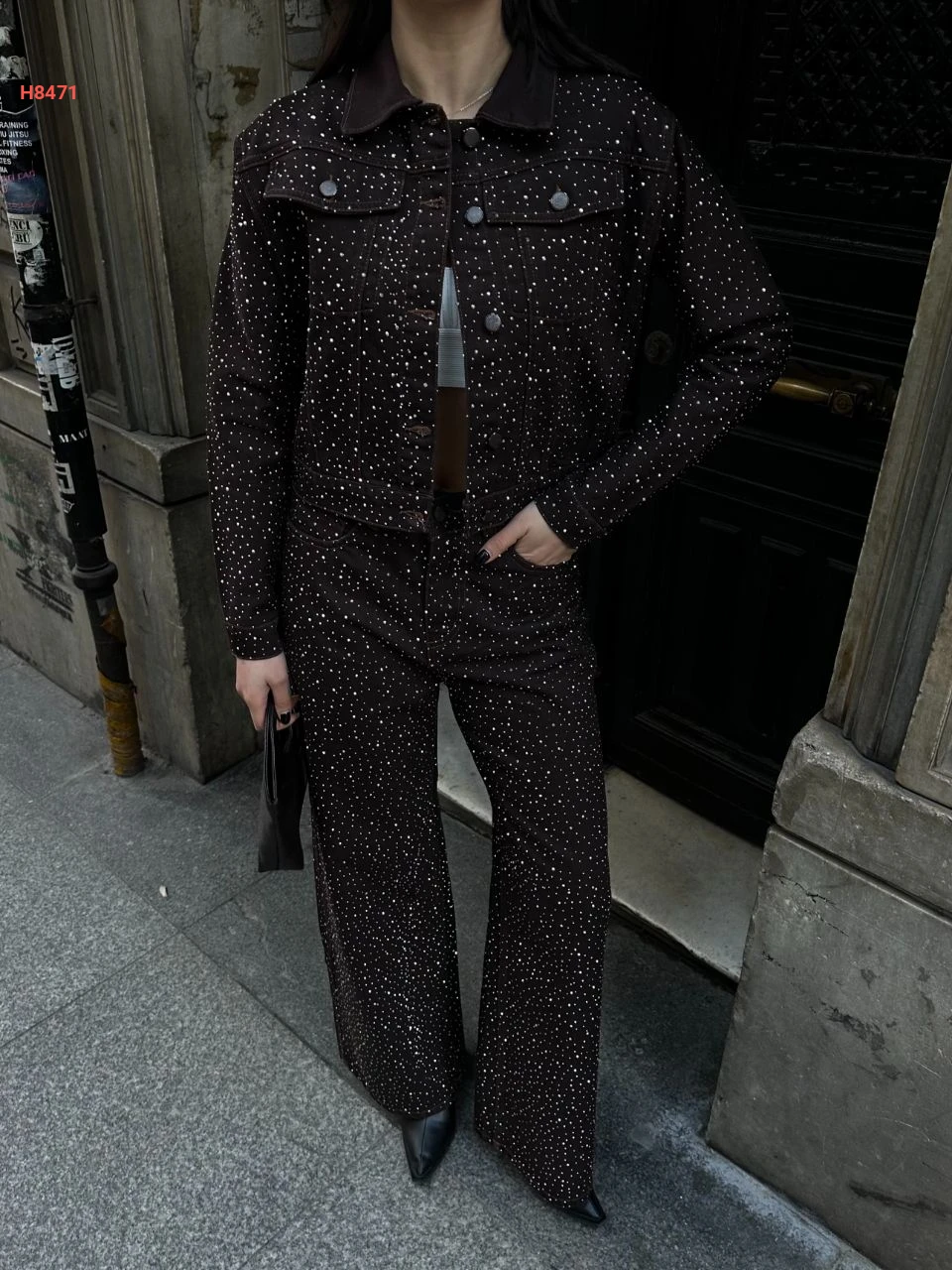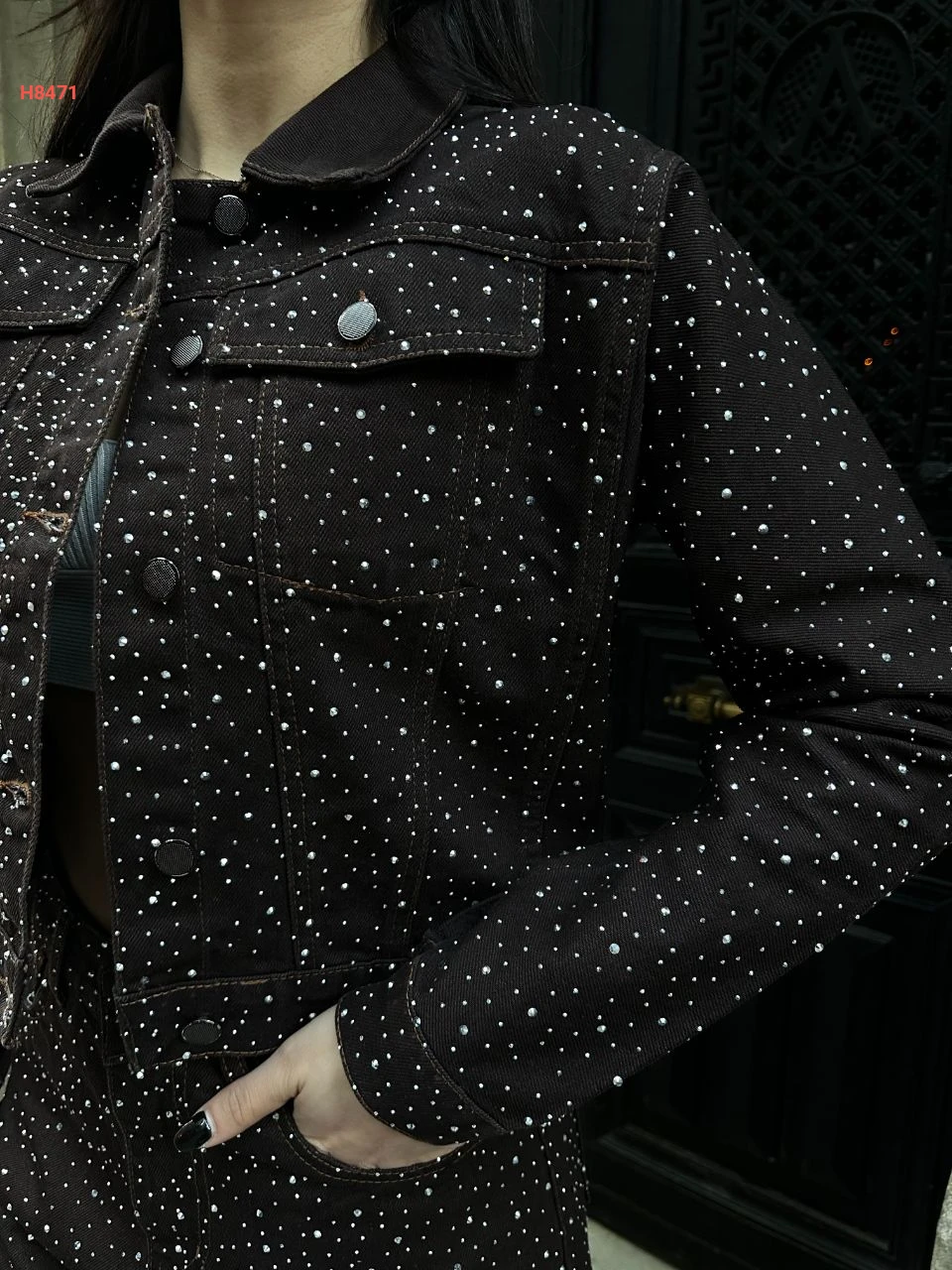 طقم بنطال جينز حجري مرصع مع جاكيت