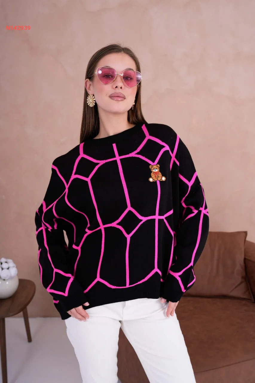 كنزة تريكو مخططة بالاسود مع طبعة دبدوب