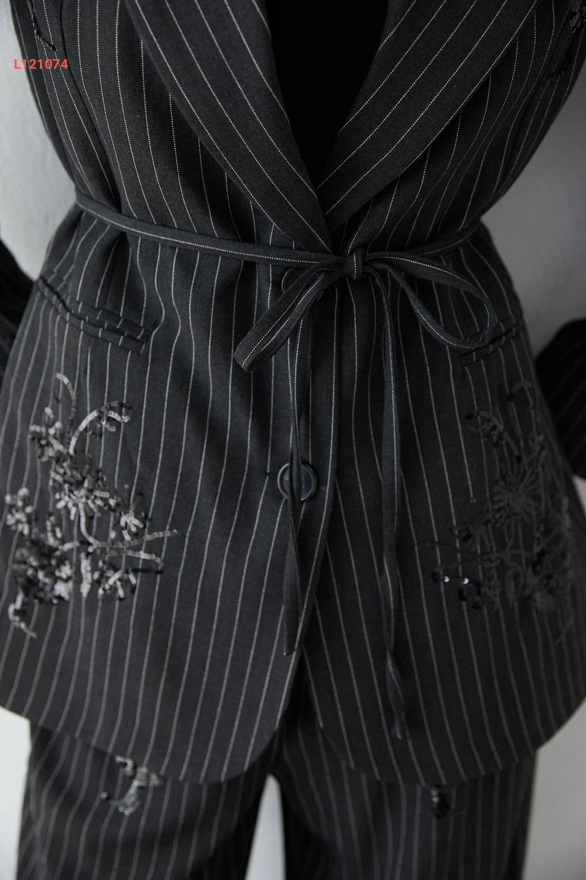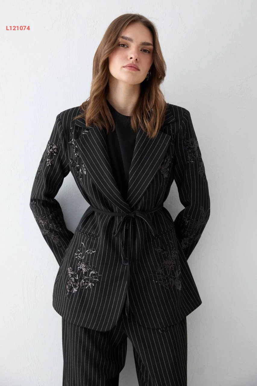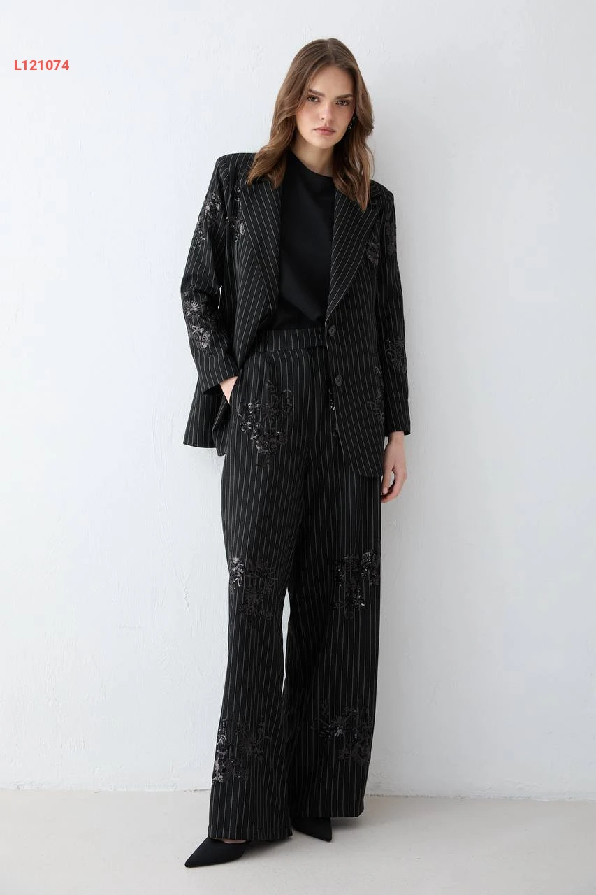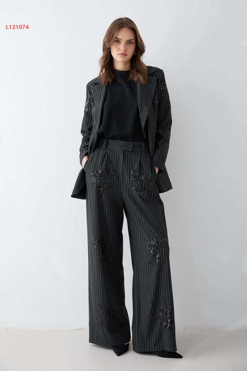 طقم بنطال مقلم وجاكيت مع تطريز بالترتر