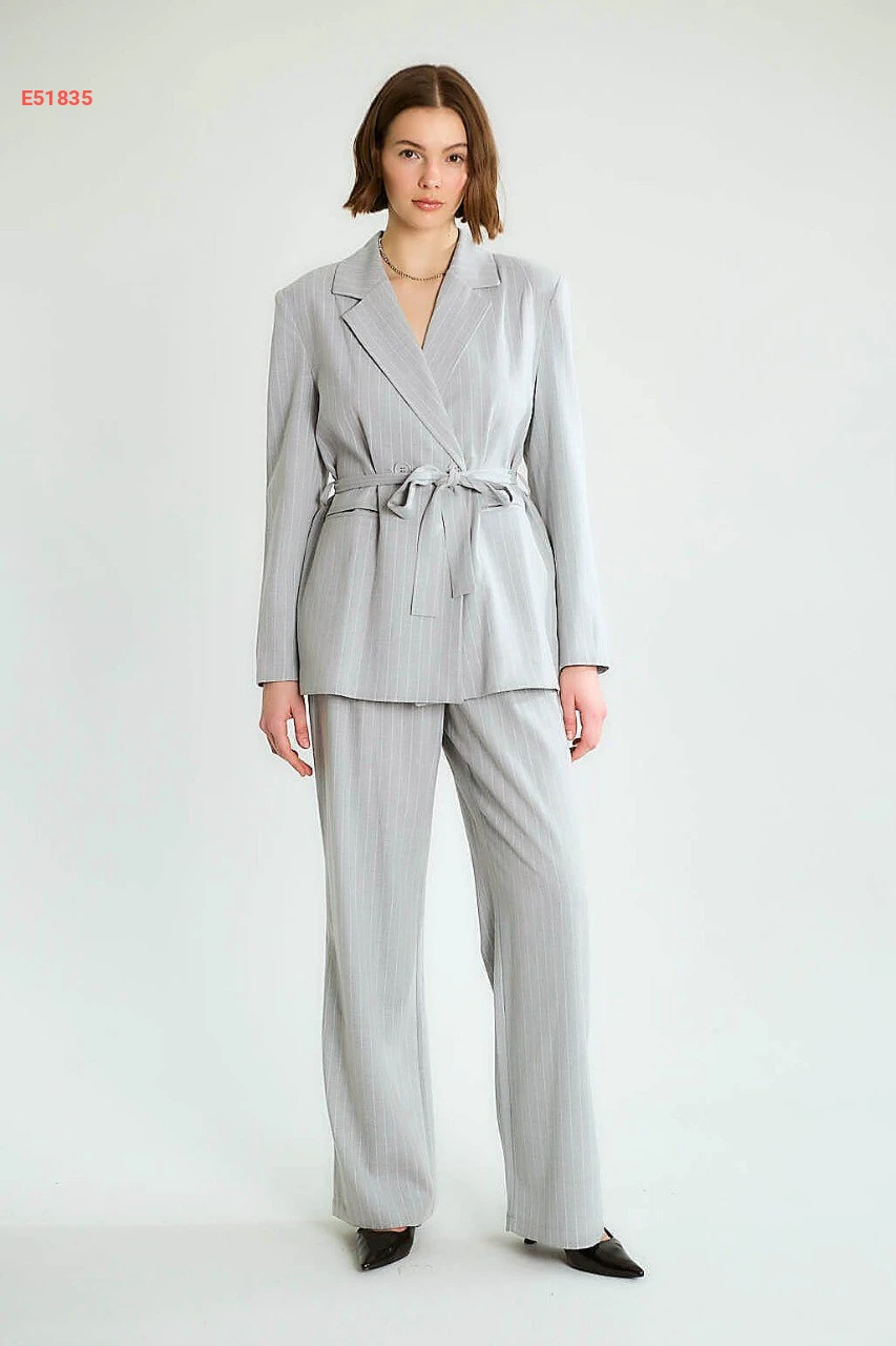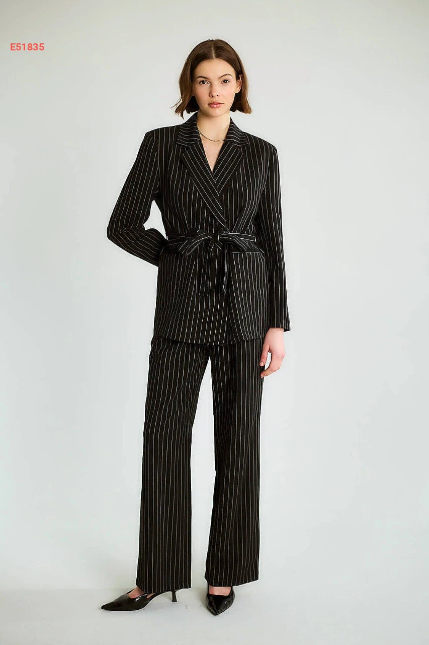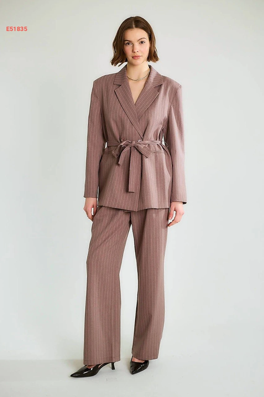 طقم بنطال مقلم وجاكيت بزنار