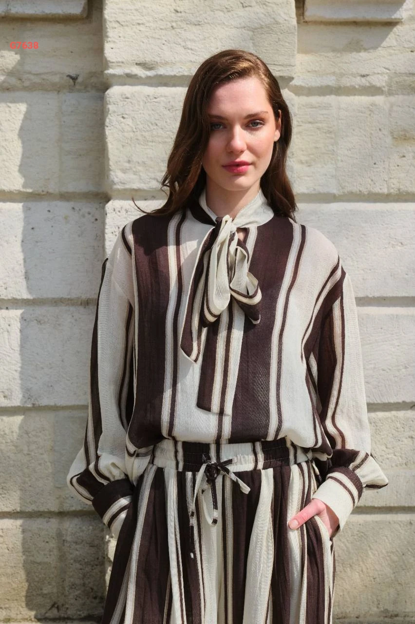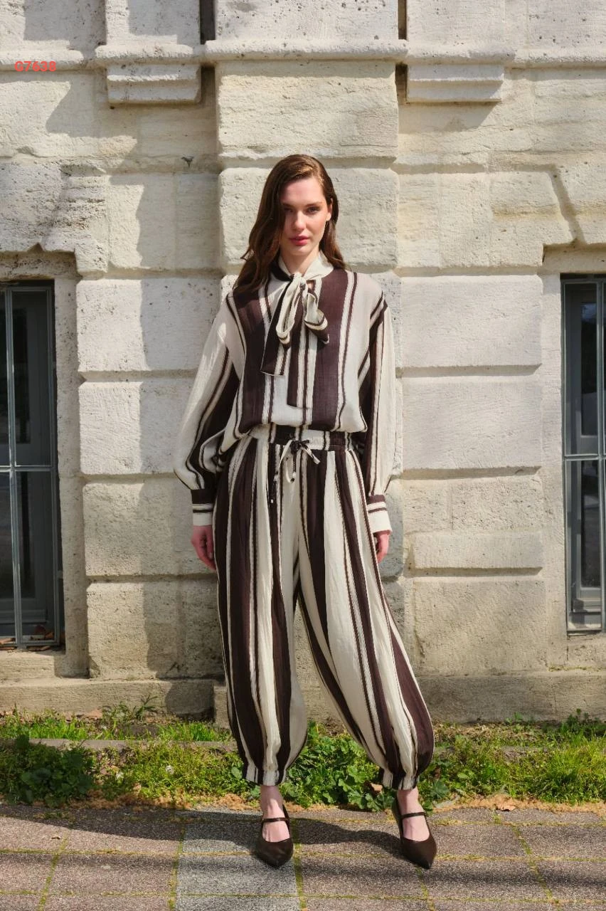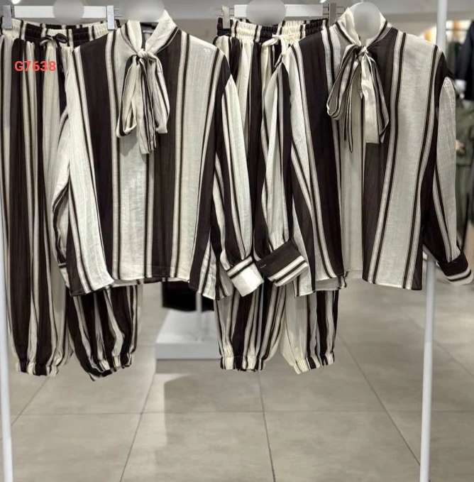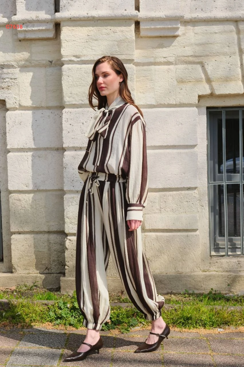 طقم بنطال مقلم وبلوزة بربطة عنق