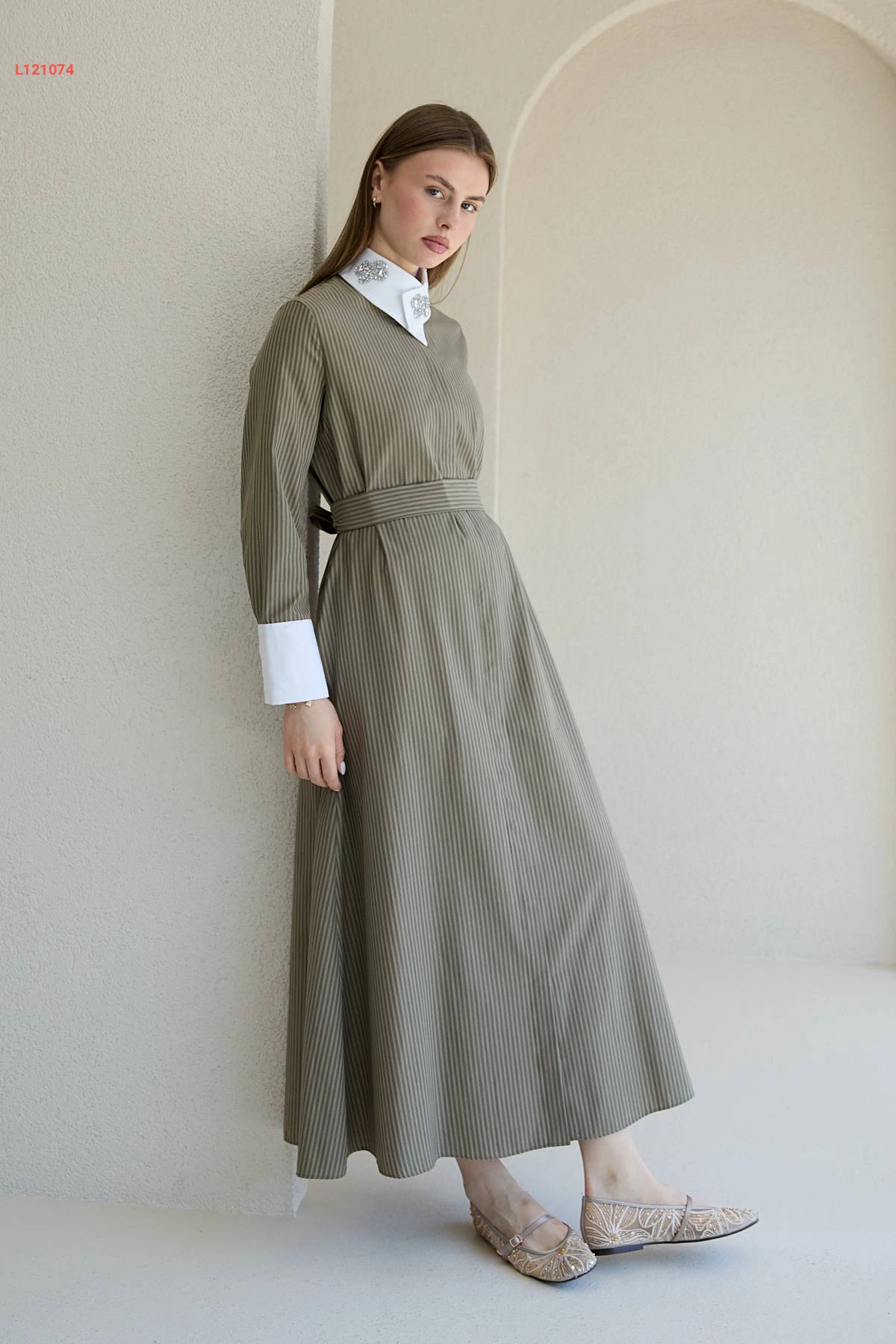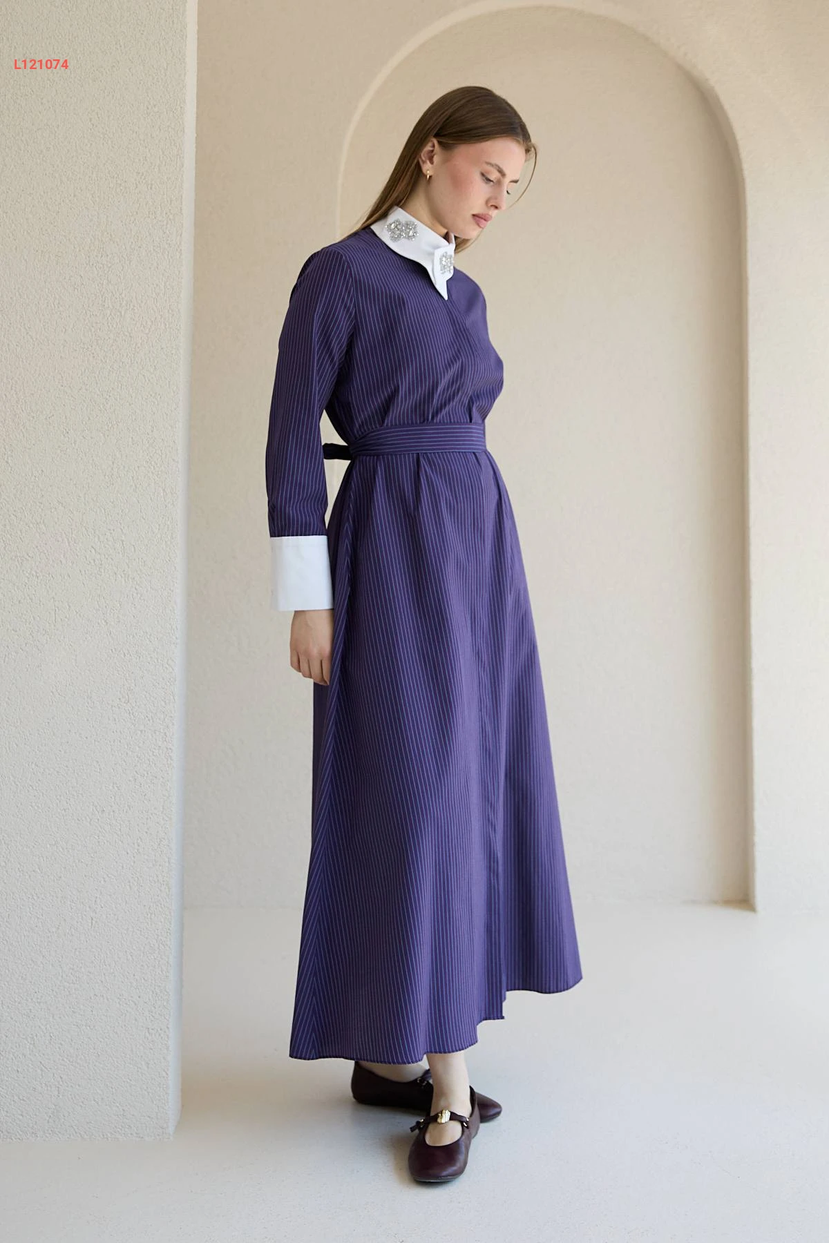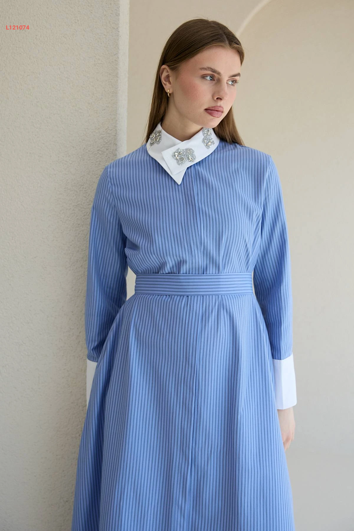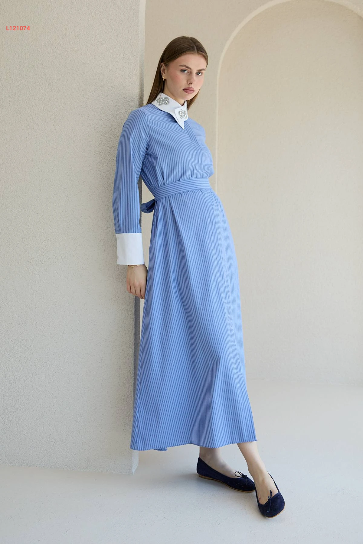 فستان بوبلين مقلم بياقة مطرزة أحجار