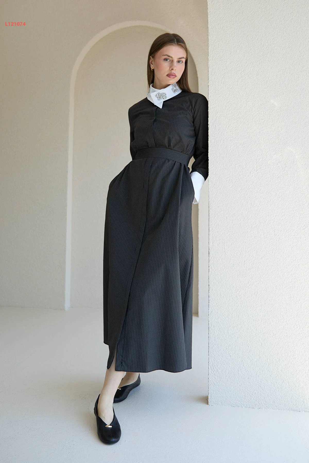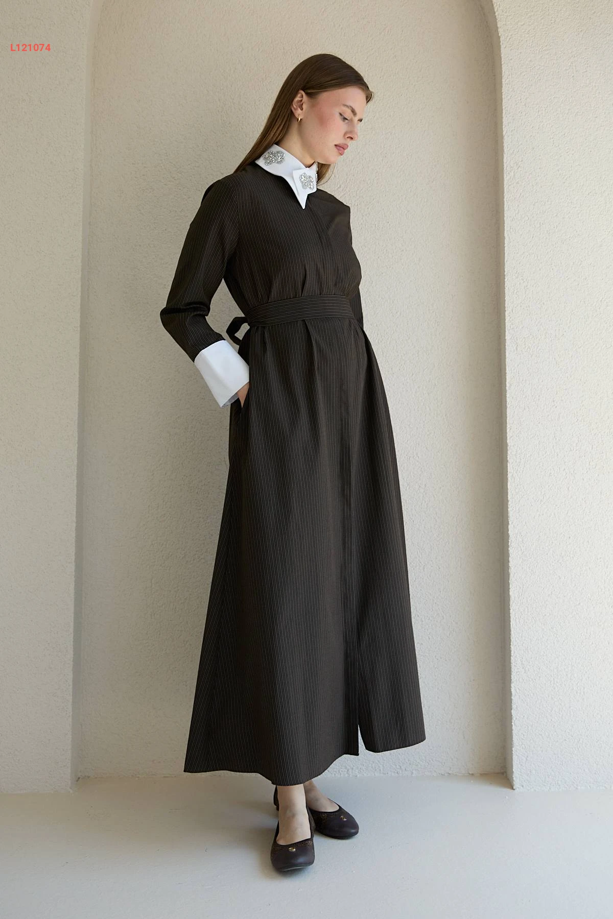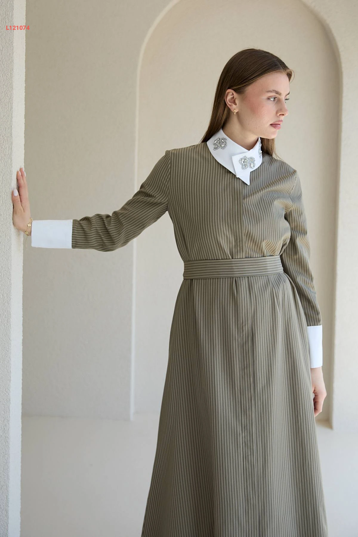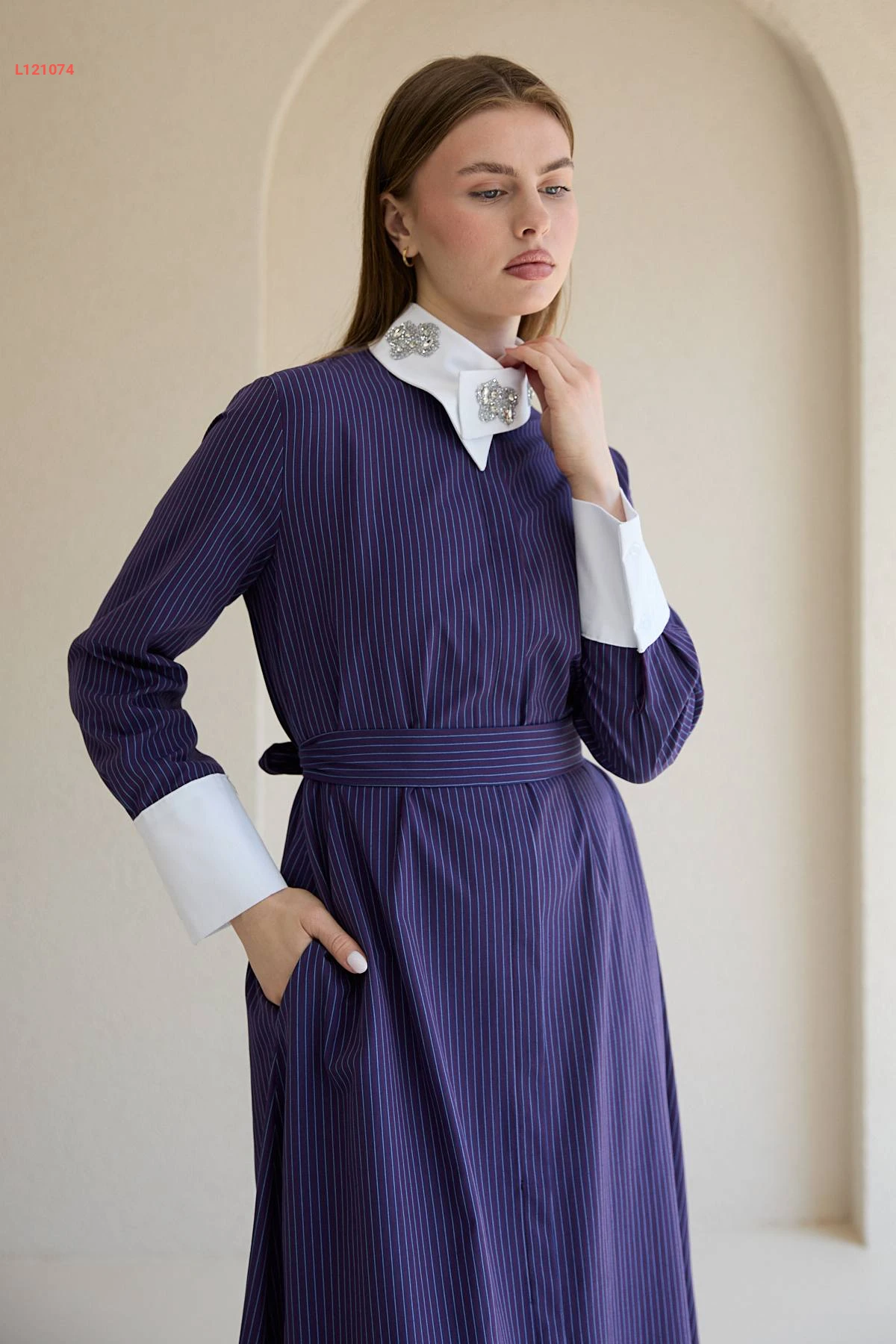 فستان بوبلين مقلم بياقة مطرزة أحجار