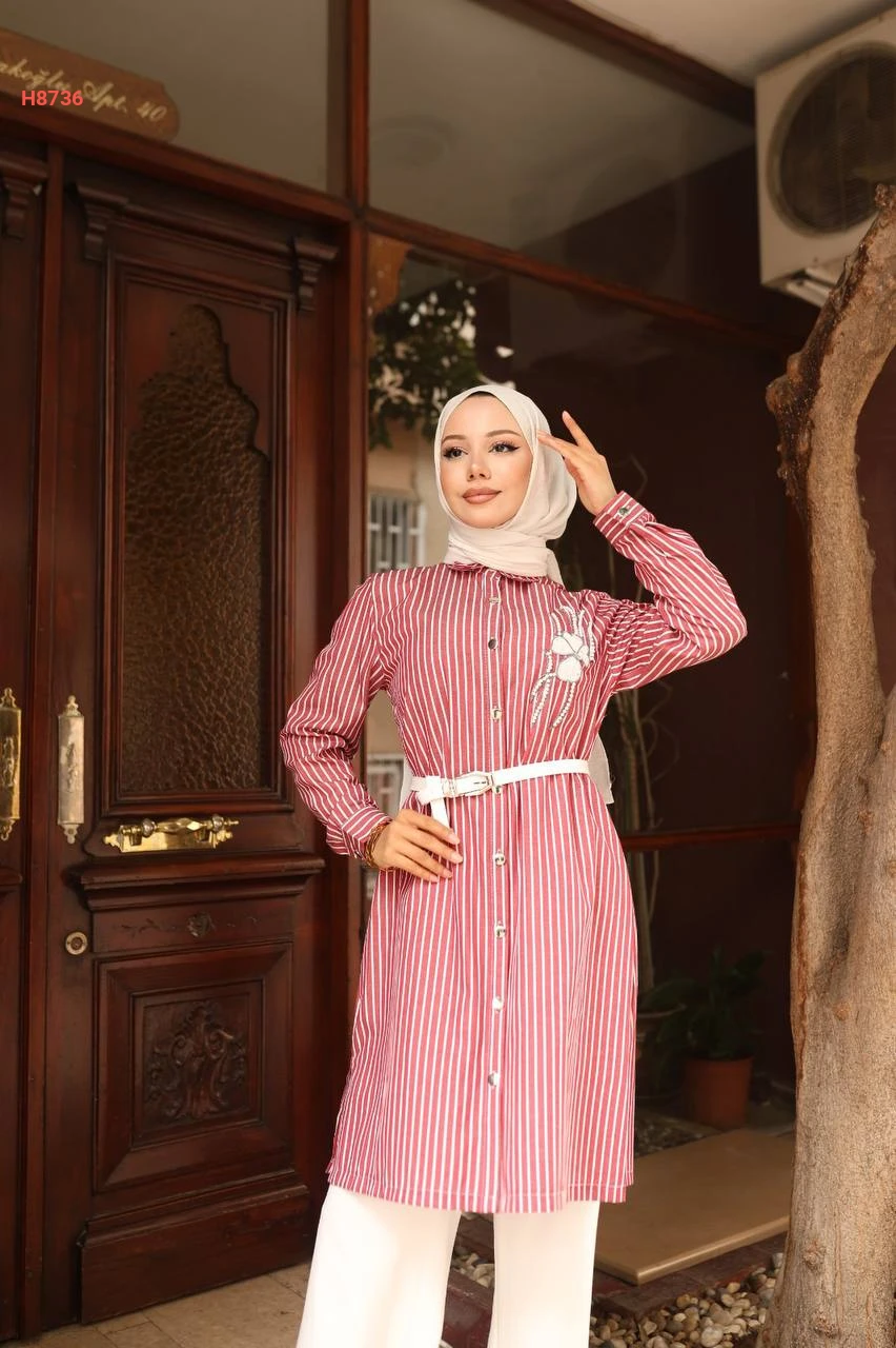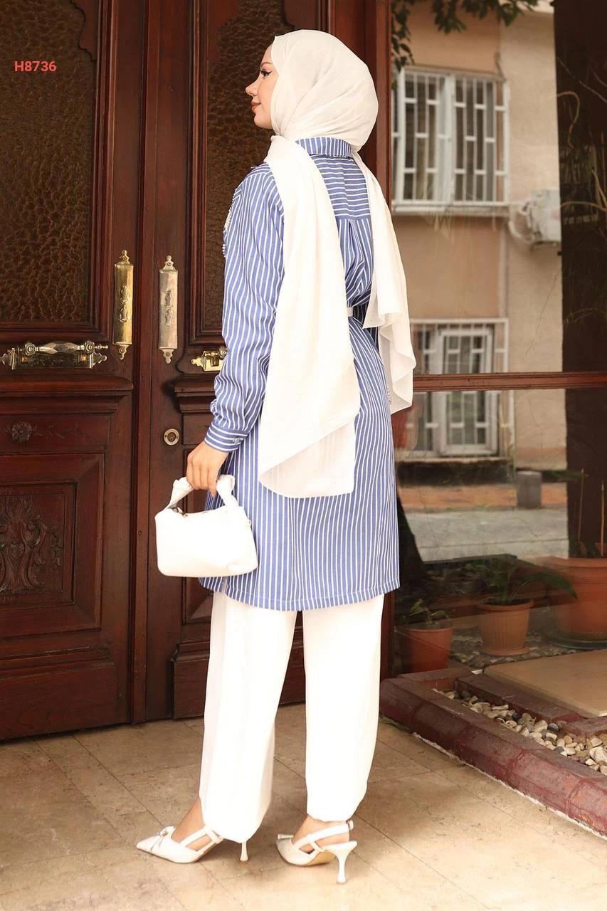 طقم قميص مقلم مع بنطال ابيض محجبات