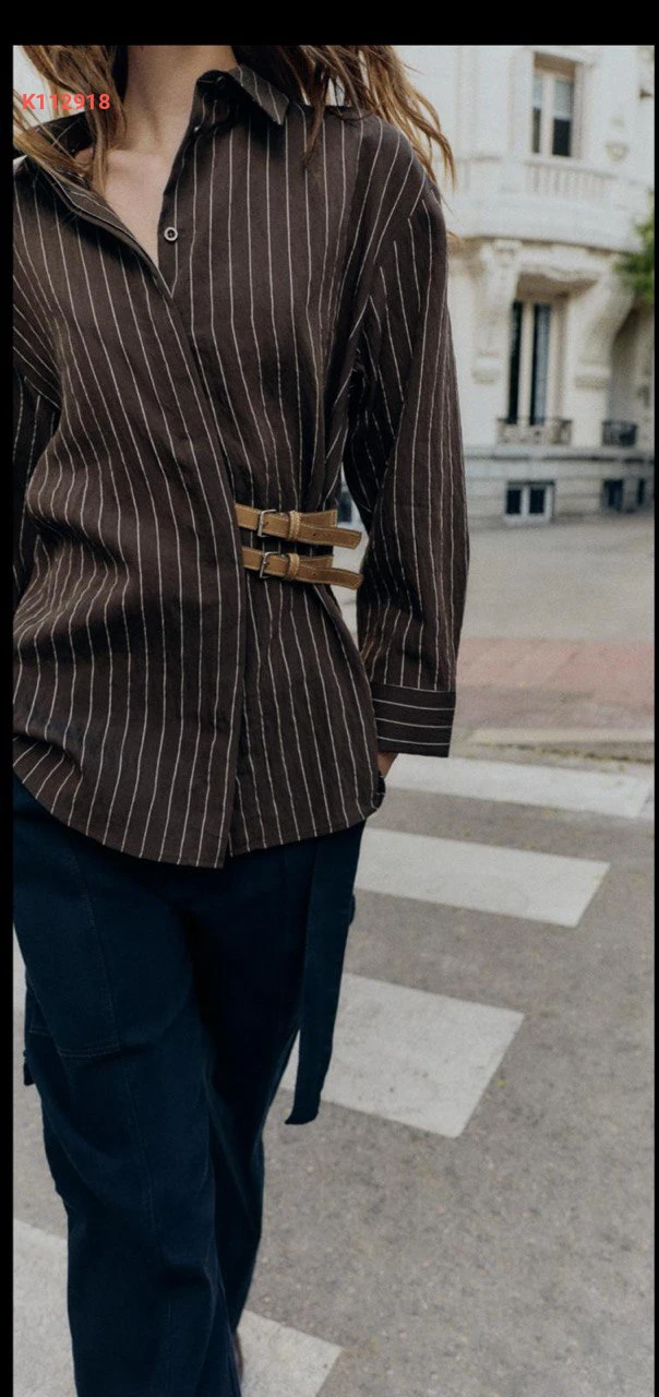 قميص مقلم بحزام جانبي مزدوج