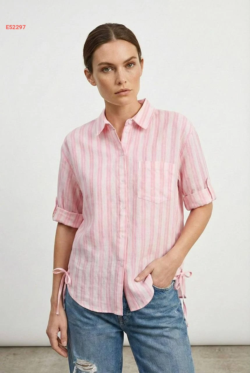 قميص مقلم بربطات جانبية وجيب