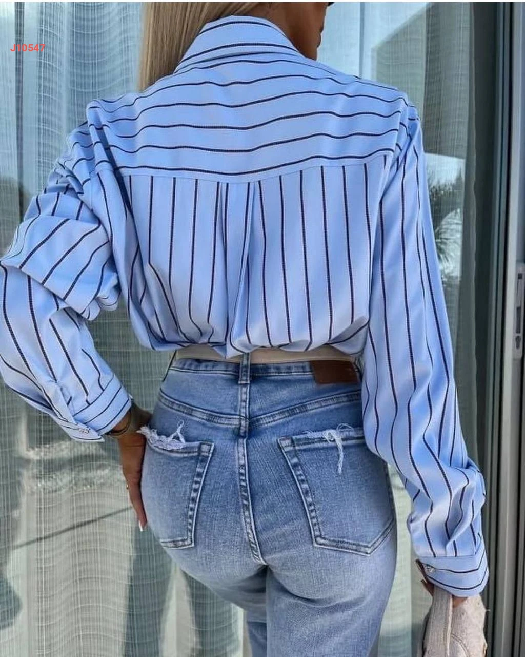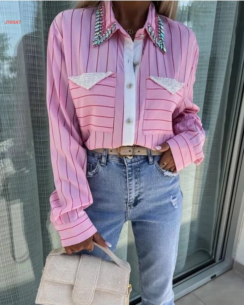 قميص زارا مقلم بجيوب وياقة مطرزة أحجار