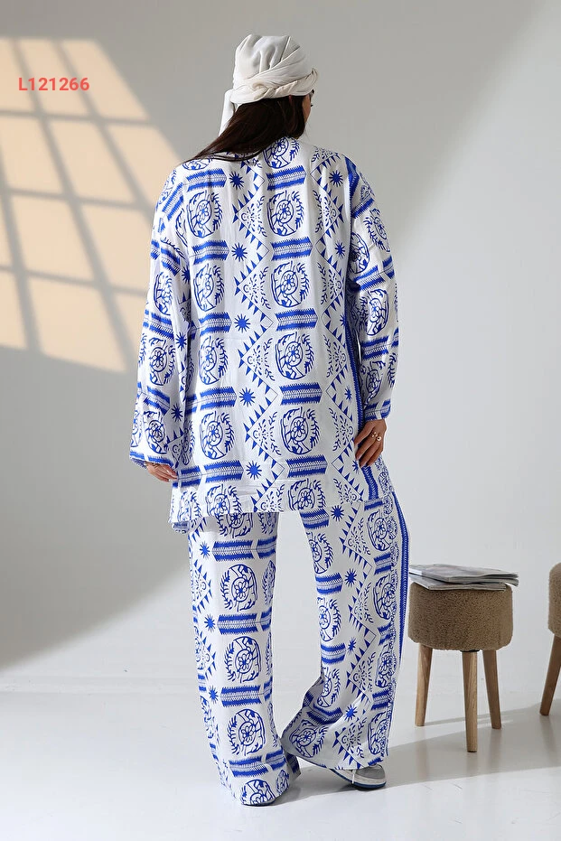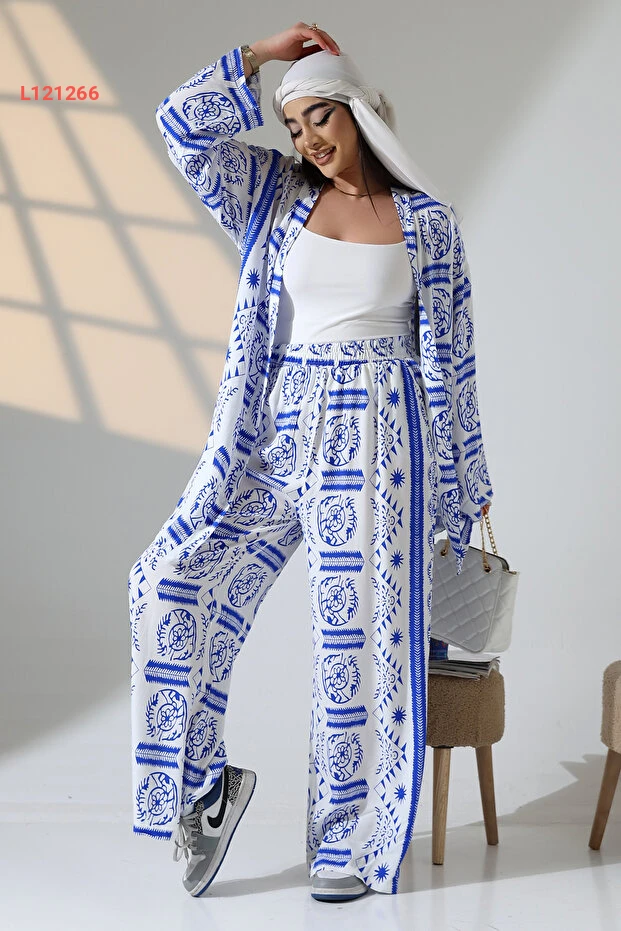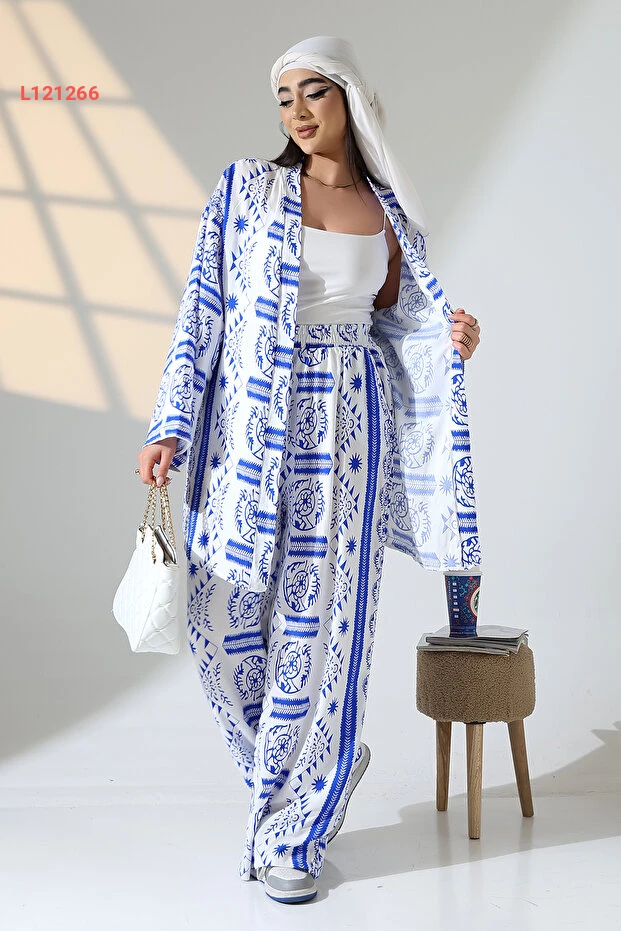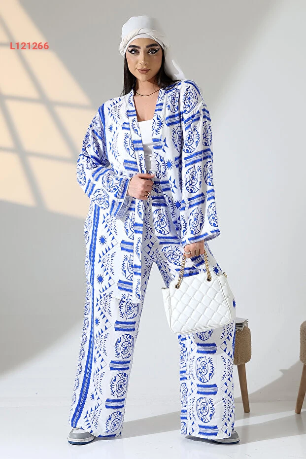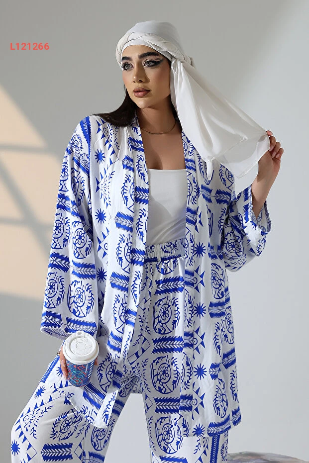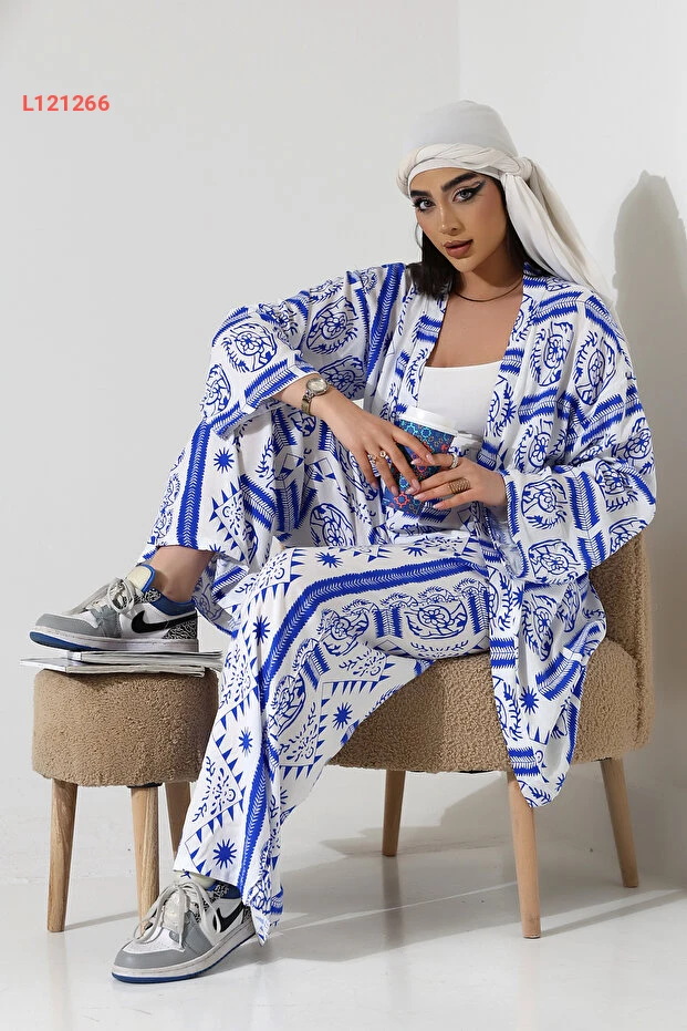 استمتع بإطلالة أنيقة ومريحة مع طقم الكيمونو ماكسي بنطلون من Forte Bella بتصميم إتنيك عصري. يتميز القماش الفاخر بتفاصيل فريدة تضيف لمسة من البهجة والتميز لأي مناسبة، بينما يوفر القص المريح حرية الحركة لتشعري بالثقة والجاذبية في كل خطوة.