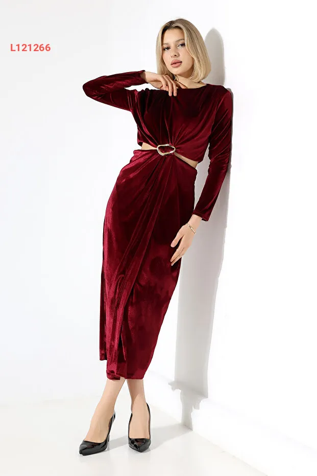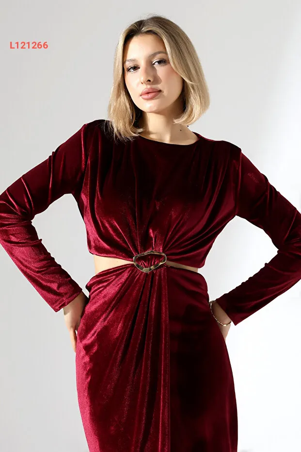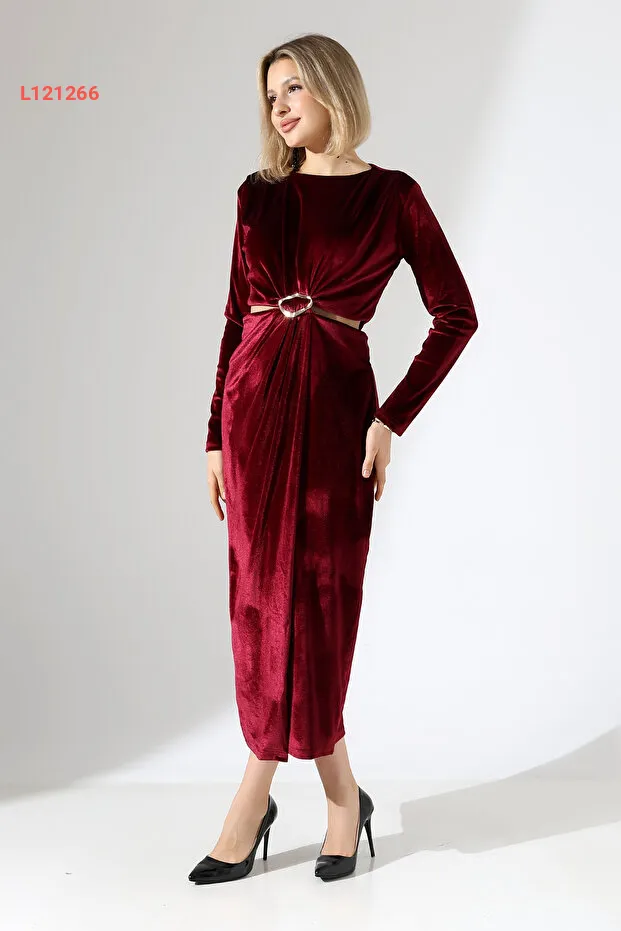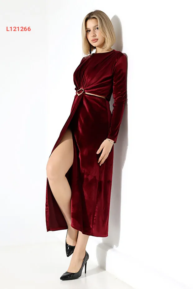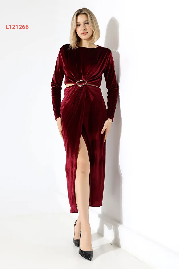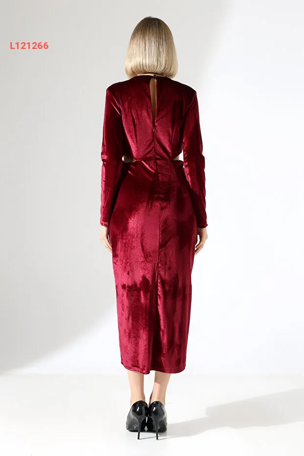 فستان مخمل سادة ومزود بفتحتين عند الخصر
