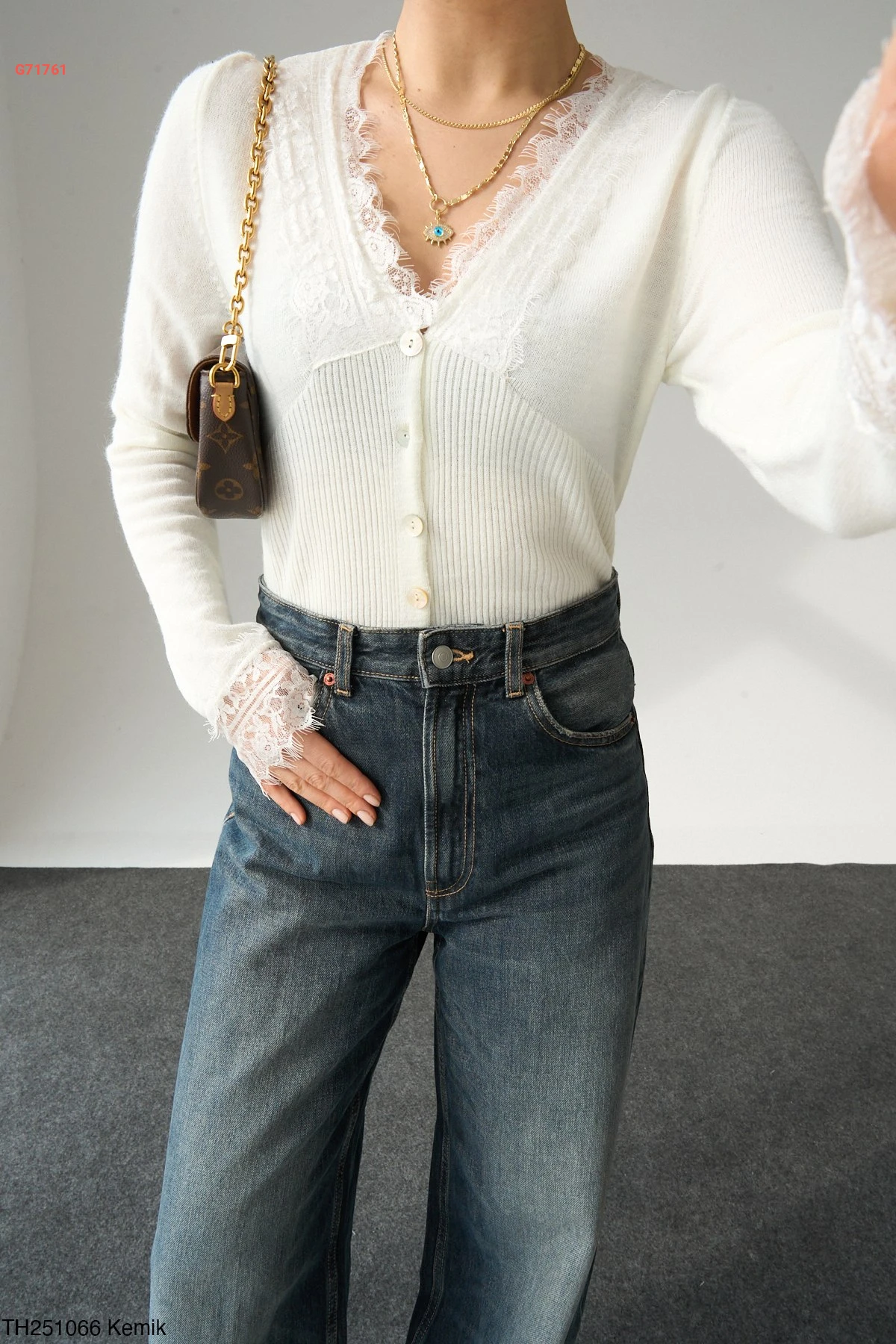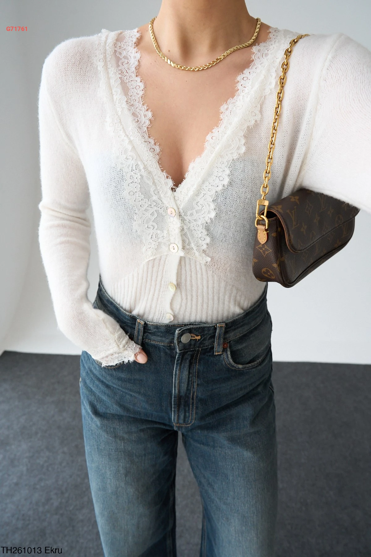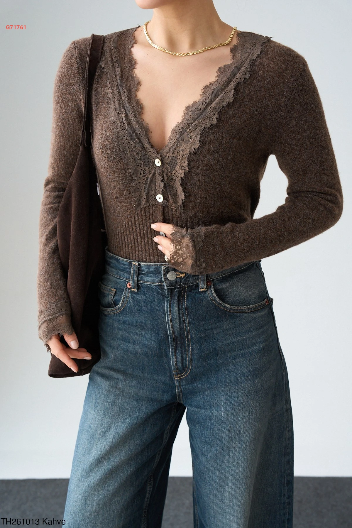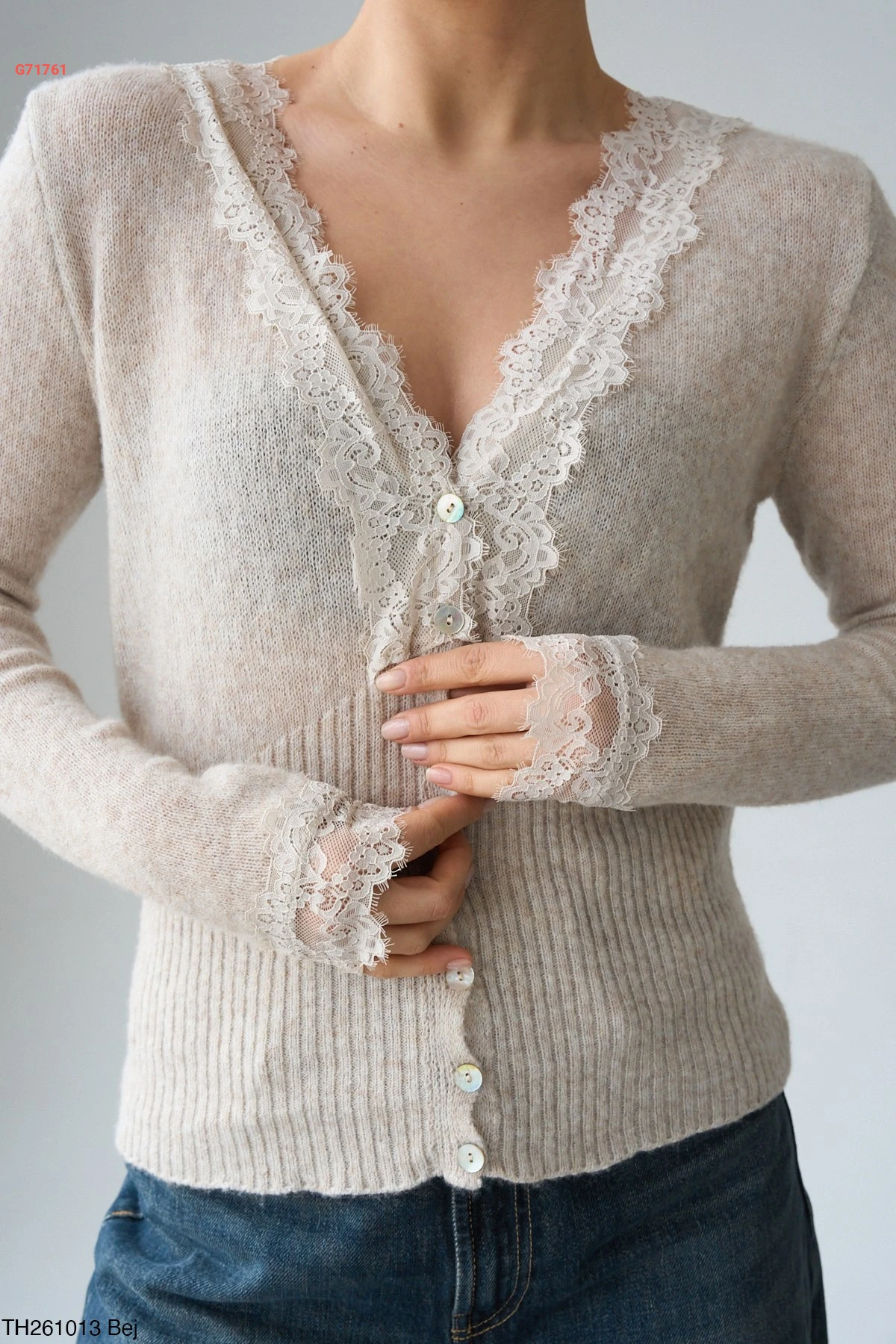 بلوزة تريكو بأزرار وتفاصيل دانتيل أنيقة