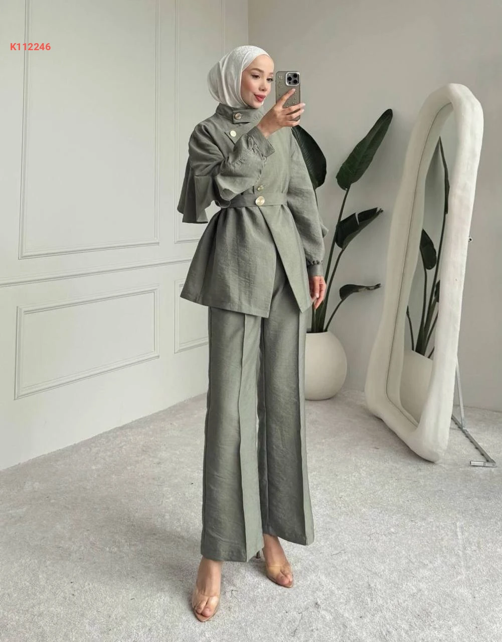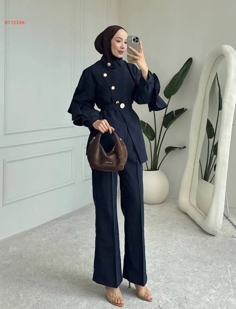 طقم بنطال وقميص بأزرار دهبي وحزام