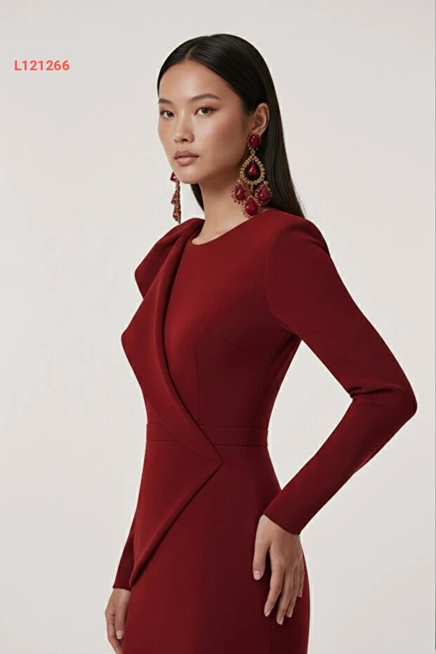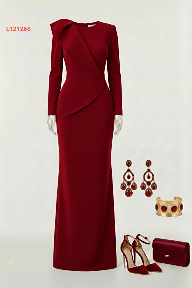 فستان سهرات بوردو بتصميم سلطان إكشيوغلوا مع تأثير شدّ الجسم