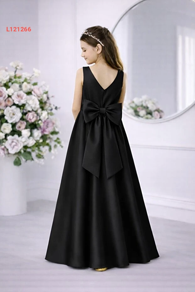 فستان ساتان أسود بياقة دائرية للأطفال - للعيد أو حفلة التخرج
