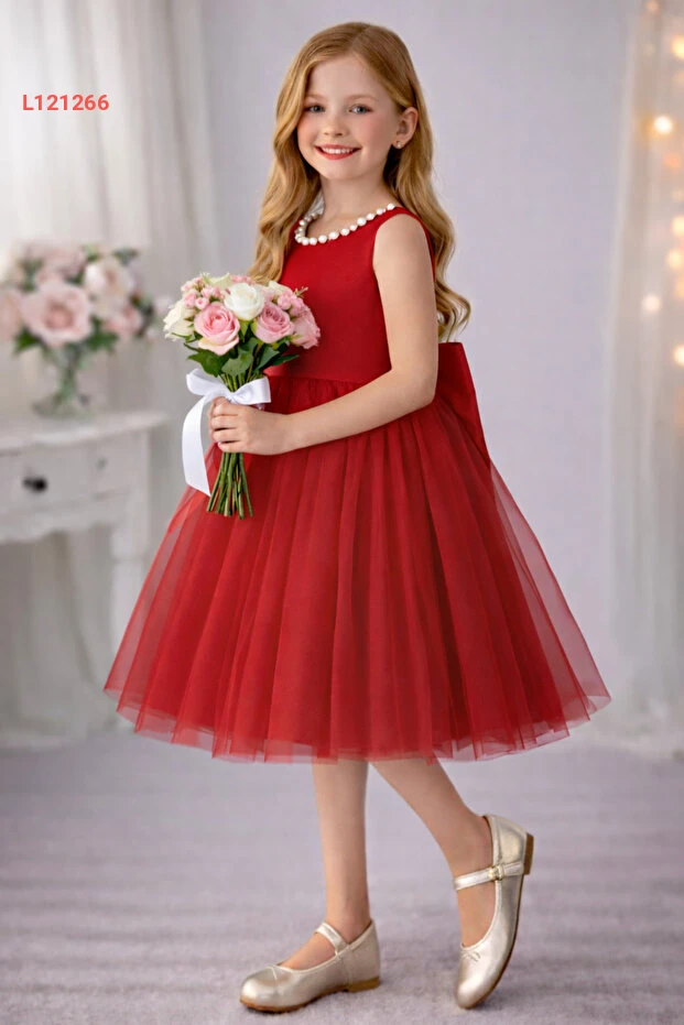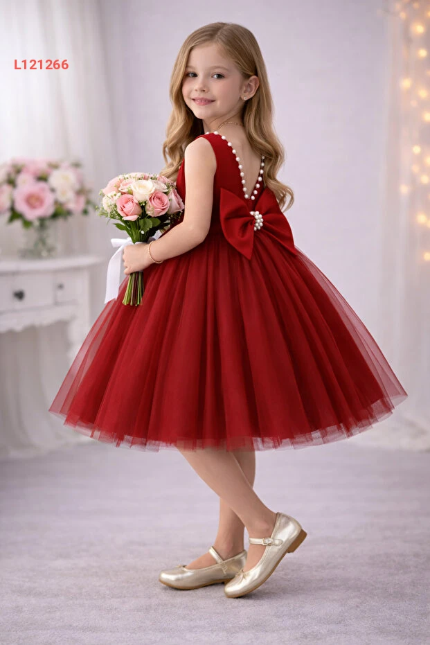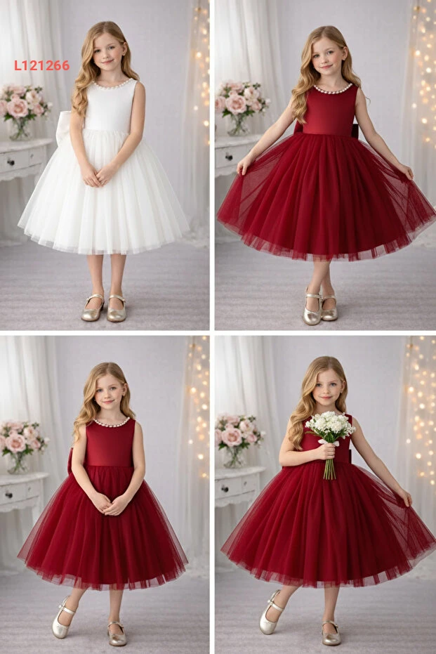 فستان سياحي للأطفال بتصميم ياقات من اللؤلؤة بموديل من سونيه، الجزء العلوي من الساتان والتنورة الفخمة من التول.
