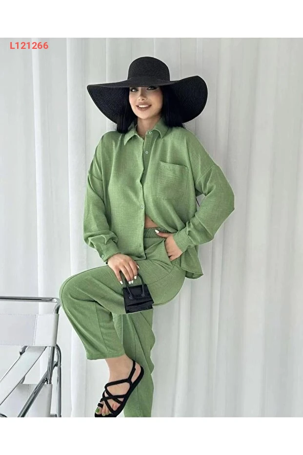 استمتعي بإطلالة أنيقة وجذابة مع طقم القميص والسروال الأخضر المكون من كتان عالي الجودة. تصميمه العصري يجمع بين الراحة والأناقة، مما يجعله مثالياً للارتداء اليومي أو في المناسبات الخاصة. احصلي على لمسة من العصرية مع ذلك الطقم الذي يبرز أنوثتك في كل مكان!