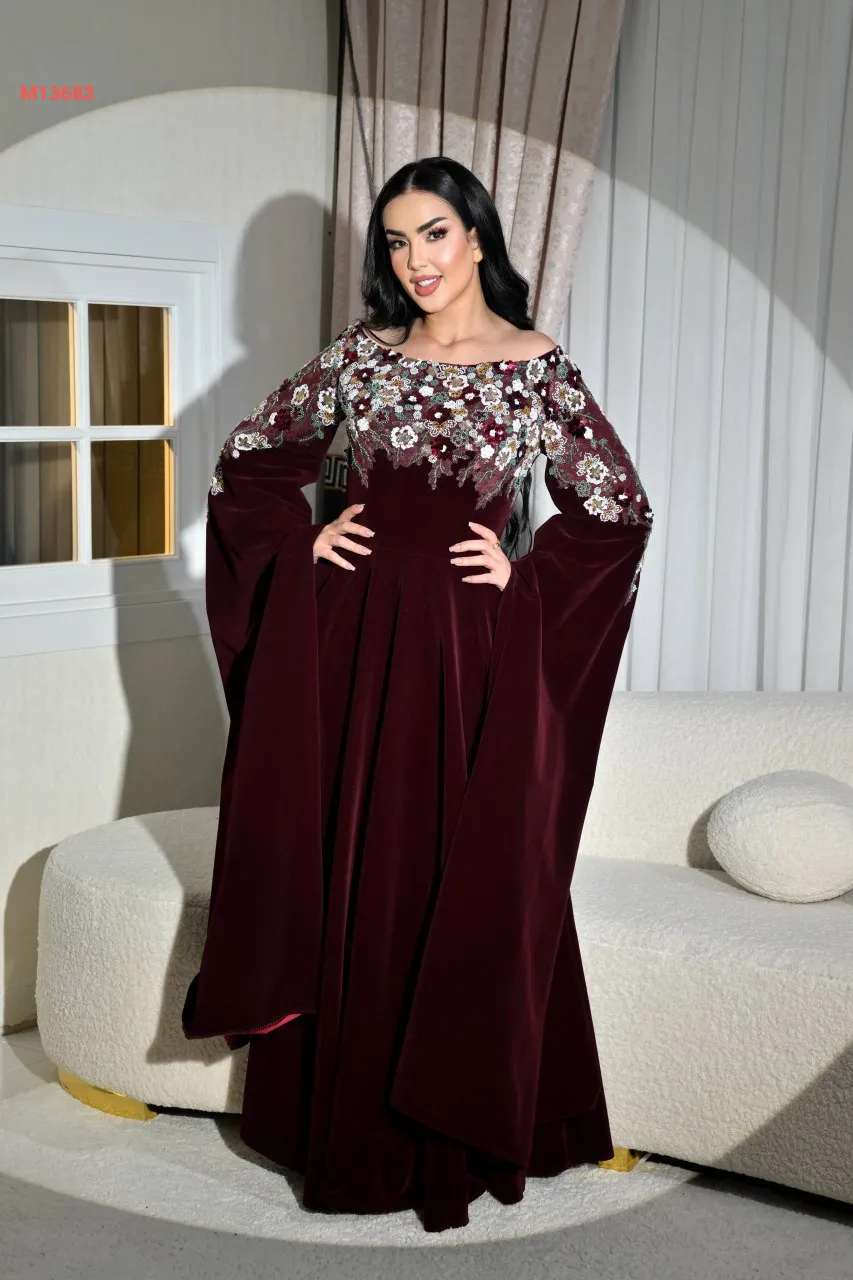 <p>فستان مخمل بأكمام عريضة، مطرز عند الصدر والكتف بسيلان والخرز </p><p>متعدد الألوان </p><p><br></p>