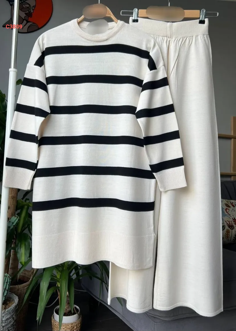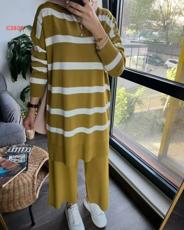 طقم بنطال تريكو وتونيك مخطط