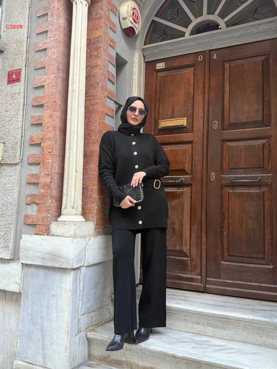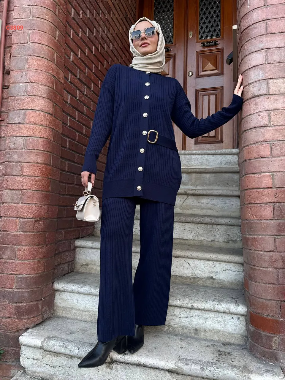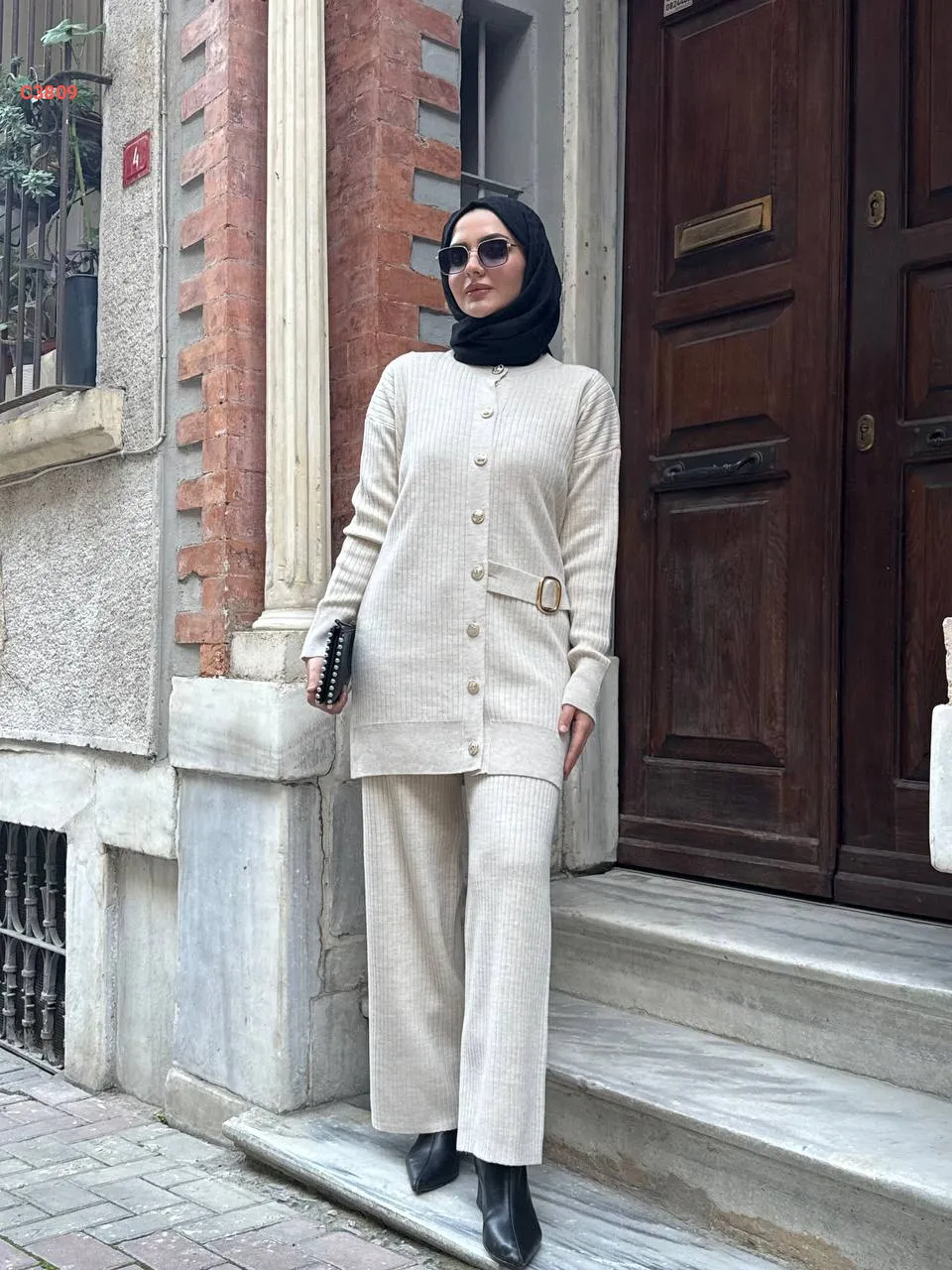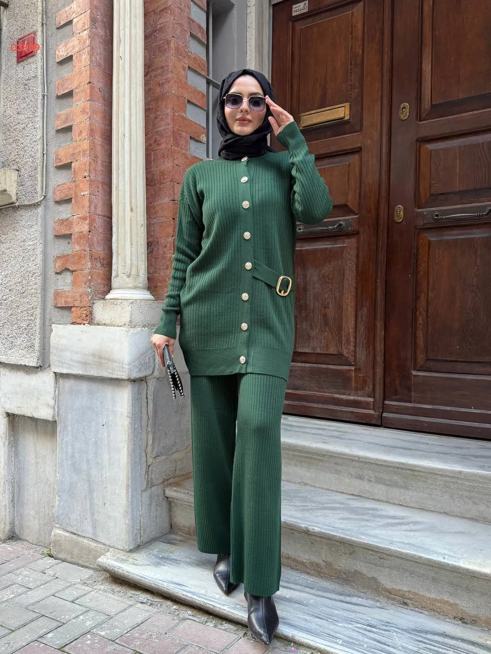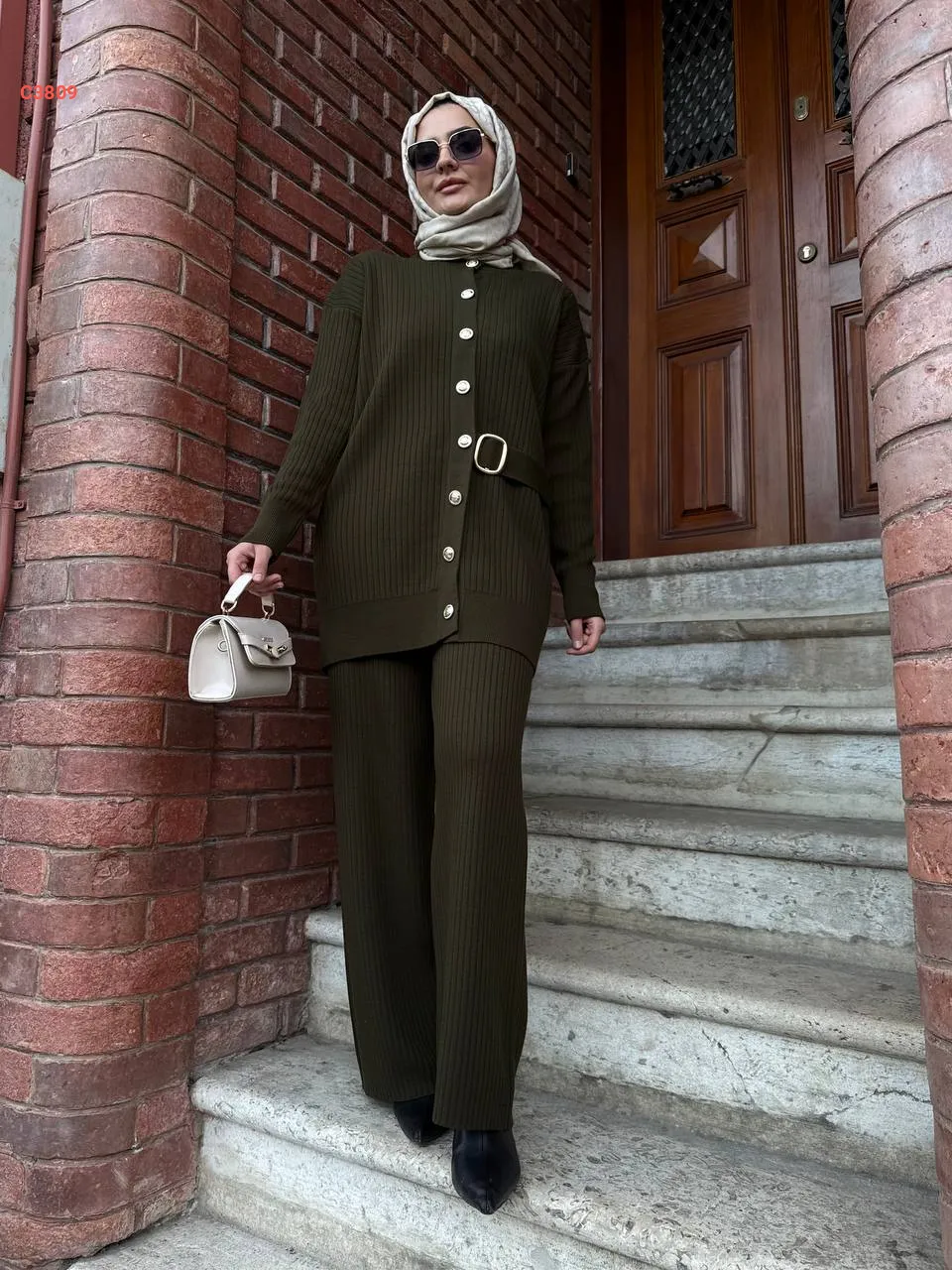 طقم بنطال تريكو وجاكيت بحزام جانبي
