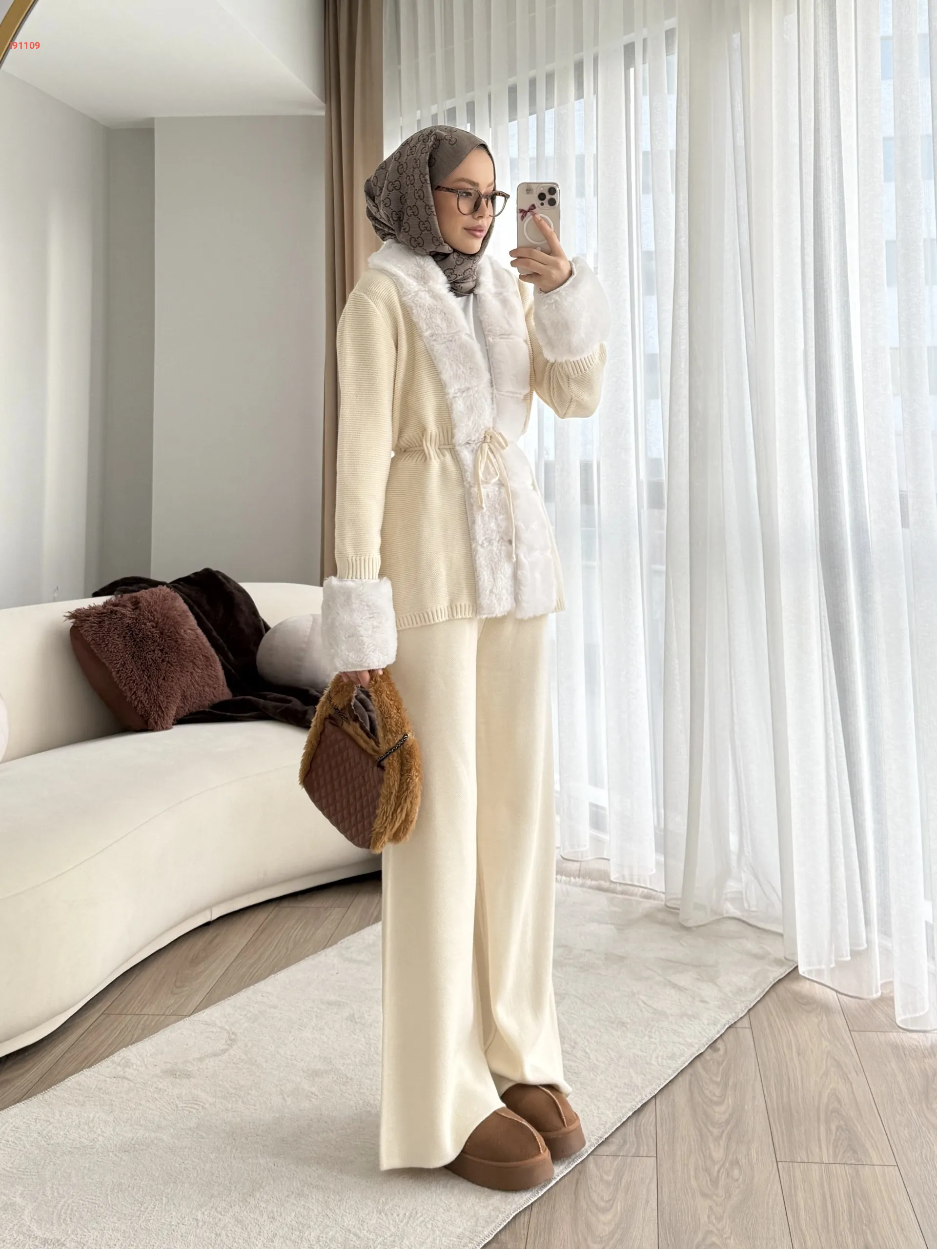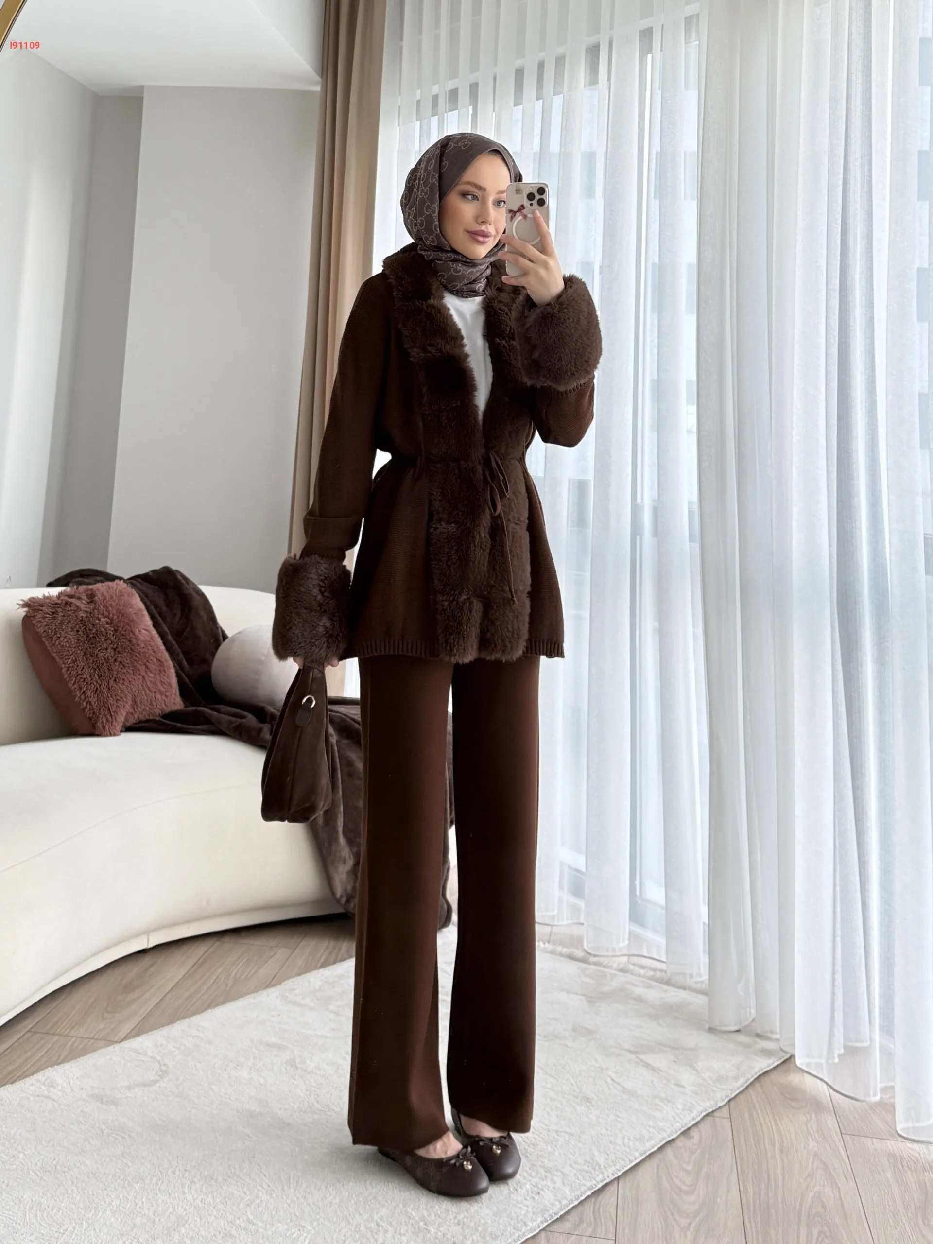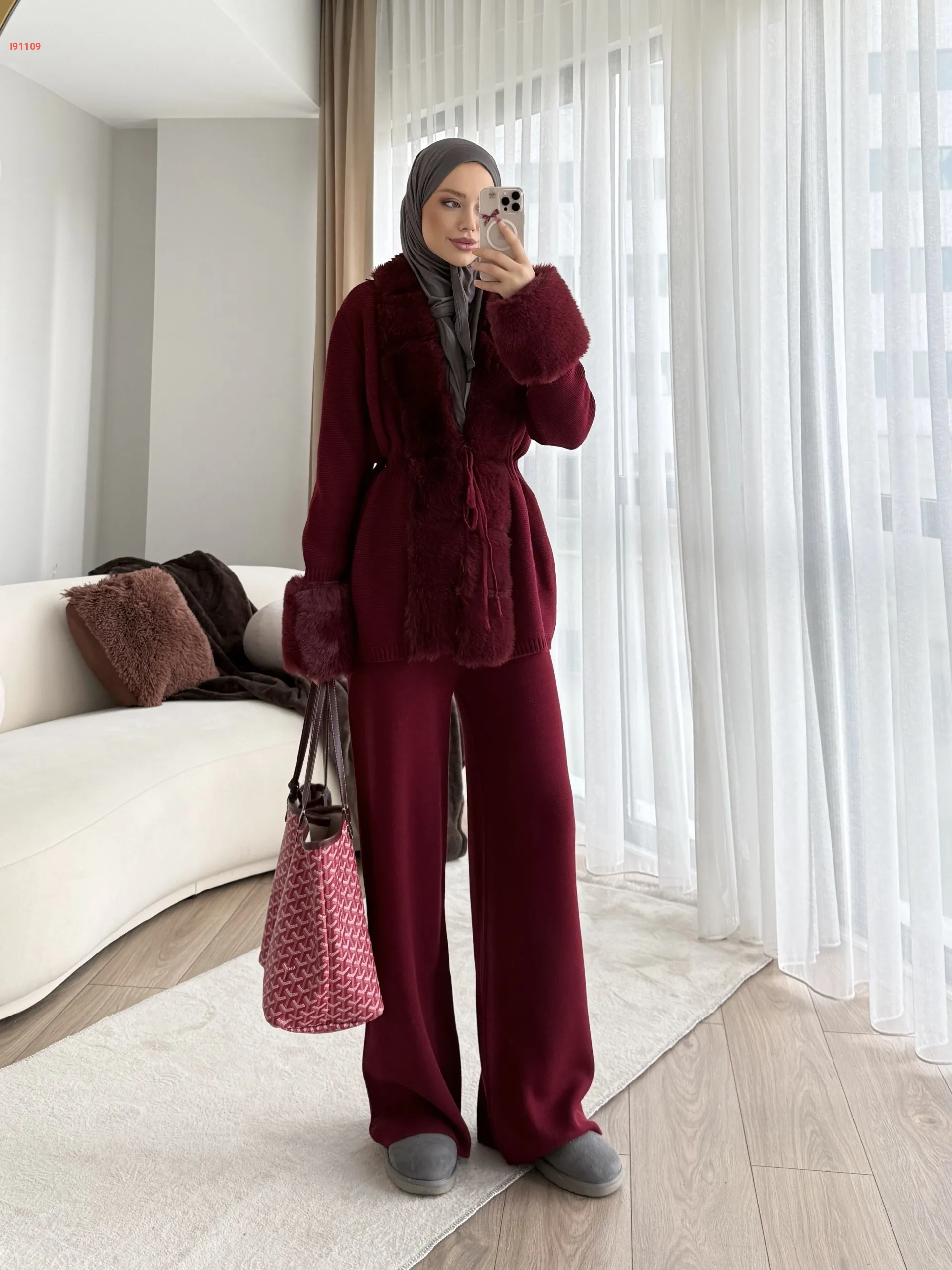 طقم بنطال تريكو وجاكيت بفرو