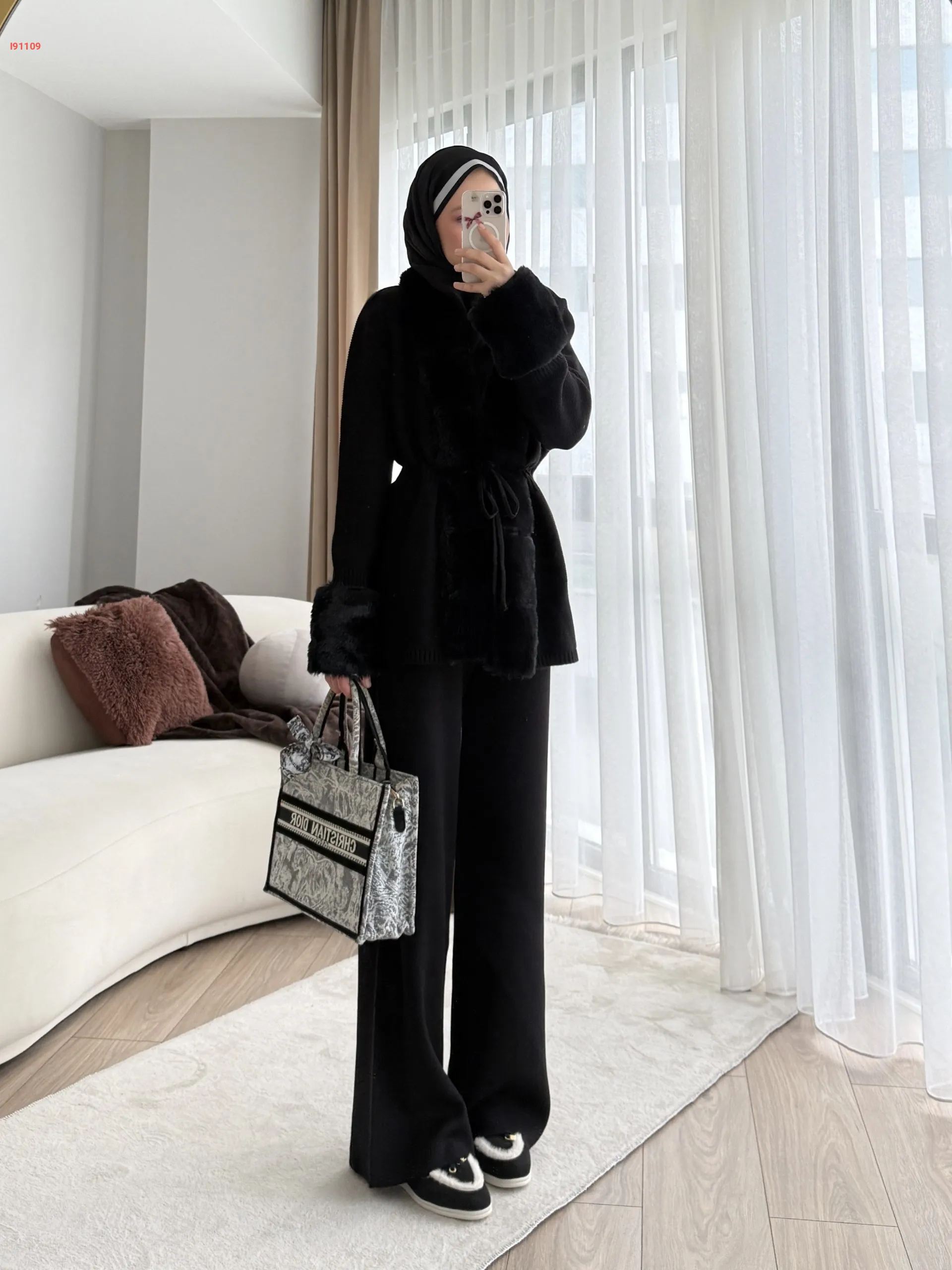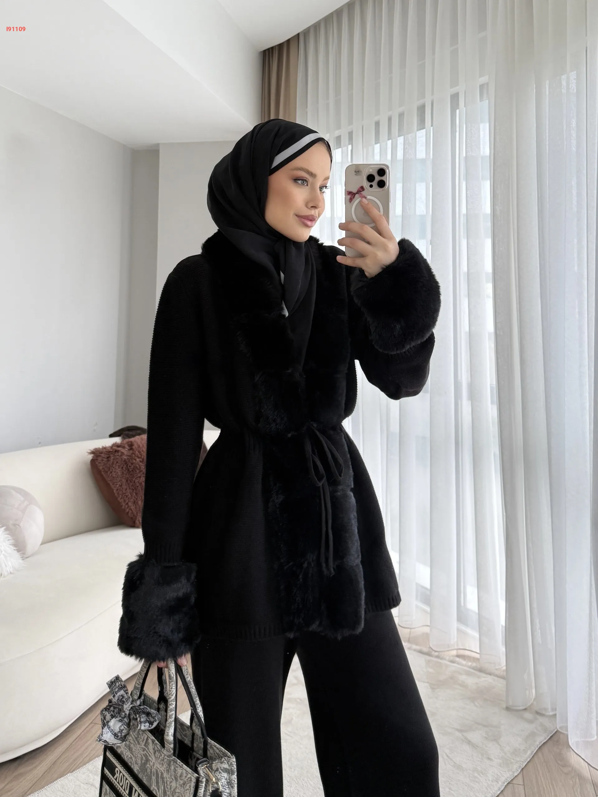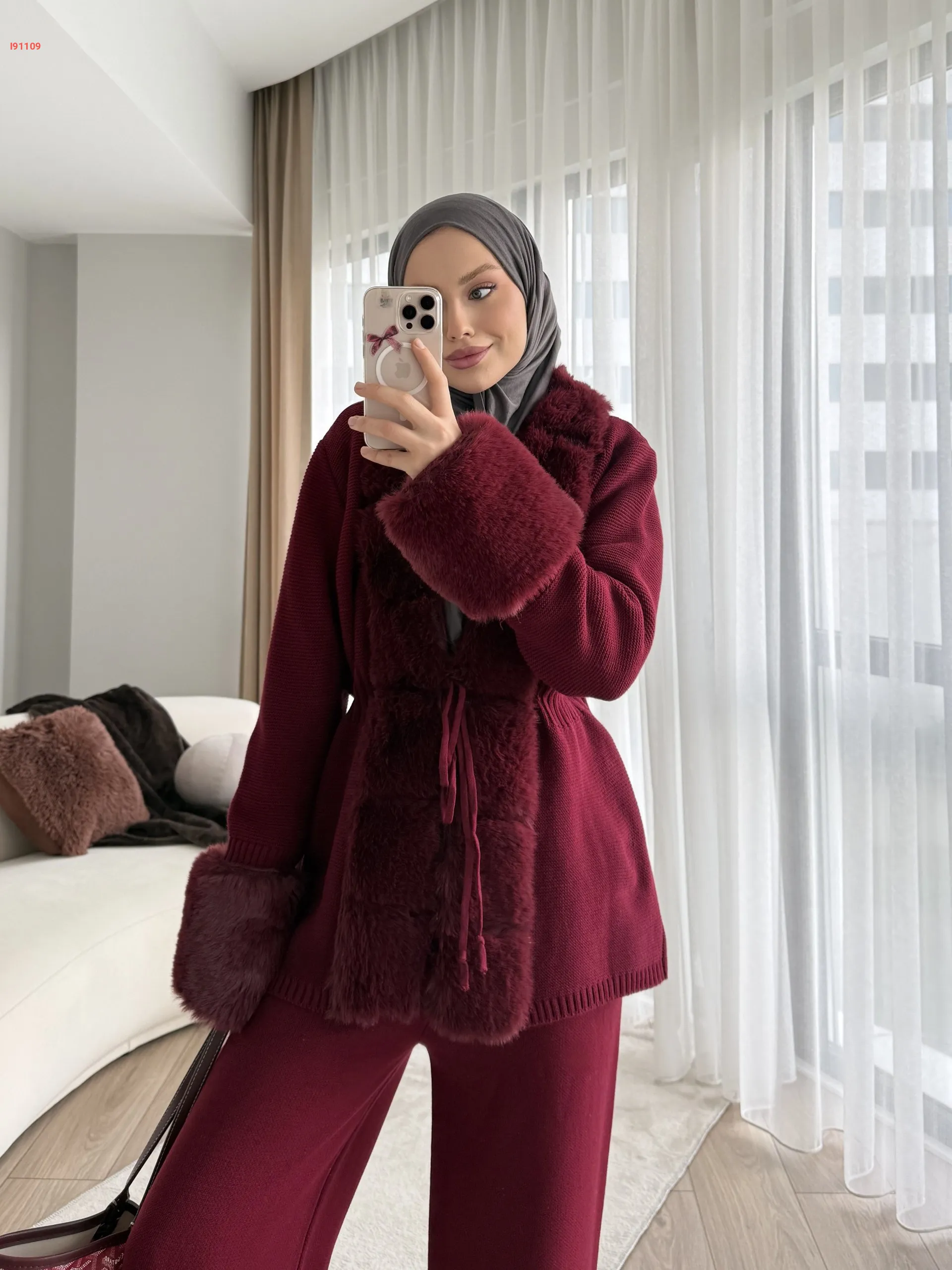 طقم بنطال تريكو وجاكيت بفرو
