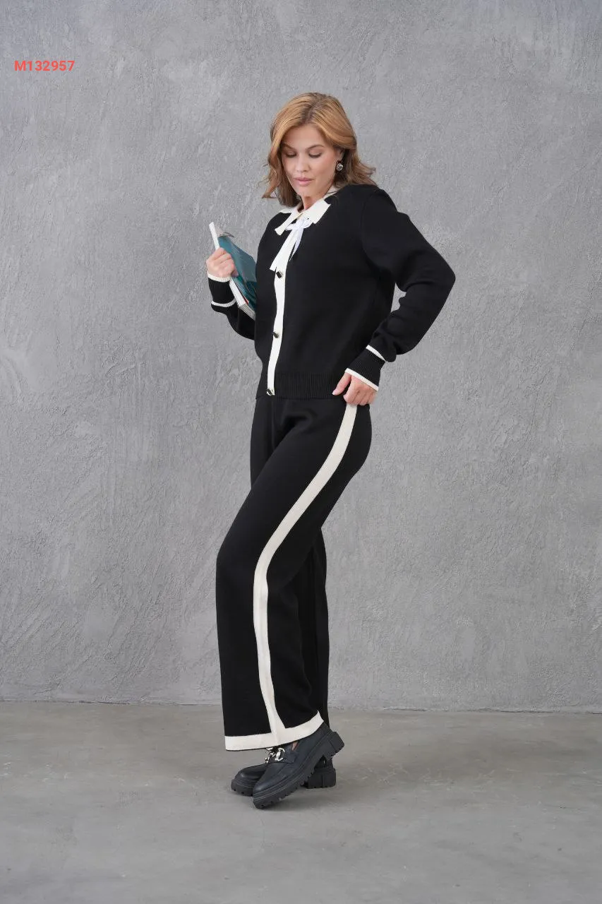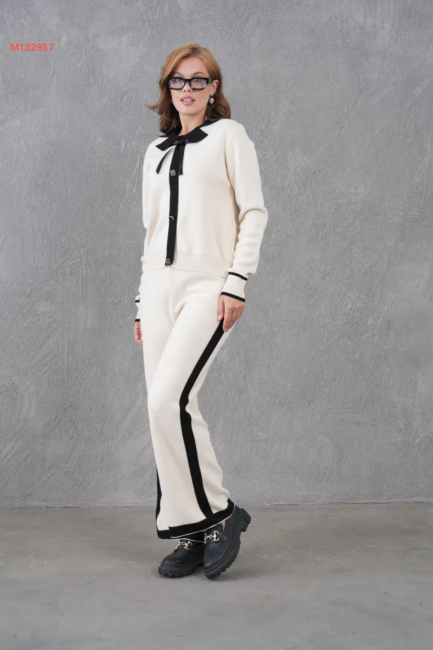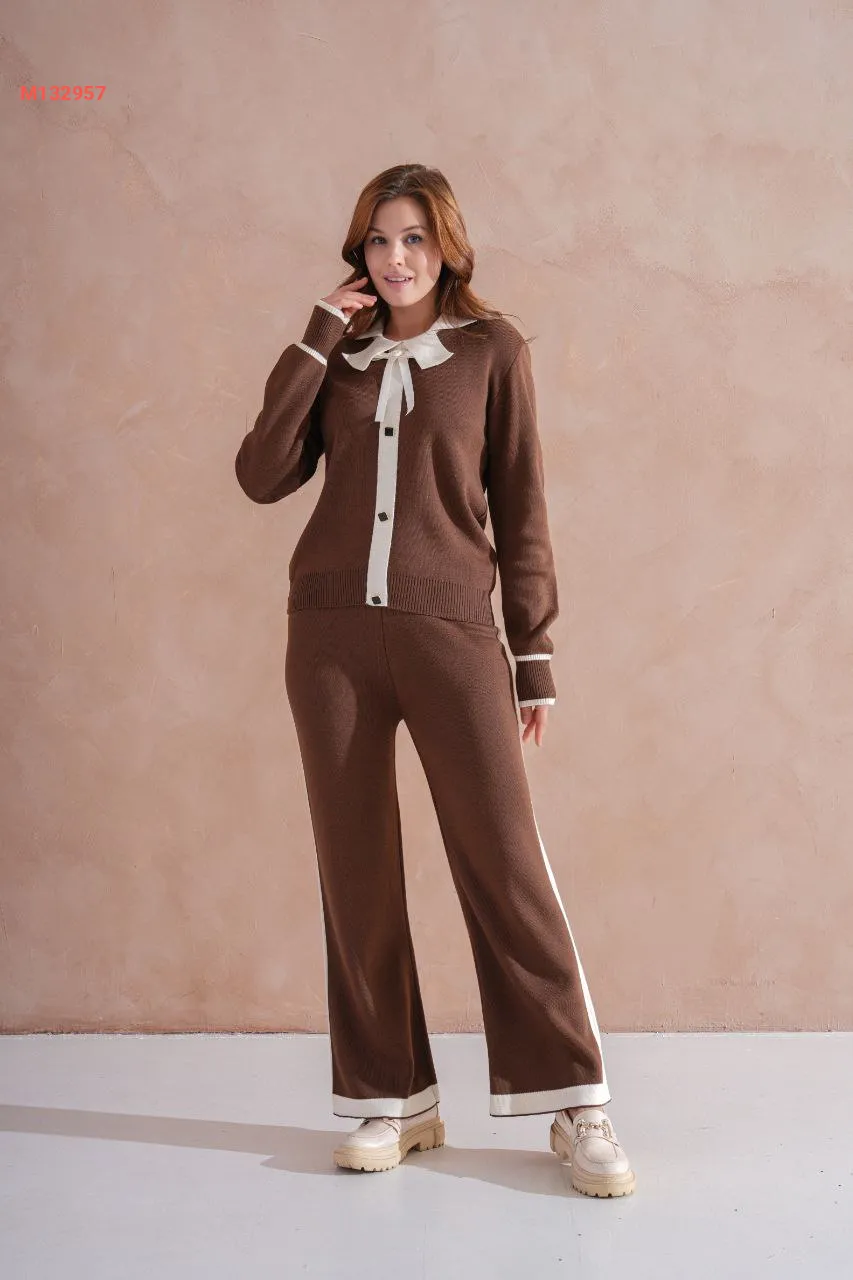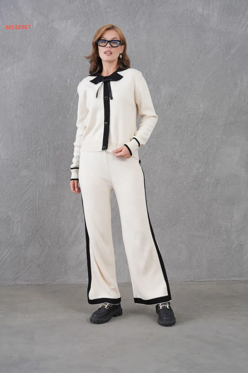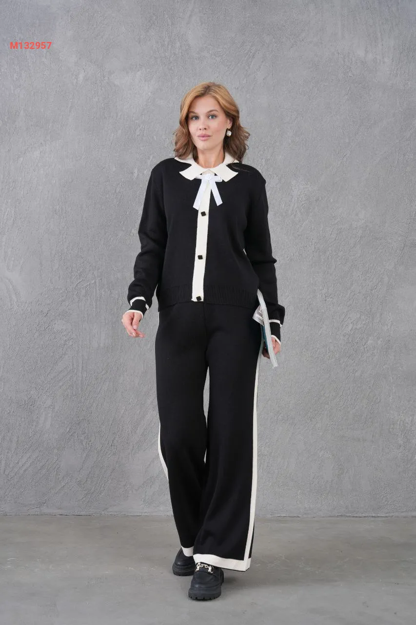 طقم تريكو ازرار على الكنزة وببيونة على الياقة