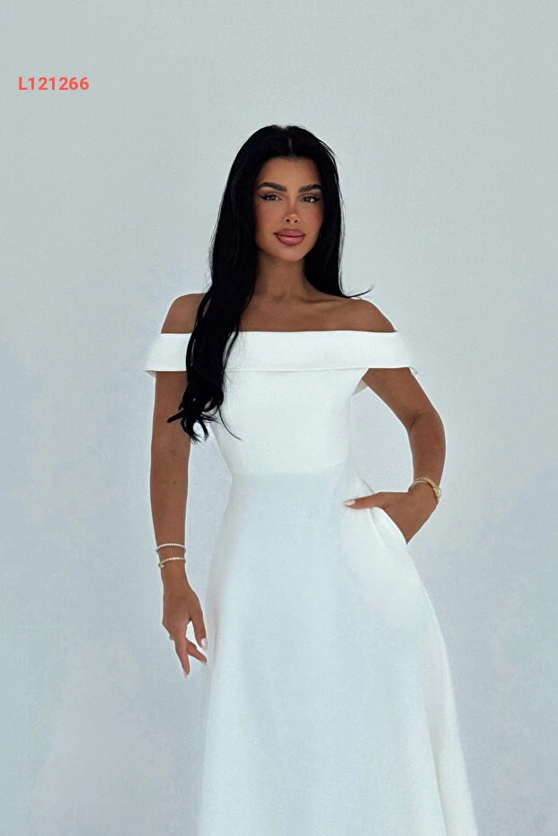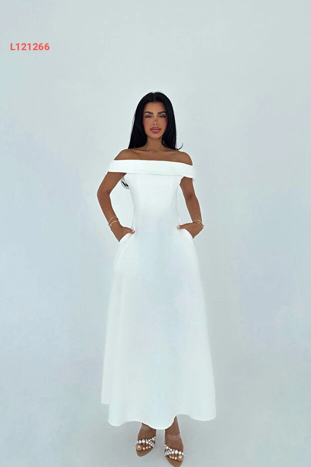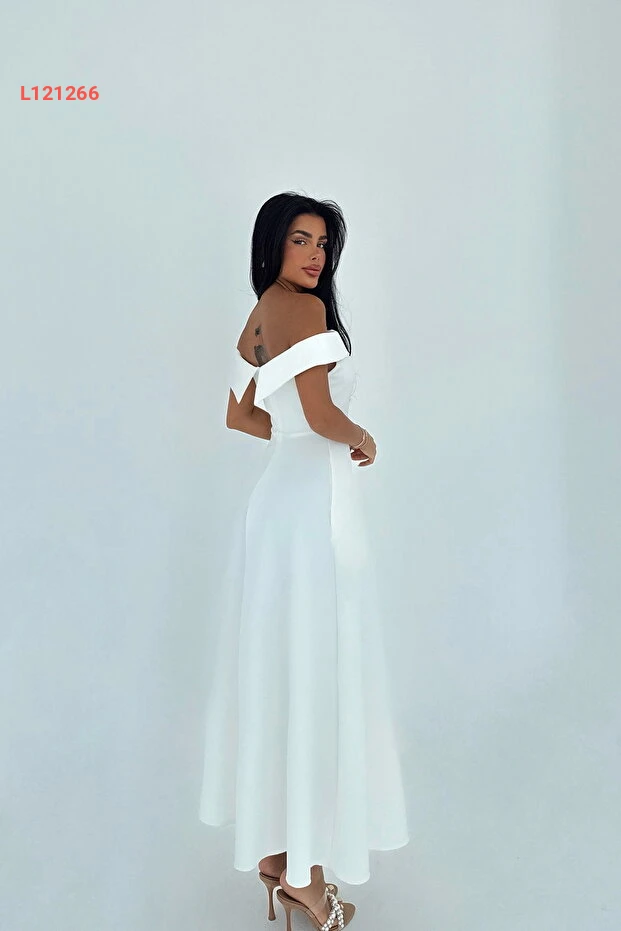 فستان طويل كريب أبيض بتصميم أكتاف مزدوجة من تانيسا TNS-4422