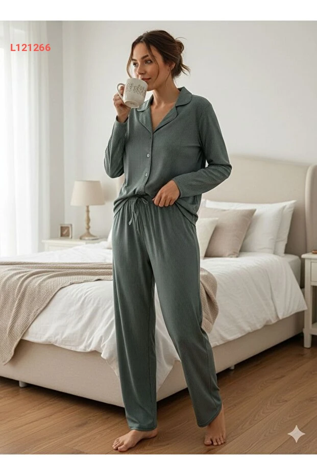 استمتع بإطلالة أنيقة ومريحة في المنزل مع طقم بيجامة "TAWBE" باللون الأخضر الفاتح ذو الخطوط. التصميم المزود بالأزرار يضيف لمسة عصرية، بينما يوفر القماش الناعم الراحة المثالية طوال اليوم. اجعل لحظات الاسترخاء لديك أكثر تميزاً مع هذا الطقم المثالي لجميع أوقات الفراغ.