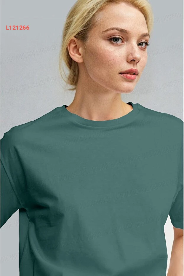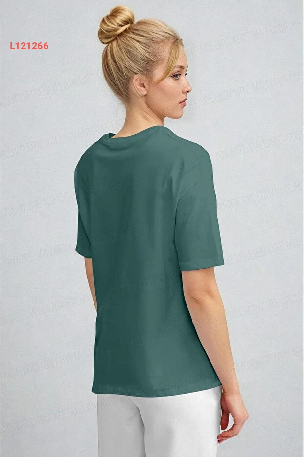 تيشيرت الأساسية بنمط منتظم بياقة دائرية - أخضر بترولي للنساء