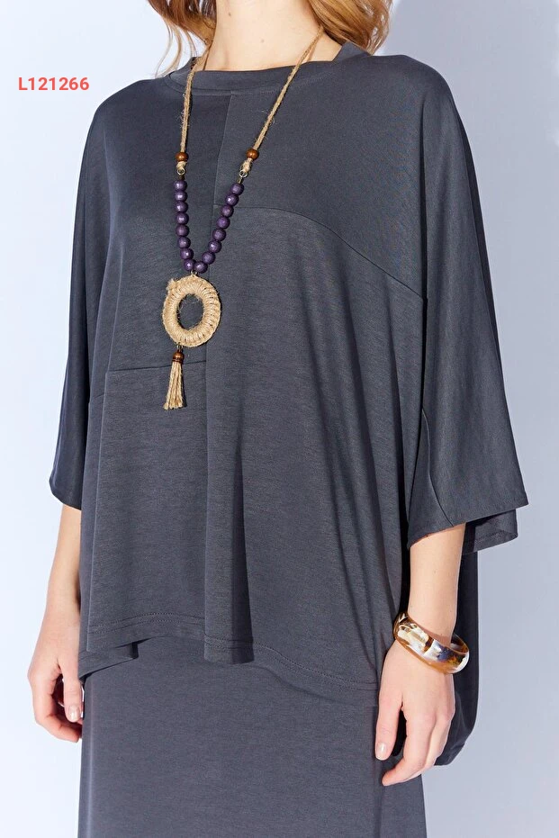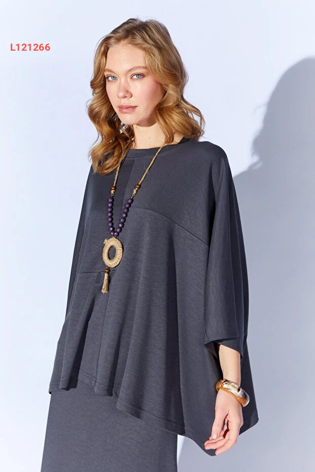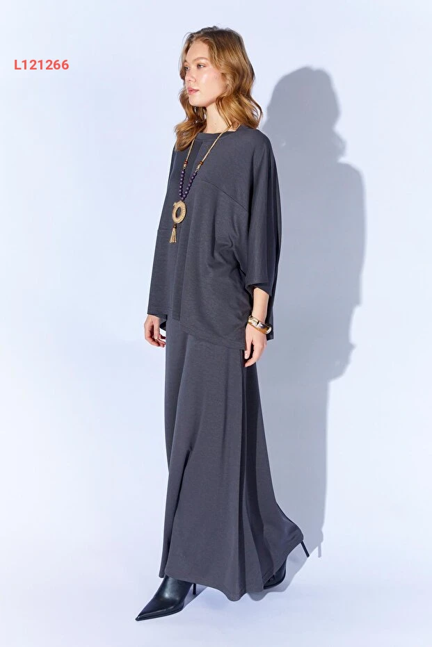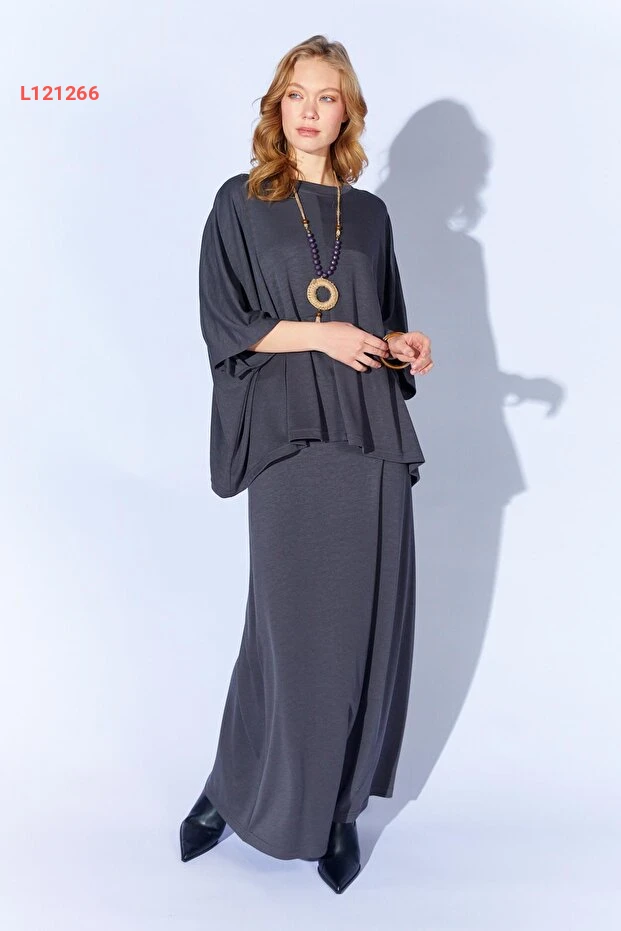 استمتعي بأناقة لا مثيل لها مع طقم "Tena Kadın Antrasit 172"، الذي يجمع بين بلوزة ذات أكمام قصيرة وتنورة طويلة من قماش المودال الفاخر. تصميمه العصري بلون الأنتراسيت الدافئ يضمن لكِ مظهراً أنيقاً ومريحاً في كل المناسبات، بينما توفر جودة الخامات شعوراً ناعماً وأناقة دائمة. اجعلي هذا الطقم جزءاً من خزانتك المميزة!