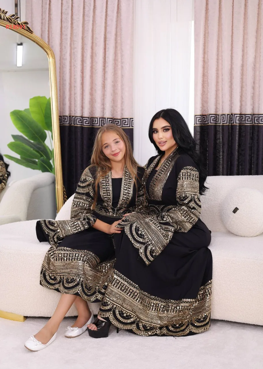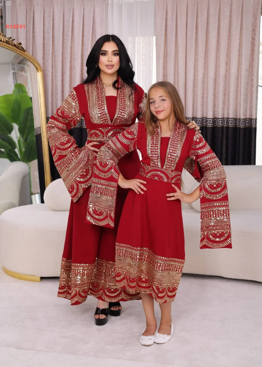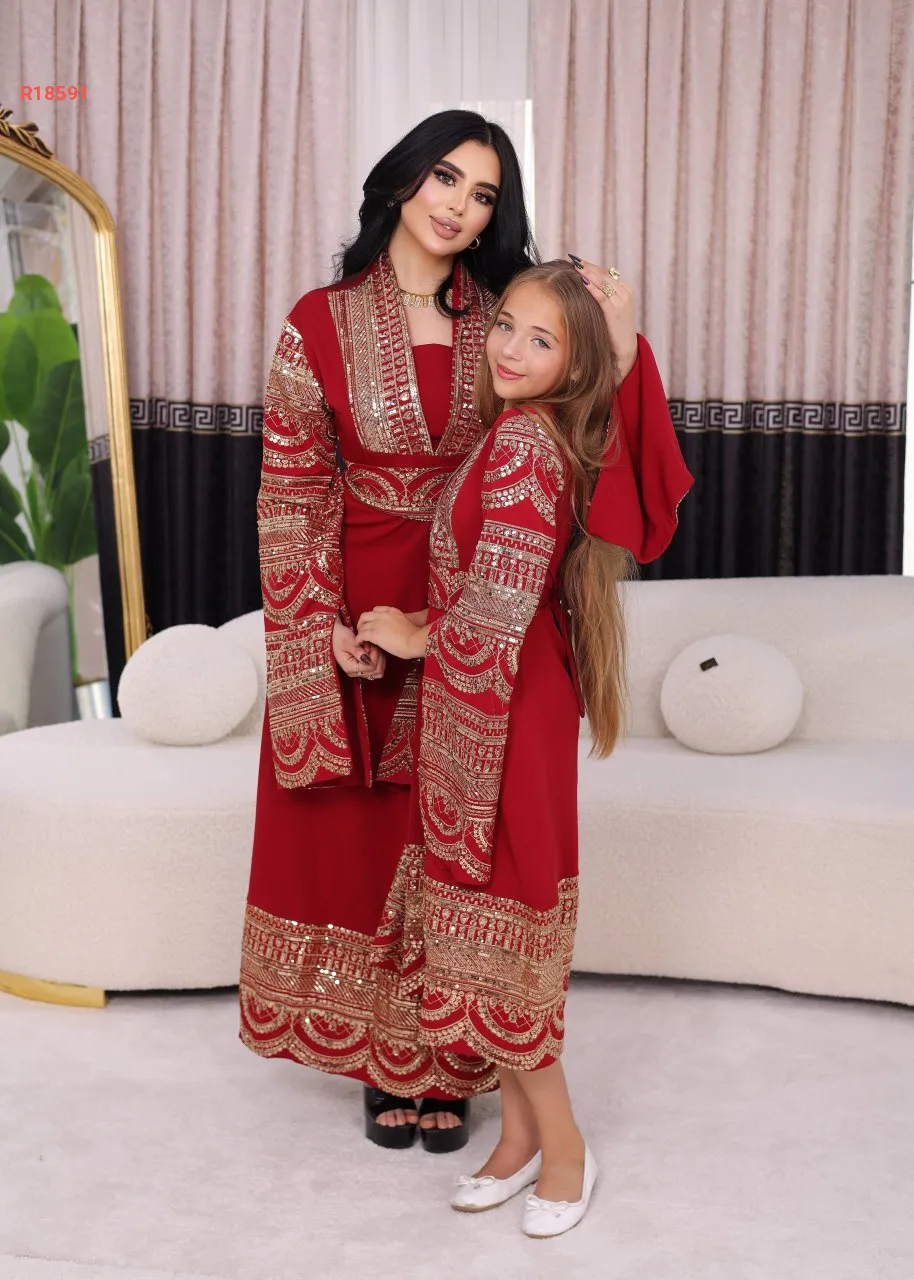 قفطان الام والبنت، بأكمام نصف فتحة ، مطرز مع شك البرق